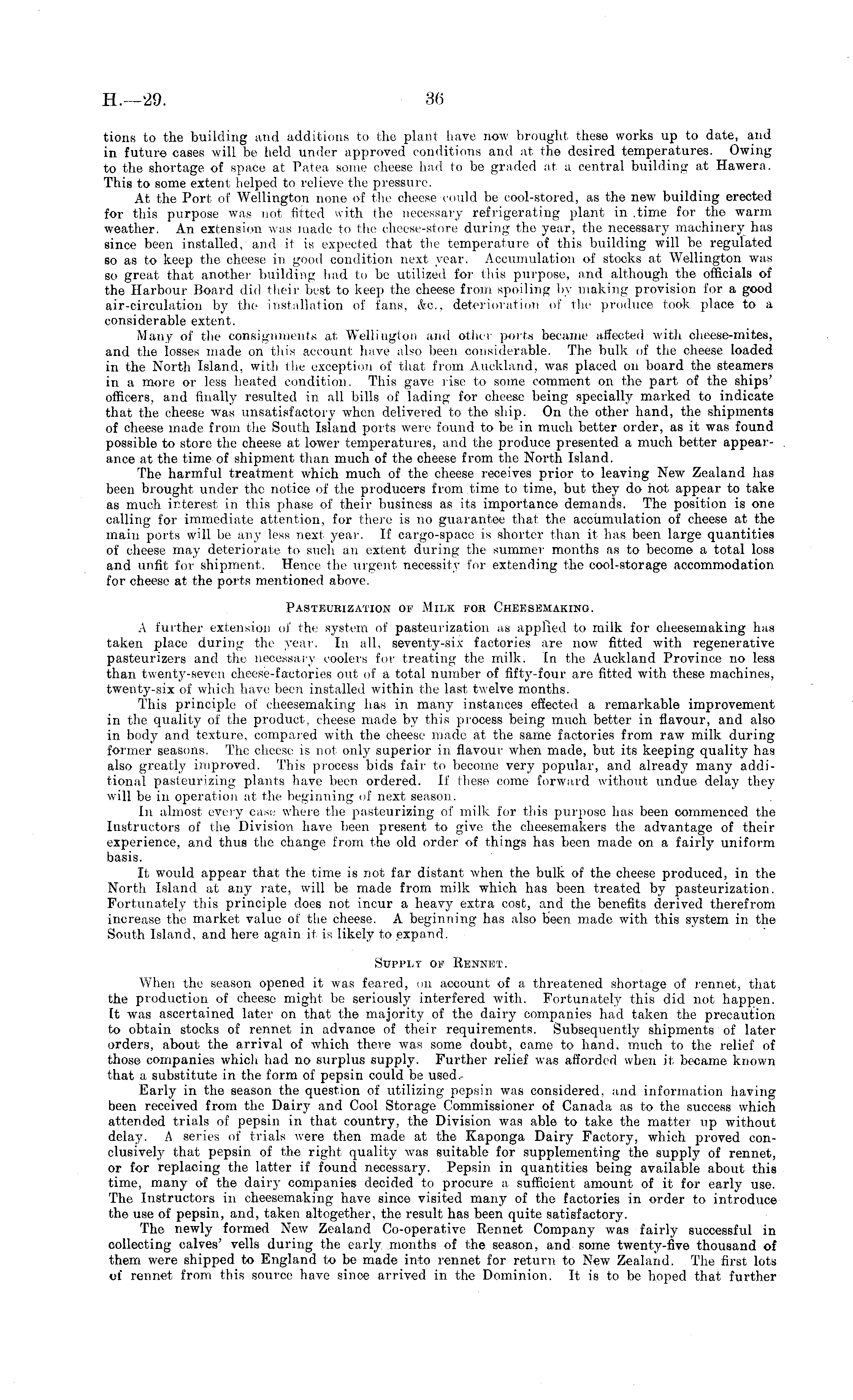 tions to the building and additions to the plant have now brought these works up to date, and in future cases will be held under approved conditions and at the desired temperatures. Owing to the shortage of space at Patea some cheese had to be graded at a central building at Hawera. This to some extent helped to relieve the pressure. At the Port of Wellington none of the cheese could be cool-stored, as the new building erected for this purpose was not fitted with the necessary refrigerating plant in .time for the warm weather. An extension was made to the cheese-store during the year, the necessary machinery has since been installed, and it is expected that the temperature of this building will be regulated so as to keep the cheese in good condition next year. Accumulation of stocks at Wellington was so great that another building had to be utilized for this purpose, and although the officials of the Harbour Board did their best to keep the cheese from spoiling by making provision for a good air-circulation by the installation of fans, &c, deterioration of the produce took place to a considerable extent. Many of the consignments at. Wellington and other ports became affected with cheese-mites, and the losses made on this account have also been considerable. The bulk of the cheese loaded in the North Island, with the exception of that from Auckland, was placed on board the steamers in a more or less heated condition. This gave rise to some comment on the part of the ships' officers, and finally resulted in all bills of lading for cheese being specially marked to indicate that the cheese was unsatisfactory when delivered to the ship. On the other hand, the shipments of cheese made from the South Island ports were found to be in much better order, as it was found possible to store the cheese at lower temperatures, and the produce presented a much better appearance at the time of shipment than much of the cheese from the North Island. The harmful treatment which much of the cheese receives prior to leaving New Zealand has been brought under the notice of the producers from time to time, but they do not appear to take as much interest in this phase of their business as its importance demands. The position is one calling for immediate attention, for there is no guarantee that, the accumulation of cheese at the main ports will be any less next year. If cargo-space is shorter than it has been large quantities of cheese may deteriorate to such an extent during the summer months as to become a total loss and unfit for' shipment. Hence the urgent necessity for extending the cool-storage accommodation for cheese at the ports mentioned above. Pasteurization of Milk for Cheesemaking. A further extension of the system of pasteurization as applied to milk for cheesemaking has taken place during the year. In all, seventy-six factories are now fitted with regenerative pasteurizers and the necessary coolers for treating the milk. In the Auckland Province no less than twenty-seven cheese-factories out of a total number of fifty-four are fitted with these machines, twenty-six of which have been installed within the last twelve months. This principle of cheesemaking lias in many instances effected a remarkable improvement in the quality of the product, cheese made by this process being much better in flavour, and also in body and texture, compared with the cheese made at the same factories from raw milk during former seasons. The cheese is not only superior in flavour when made, but its keeping quality has also greatly improved. This process bids fair to become very popular, and already many additional pasteurizing plants have been, ordered. If these come forward without undue delay they will be in operation at the beginning of next season. In almost every case where the pasteurizing of milk for this purpose has been commenced the Instructors of the Division have been present to give the cheesemakers the advantage of their experience, and thus the change from the old order of things has been made on a fairly uniform basis. It would appear that the time is not far distant when the bulk of the cheese produced, in the North Island at any rate, will be made from milk which has been treated by pasteurization. Fortunately this principle does not incur a heavy extra cost, and the benefits derived therefrom increase the market value of the cheese. A beginning has also been made with this system in the South Island, and here again it is likely to expand. Supply of Rennet. When the season opened it was feared, on account of a threatened shortage of rennet, that the production of cheese might be seriously interfered with. Fortunately this did not happen. It was ascertained later on that the majority of the dairy companies had taken the precaution to obtain stocks of rennet in advance of their requirements. Subsequently shipments of later orders, about the arrival of which there was some doubt, came to hand, much to the relief of those companies which had no surplus supply. Further relief was afforded when it became known that a substitute in the form of pepsin could be used.Early in the season the question of utilizing pepsin was considered, and information having been received from the Dairy and Cool Storage Commissioner of Canada as to the success which attended trials of pepsin in that country, the Division was able to take the matter up without delay. A series of trials were then made at the Kaponga Dairy Factory, which proved conclusively that pepsin of the right quality was suitable for supplementing the supply of rennet, or for replacing the latter if found necessary. Pepsin in quantities being available about this time, many of the dairy companies decided to procure a, sufficient amount of it for early use. The Instructors in cheesemaking have since visited many of the factories in order to introduce the use of pepsin, and, taken altogether, the result has been quite satisfactory. The newly formed New Zealand Co