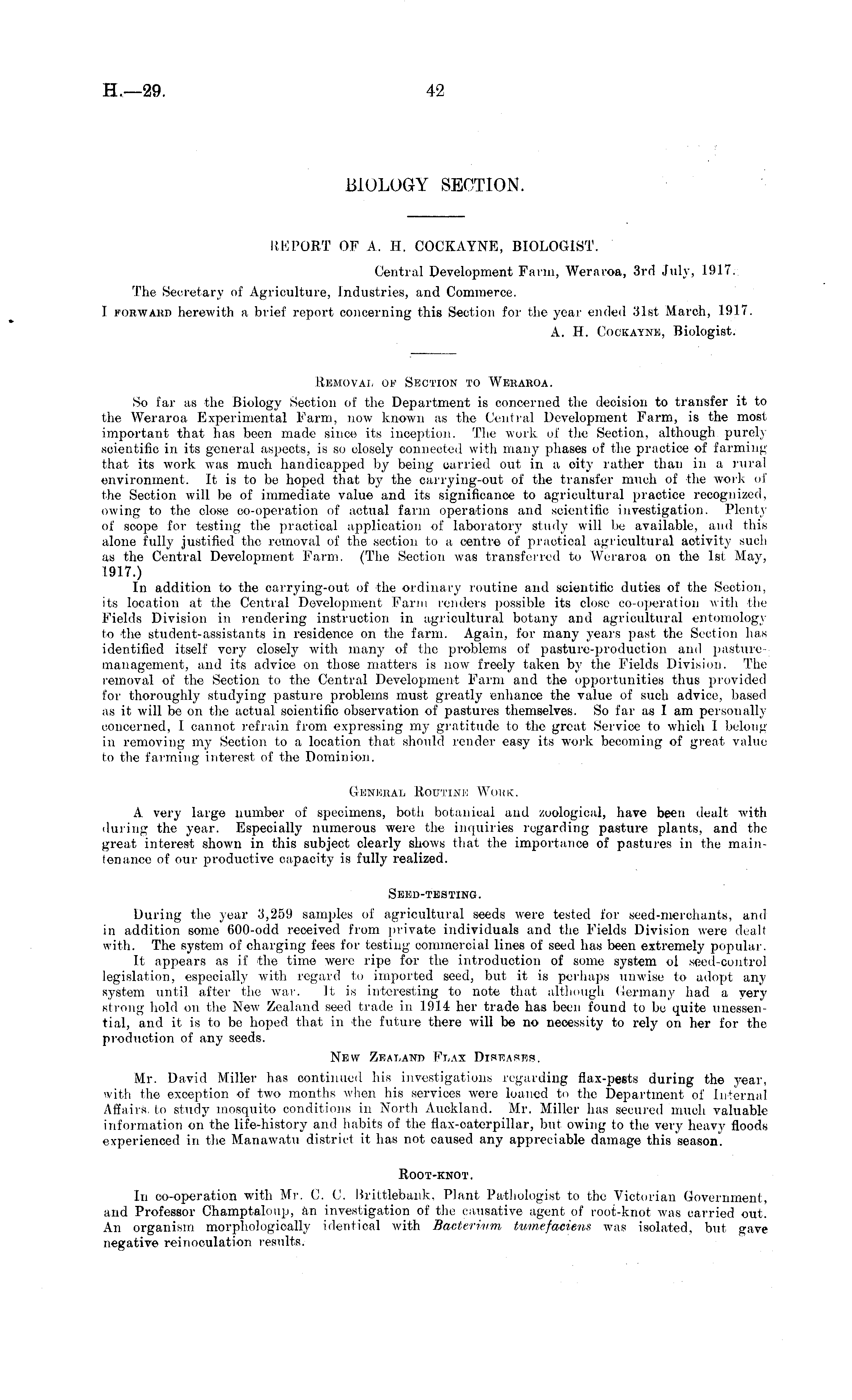 BIOLOGY SECTION. REPORT OF A. H. COCKAYNE, BIOLOGIST. Central Development Farm, Weraroa, 3rd July, 1917. The Secretary of Agriculture, Industries, and Commerce. I forward herewith a brief report concerning this Section for the year ended 31st March, 1917. A. H. Cockayne, Biologist. Removal of Section to Weraroa. So far as the Biology Section of the Department is concerned the decision to transfer it to the Weraroa Experimental Farm, now known as the Central Development Farm, is the most important that has been made since its inception. The work of the Section, although purely scientific in its general aspects, is so closely connected with many phases of the practice of farming that its work was much handicapped by being carried out in a city rather than in a rural environment. It is to be hoped that by the carrying-out of the transfer much of the work of the Section will be of immediate value and its significance to agricultural practice recognized, owing to the close co-operation of actual farm operations and scientific investigation. Plenty of scope for testing the practical application of laboratory study will be available, and this alone fully justified the removal of the section to a centre of practical agricultural activity such as the Central Development Farm. (The Section was transferred to Weraroa on the Ist May, 1917.) In addition to the carrying-out of the ordinary routine and scientific duties of the Section, its location at the Central Development Farm renders possible its close co-operation with the Fields Division in rendering instruction in agricultural botany and agricultural entomology to the student-assistants in residence on the farm. Again, for many years past the Section has identified itself very closely with many of the problems of pasture-production and pasturemanagement, and its advice on those matters is now freely taken by the Fields Division. The removal of the Section to the Central Development Farm and the opportunities thus provided for thoroughly studying pasture problems must greatly enhance the value of such advice, based as it will be on the actual scientific observation of pastures themselves. So far as lam personally concerned, I cannot refrain from expressing my gratitude to the great Service to which I belong in removing my Section to a location that should render easy its work becoming of great value to the farming interest of the Dominion. General Routine Work. A very large number of specimens, both botanical and zoological, have been dealt with during the year. Especially numerous were the inquiries regarding pasture plants, and the great interest shown in this subject clearly shows that the importance of pastures in the maintenance of our productive capacity is fully realized. Seed-testing. During the year 3,259 samples of agricultural seeds were tested for seed-merchants, and in addition some 600-odd received from private individuals and the Fields Division were dealt with. The system of charging fees for testing commercial lines of seed has been extremely popular. It appears as if the time were ripe for the introduction of some system ol seed-control legislation, especially with regard to imported seed, but it is perhaps unwise to adopt any system until after the war. It is interesting to note that although Germany had a very strong hold on the New Zealand seed trade in 1914 her trade has been found to be quite unessential, and it is to be hoped that in the future there will be no necessity to rely on her for the production of any seeds. New Zealand Flax Diseases. Mr. David Miller has continued his investigations regarding flax-pests during the year, with the exception of two months when his services were loaned to the Department of Internal Affairs, to study mosquito conditions in North Auckland. Mr. Miller has secured much valuable information on the life-history and habits of the flax-oatcrpillar, but owing to the very heavy floods experienced in the Manawatu district it has not caused any appreciable damage this season. Root-knot. In co-operation with Mr. C. C. Briltlebank, Plant Pathologist to the Victorian Government, and Professor Champtaloup, an investigation of the causative agent of root-knot was carried out. An organism morphologically identical with Bacterium tumefaciens was isolated, but gave negative reinooulation results.