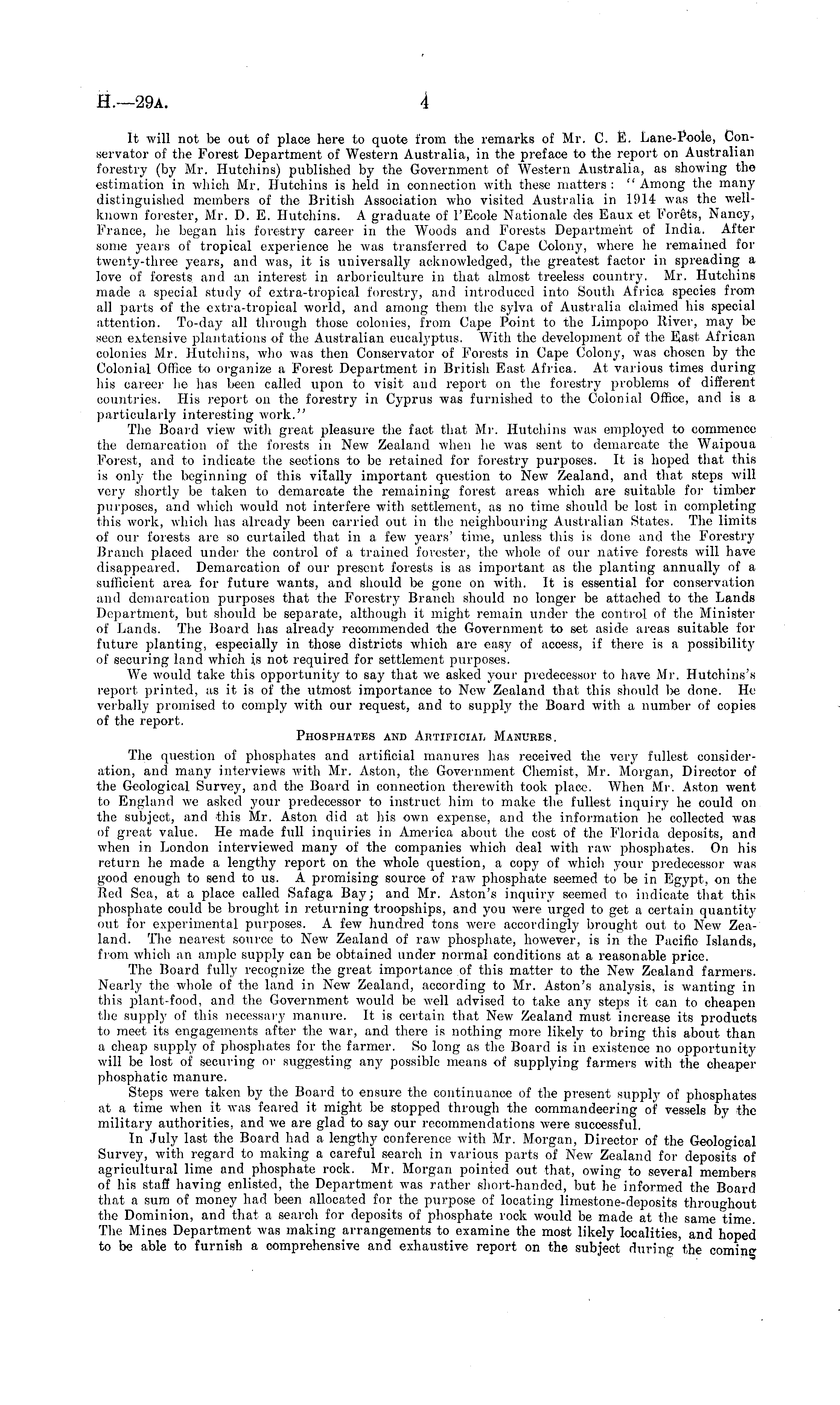 It will not be out of place here to quote from the remarks of Mr. C. E. Lane-Poole, Conservator of the Forest Department of Western Australia, in the preface to the report on Australian forestry (by Mr. Hutchins) published by the Government of Western Australia, as showing tho estimation in which Mr. Hutchins is held in connection with these matters: "Among the many distinguished members of the British Association who visited Australia in 1914 was the wellknown forester, Mr. D. E. Hutchins. A graduate of l'Ecole Nationale des Eaux et Forets, Nancy, France, lie began his forestry career in the Woods and Forests Department of India. After some years of tropical experience he was transferred to Cape Colony, where he remained for twenty-three years, and was, it is universally acknowledged, the greatest factor in spreading a love of forests and an interest, in arboriculture in that almost treeless country. Mr. Hutchins made a special study of extra-tropical forestry, and introduced into South Africa species from all parts of the extra-tropical world, and among them the sylva of Australia claimed his special attention. To-day all through those colonies, from Cape Point to the Limpopo River, may be seen extensive plantations of the Australian eucalyptus. With the development of the East African colonies Mr. Hutchins, who was then Conservator of Forests in Cape Colony, was chosen by the Colonial Office to organize a Forest Department in British East Africa. At various times during his career he has been called upon to visit and report on the forestry problems of different countries. His report on the forestry in Cyprus was furnished to the Colonial Office, and is a particularly interesting work." The Board view with great pleasure the fact that Mr. Hutchins was employed to commence the demarcation of the forests in New Zealand when he was sent to demarcate the Waipoua Forest, and to indicate the sections to be retained for forestry purposes. It is hoped that this is only the beginning of this vitally important question to New Zealand, and that steps will very shortly be taken to demarcate the remaining forest areas which are suitable for timber purposes, and which would not interfere with settlement, as no time should be lost in completing this work, which has already been carried out in the neighbouring Australian States. The limits of our forests are so curtailed that in a few years' time, unless this is done and the Forestry Branch placed under the control of a trained forester, the whole of our native forests will have disappeared. Demarcation of our present forests is as important as the planting annually of a sufficient area for future wants, and should be gone on with. It is essential for conservation and demarcation purposes that the Forestry Branch should no longer be attached to the Lands Department, but should be separate, although it might remain under the control of the Minister of Lands. The Board has already recommended the Government to set aside areas suitable for future planting, especially in those districts which are easy of access, if there is a possibility of securing land which is not required for settlement purposes. We would take this opportunity to say that we asked your predecessor to have Mr. Hutchins's report printed, as it is of the utmost importance to New Zealand that this should be done. He verbally promised to comply with our request, and to supply the Board with a number of copies of the report. Phosphates and Artificial Manures. The question of phosphates and artificial manures has received the very fullest consideration, and many interviews with Mr. Aston, the Government Chemist, Mr. Morgan, Director of the Geological Survey, and the Board in connection therewith took place. When Mr. Aston went to England we asked your predecessor to instruct him to make the fullest inquiry he could on the subject, and this Mr. Aston did at his own expense, and the information he collected was of great value. He made full inquiries in America about the cost of the Florida deposits, and when in London interviewed many of the companies which deal with raw phosphates. On his return he made a lengthy report on the whole question, a copy of which your predecessor was good enough to send to us. A promising source of raw phosphate seemed to be in Egypt, on the Red Sea, at a place called Safaga Bay; and Mr. Aston's inquiry seemed to indicate that this phosphate could be brought in returning troopships, and you were urged to get a certain quantity out for experimental purposes. A few hundred tons were accordingly brought out to New Zealand. The nearest source to New Zealand of raw phosphate, however, is in the Pacific Islands, from which an ample supply can be obtained under normal conditions at a reasonable price. The Board fully recognize the great importance of this matter to the New Zealand farmers. Nearly the whole of the land in New Zealand, according to Mr. Aston's analysis, is wanting in this plant-food, and the Government would be well advised to take any steps it can to cheapen the supply of this necessary manure. It is certain that New Zealand must increase its products to meet its engagements after the war, and there is nothing more likely to bring this about than a cheap supply of phosphates for the farmer. So long as the Board is in existence no opportunity will be lost of securing or suggesting any possible means of supplying farmers with the cheaper phosphatic manure. Steps were taken by the Board to ensure the continuance of the present supply of phosphates at a time when it was feared it might be stopped through the commandeering of vessels by the military authorities, and we are glad to say our recommendations were successful. In July last the Board had a lengthy conference with Mr. Morgan, Director of the Geological Survey, with regard to making a careful search in various parts of New Zealand for deposits of agricultural lime and phosphate rock. Mr. Morgan pointed