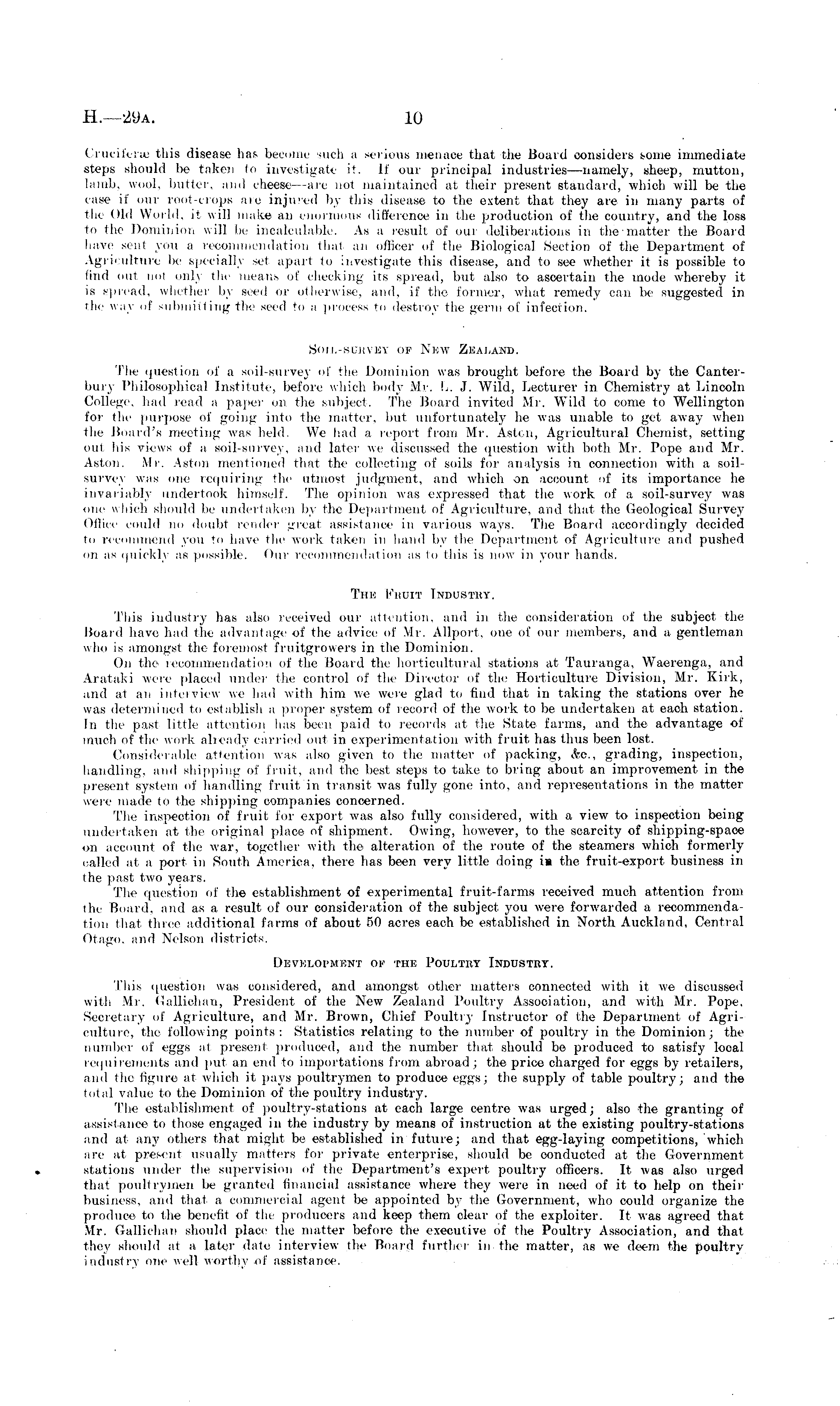 Cruciferse this disease has become such a serious menace that the Board considers some immediate steps should be taken to investigate it. If our principal industries —namely, sheep, mutton, lamb, wool, butter, and cheese —arc not maintained at their present standard, which will be the case if our root-crops are injured by this disease to the extent that they are in many parts of the Old World, it will make an enormous difference in the production of the country, and the loss to the Dominion will be incalculable. As a result of our deliberations in the matter the Board have sent you a recommendation that an officer of the Biological Section of the Department of Agriculture be specially set apart to investigate this disease, and to see whether it is possible to find out not only the means of checking its spread, but also to ascertain the mode whereby it is spread, whether by seed or otherwise, and, if the former, what remedy can be suggested in the way of submitting the seed to a process tn destroy the germ of infection. Son.-survey of New Zealand. The question of a soil-survey of the Dominion was brought before the Board by the Canterbury Philosophical Institute, before which body Mr. L. J. Wild, Lecturer in Chemistry at Lincoln College, had read a paper on the subject. The Board invited Mr. Wild to come to Wellington for the purpose of going into the matter, but unfortunately he was unable to get away when the Board's meeting was held. We had a report from Mr. Aston, Agricultural Chemist, setting out his views of a soil-survey, and later we discussed the question with both Mr. Pope and Mr. Aston. Mr. Aston mentioned that the collecting of soils for analysis in connection with a soilsurvey was one requiring the utmost judgment, and which on account of its importance he invariably undertook himself. The opinion was expressed that the work of a soil-survey was one which should be undertaken by the Department of Agriculture, and that the Geological Survey Office could no doubt render great assistance in various ways. The Board accordingly decided to recommend you to have the work taken in hand by the Department of Agriculture and pushed on as quickly as possible. Our recommendation ;is to this is now in your hands. r The Fruit Industry. This industry has also received our attention, and in the consideration of the subject the Board have had the advantage of the advice of Mr. Allport, one of our members, and a gentleman who is amongst the foremost fruitgrowers in the Dominion. On the recommendation of the Board the horticultural stations at Tauranga, Waerenga, and Arataki were placed under the control of the Director of the Horticulture Division, Mr. Kirk, and at an interview we had with him we were glad to find that in taking the stations over he was determined to establish a proper system of record of the work to be undertaken at each station. In the past little attention has been paid to records at the State farms, and the advantage of much of the work already carried out in experimentation with fruit has thus been lost. Considerable attention was also given to the matter of packing, &0., grading, inspection, handling, and shipping of fruit, and the best steps to take to bring about an improvement in the present system of handling fruit in transit was fully gone into, and representations in the matter were made to the shipping companies concerned. The inspection of fruit for export was also fully considered, with a view to inspection being undertaken at the original place of shipment. Owing, however, to the scarcity of shipping-space on account of the war, together with the alteration of the route of the steamers which formerly called at a port in South America, there has been very little doing im the fruit-export business in the past two years. The question of the establishment of experimental fruit-farms received much attention from the Board, and as a result of our consideration of the subject you were forwarded a recommendation that three additional farms of about 50 acres each be established in North Auckland, Central Otago. and Nelson districts. Development of the Poultry Industry. This question was considered, and amongst other matters connected with it we discussed with Mr. Gallichan, President of the New Zealand Poultry Association, and with Mr. Pope. Secretary of Agriculture, and Mr. Brown, Chief Poultry Instructor of the Department of Agriculture, the following points: Statistics relating to the number of poultry in the Dominion; the number of eggs at present produced, and the number that should be produced to satisfy local requirements and put, an end to importations from abroad ; the price charged for eggs by retailers, and the figure at which it pays poultrymen to produce eggs; the supply of table poultry; and the total value to the Dominion of the poultry industry. The establishment of poultry-stations at each large centre was urged; also the granting of assistance to those engaged in the industry by means of instruction at the existing poultry-stations and at any others that might be established in future; and that egg-laying competitions, which are at present usually matters for private enterprise, should be conducted at the Government • stations under the supervision of the Department's expert poultry officers. It was also urged that poultrymen be granted financial assistance where they were in need of it to help on their business, and that a commercial agent be appointed by the Government, who could organize the produce to the benefit of the producers and keep them clear of the exploiter. It was agreed that Mr. Gallichan should place the matter before the executive of the Poultry Association, and that they should at a later date interview the Board further in the matter, as we deem the poultry industry one well worthy of assistance.