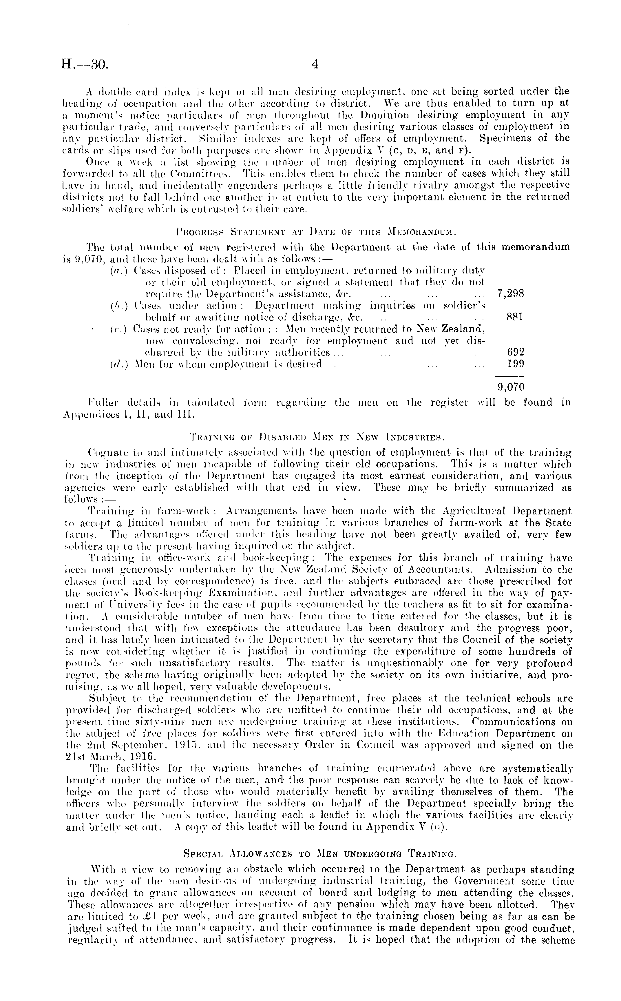 A double card index is kept of all men desiring employment, one set being sorted under the heading of occupation and the other according to district. We are thus enabled to turn up at a moment's notice particulars of men throughout the Dominion desiring employment in any particular trade, and conversely particulars of all men desiring various classes of employment in any particular district. Similar indexes are kept of offers of employment. Specimens of the cards or slips used for both purposes are shown in Appendix V (o, n, E, and f). Once a week a list showing the number of men desiring employment in each district is forwarded to all the Committees. This enables them to check the number of cases which they still have in hand, and incidentally engenders perhaps a little friendly rivalry amongst the respective districts not to fall behind one another in attention to the very important element in the returned soldiers' welfare which is entrusted to their care. Progress Statement at Date of this Memorandum. The total number of men registered with the Department at the date of this memorandum is 9,070, and these have been dealt with as follows : — (a.) Cases disposed of : Placed in employment, returned to military duty or their old employment, or signed a statement that they do not require the Department's assistance, &c. ... ... ... 7,298 (b.) Cases under action : Department making inquiries on soldier's behalf or awaiting notice of discharge, &c. ... ... ... 881 (c.) Cases not ready for action : : Men recently returned to New Zealand, now convalescing, not ready for employment and not yet discharged by the military authorities... ... ... ... 692 (d.) Men for whom employment is desired ... ... ... ... 199 9,070 Fuller details in tabulated form regarding the men on the register will be found in Appendices 1, 11, and 111. Training of Disabled Men in New Industries. Cognate to and intimately associated with the question of employment is that of the training in new industries of men incapable of following their old occupations. This is a matter which from the inception qf the Department has engaged its most earnest consideration, and various agencies were early established with that end in view. These may be briefly summarized as follows Training in farm-work : Arrangements have been made with the Agricultural Department to accept a limited number of men for training in various branches of farm-work at the State farms. The advantages offered under this heading have not been greatly availed of, very few soldiers up to the present having inquired on the subject. Training in office-work and book-keeping : The expenses for this branch of training have been most generously undertaken by the New Zealand Society of Accountants. Admission to the classes (oral and by correspondence) is free, and the subjects embraced are those prescribed for the society's Book-keeping Examination, and further advantages are offered in the way of payment of University fees, in the case of pupils recommended by the teachers as fit to sit for examination. A considerable number of men have from time to time entered for the classes, but it is understood that with few exceptions the attendance has been desultory and the progress poor, and it has lately been intimated to the Department by the secretary that the Council of the society is now considering whether it is justified in continuing the expenditure of some hundreds of pounds for such unsatisfactory results. The matter is unquestionably one for very profound regret, the scheme having originally been adopted by the society on its own initiative, and promising, as we all hoped, very valuable developments. Subject to the recommendation of the Department, free places at the technical schools are provided for discharged soldiers who are unfitted to continue their old occupations, and at the present time sixty-nine men are undergoing training at these institutions. Communications on the subject of free places for soldiers were first entered into with the Education Department on the 2nd September, 1915, and the necessary Order in Council was approved and signed on the 21st March, 1916. The facilities for the various branches of training enumerated above are systematically brought under the notice of the men, and the poor response can scarcely be due to lack of knowledge on the part of those who would materially benefit by availing themselves of them. The officers who personally interview the soldiers on behalf of the Department specially bring the matter under the men's notice, handing each a leaflet in which the various facilities are clearly and briefly set out. A copy of this leaflet will be found in Appendix V (g). Special Allowances to Men undergoing Training. With a view to removing an obstacle which occurred to the Department as perhaps standing in the way of the men desirous of undergoing industrial training, the Government some time ago decided to grant allowances on account of board and lodging to men attending the classes. These allowances are altogether irrespective of any pension which may have been, allotted. They are limited to £1 per week, and are granted subject to the training chosen being as far as can be judged suited to the man's capacity, and their continuance is made dependent upon good conduct, regularity of attendance, and satisfactory progress. It is hoped that the adoption of the scheme