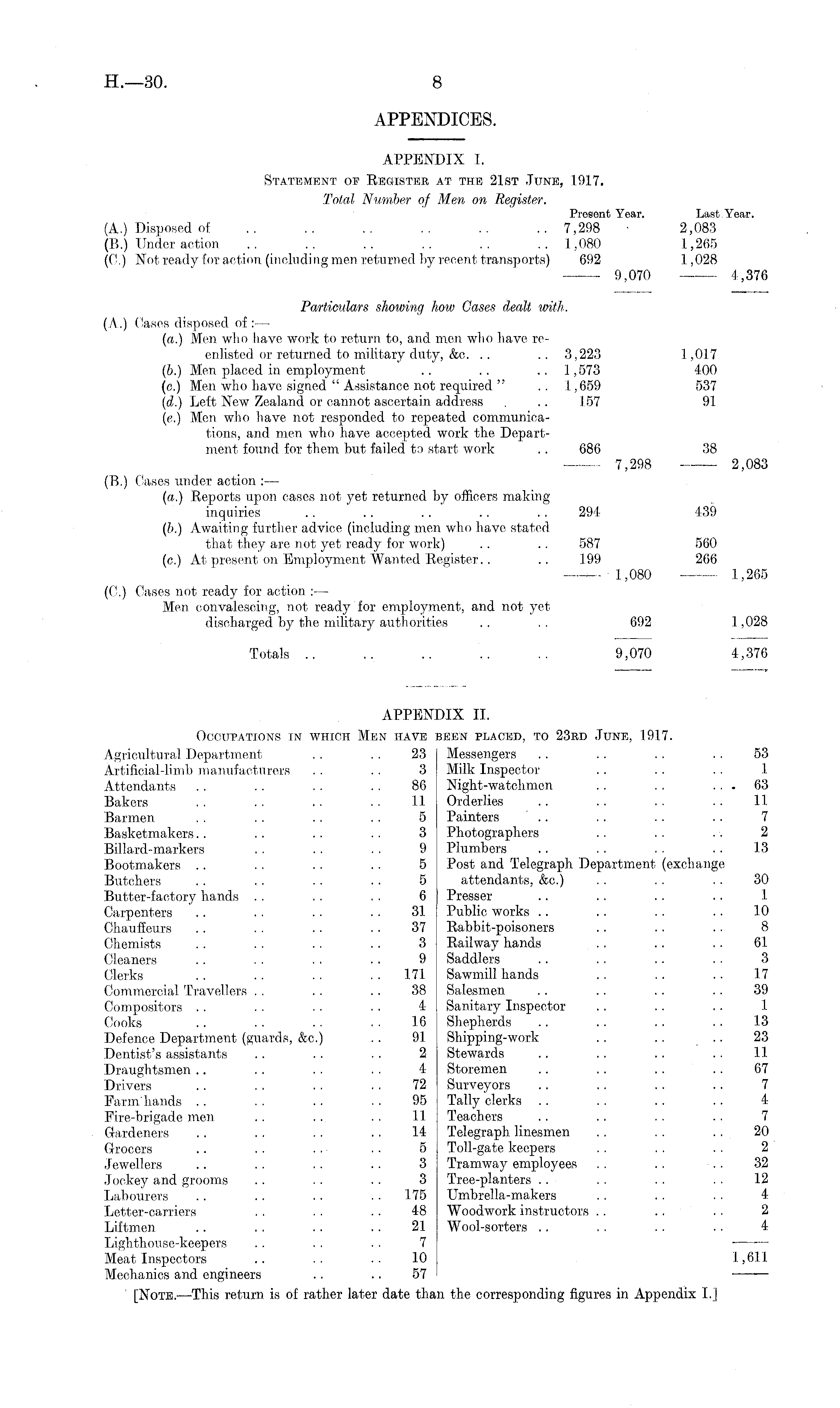 APPENDICES. APPENDIX T. Statement of Register at the 21st June, 1917. Total Number of Men on Register. Present Year. Last Yoar. (A.) Disposed of .. .. .. .. .. .. 7,298 2,083 (B.) Under action .. .. .. .. .. .. 1,080 1,205 (0.) Not ready for action, (including men returned by recent transports) 692 1,028 — 9,070 4,376 Particulars showing how Gases dealt with. (A.) Cases disposed of: — (a.) Men who have work to return to, and men who have reenlisted or returned to military duty, &c. .. .. 3,223 1,017 (b.) Men placed in employment .. .. .. 1,573 400 (c.) Men who have signed " Assistance not required " .. 1,659 537 (d.) Left New Zealand or cannot ascertain address ... 157 91 (p.) Men who have not responded to repeated communications, and men who have accepted work the Department found, for them but failed to start work .. 686 38 7,298 2,083 (B.) Cases under action : — (a.) Reports upon cases not yet returned by officers making inquiries .. .. .. .. .. 291 439 (b.) Awaiting further advice (including men who have stated that they are not yet ready for work) . . .. 587 560 (c.) At present on Employment Wanted Register. . .. 199 266 1,080 1,265 (C.) Cases not ready for action : — Men convalescing, not ready for employment, and not yet discharged by the military authorities .. .. 692 1,028 Totals .. .. .. .. .. 9,070 4,376