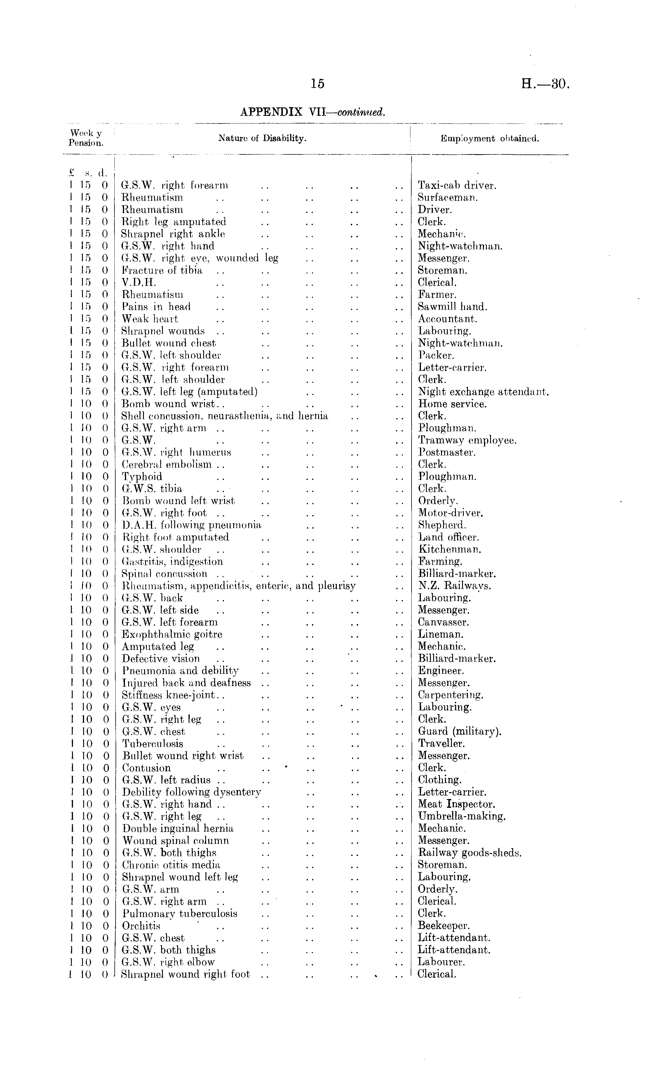 Week y Pension. Nature of Disability. Employment obtained. £ s. d. I 15 0 1 15 0 1 15 0 I 15 0 I 15 0 1 15 0 I 15 0 1 15 0 I 15 0 I 15 0 I 15 0 I 15 0 I 15 0 I 15 0 I 15 0 1 15 0 I 15 0 1 15 0 1 10 0 I 10 0 i io o I 10 0 I io o I 10 0 I 10 0 1 10 0 I 10 0 I 10 0 1 10 0 I 10 0 1 10 0 1 10 0 G.S.W. right forearm Rheumatism Rheumatism Bight leg amputated Shrapnel right ankle G.S.W. right hand G.S.W. right eye, wounded leg Fracture of tibia V.D.H. Rheumatism Pains in head Weak heart Shrapnel wounds Bullet, wound chest G.S.W. left shoulder G.S.W. right forearm G.S.W. left shoulder G.S.W. left leg (amputated) Bomb wound wrist. . Shell concussion, neurasthenia, and hernia G.S.W. right arm G.S.W. G.S.W. right humerus Cerebral embolism Typhoid O'.W.S. tibia Bomb wound left wrist G.S.W. right foot D.A.H. following pneumonia, Right foot amputated G.S.W. shoulder Gastritis, indigestion Spinal concussion . . Rheumatism, appendicitis, enteric, and pleurisy G.S.W. back G.S.W. left side G.S.W. left forearm Exophthalmic, goitre Amputated leg Defective vision Pneumonia, and debility Injured back and deafness Stiffness knee-joint. . G.S.W. eyes G.S.W. right leg . . G.S.W. chest Tuberculosis Bullet wound right wrist Contusion .. G.S.W. left radius Debility following dysentery G.S.W. right hand .'. G.S.W. right leg Double, inguinal hernia Wound spinal column G.S.W. both thighs Chronic otitis media Shrapnel wound left leg G.S.W. arm G.S.W. right arm . . Pulmonary tuberculosis Orchitis G.S.W. chest G.S.W. both thighs G.S.W. right elbow Shrapnel wound right foot . . Taxi-cab driver. Surfaceman. Driver. Clerk. Mechanic. Nigh t-watcl i man. Messenger. Storeman. Clerical. Farmer. Sawmill hand. Accountant. Labouring. Night-watchman. Packer. Letter-carrier. Clerk. Night exchange, attendant. Home service. Clerk. Ploughman. Tramway employee. Postmaster. Clerk. Ploughman. Clerk. Orderly. Motor-driver. Shepherd. Land officer. Kitchenman. Farming. Billiard-marker. N.Z. Railways. Labouring. Messenger. Canvasser. Lineman. Mechanic. Billiard-marker. Engineer. Messenger. Carpentering. Labouring. Clerk. Guard (military). Traveller. Messenger. Clerk. Clothing. Letter-carrier. Meat Inspector. Umbrella-making. Mechanic, Messenger. Railway goods-sheds. Storeman. Labouring. Orderly. Clerical. Clerk. Beekeeper. Lift-attendant. Lift-attendant. Labourer. Clerical. I 10 0 1 .10 0 1 10 0 1 10 0 I 10 0 I 10 0 I 10 0 1 10 0 1 10 0 I 10 0 I 10 0 1 10 0 1 10 0 1 10 0 I 10 0 1 10 0 I 10 0 I 10 0 1 10 0 1 10 0 1 10 0 I 10 0 1 10 0 1 10 0 I 10 0 1 10 0 1 10 0 I 10 0 1 10 0 1 10 0 1 10 0 1 10 0 1 10 0 1 10 0