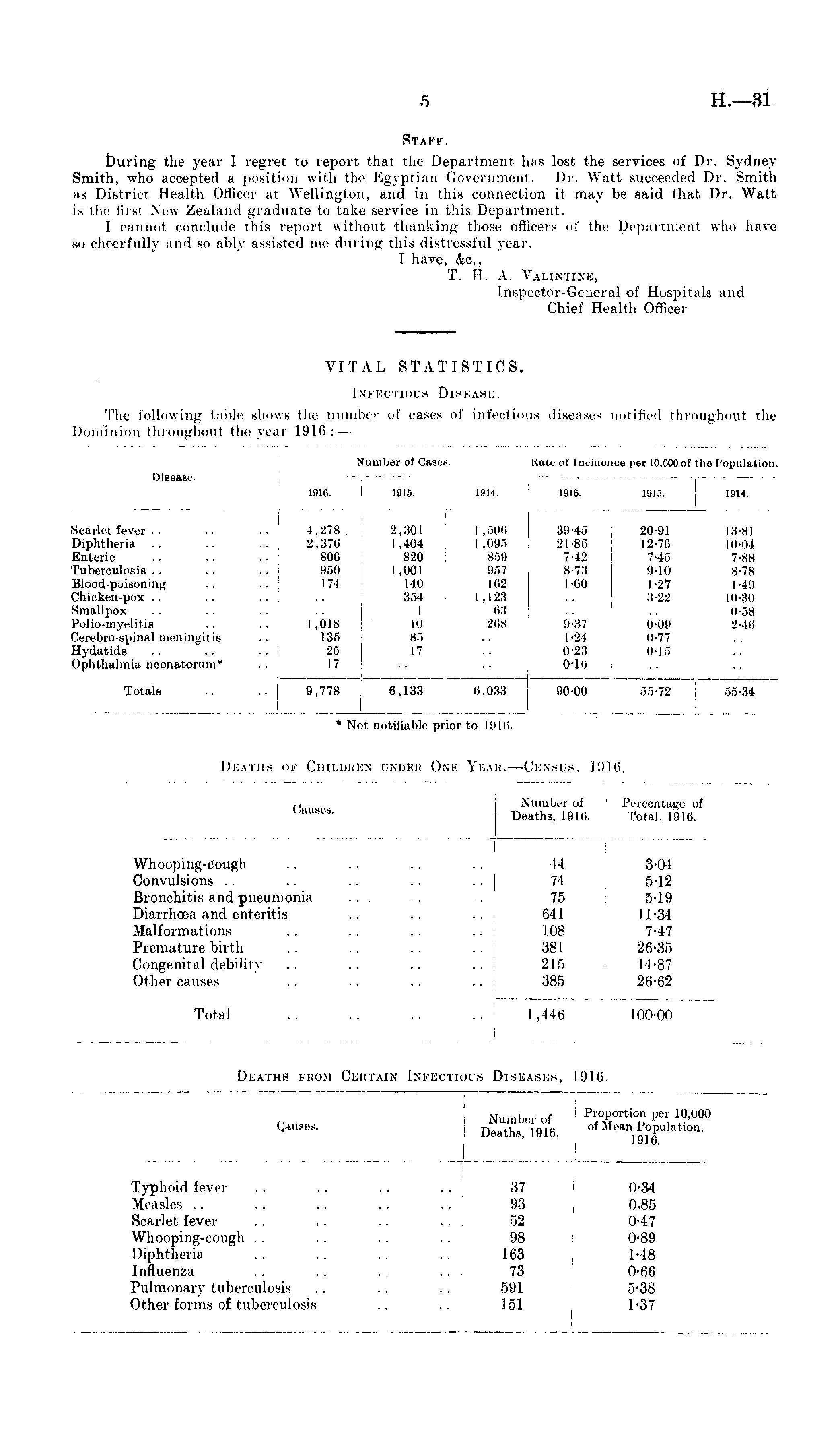 t)uring tlie year I regret to report that the Department has lost the services of Dr. Sydney Smith, who accepted a position with the Egyptian Government. Dr. Watt succeeded Dr. Smith as District Health Officer at Wellington, and in this connection it may be said that Dr. Watt is the first New Zealand graduate to take service in this Department. I cannot conclude this report without thanking those officers of the Department who have so cheerfully and so ably assisted me during this distressful year. I have, &c., T. H. A. Valintine, Inspector-General of Hospitals and Chief Health Officer