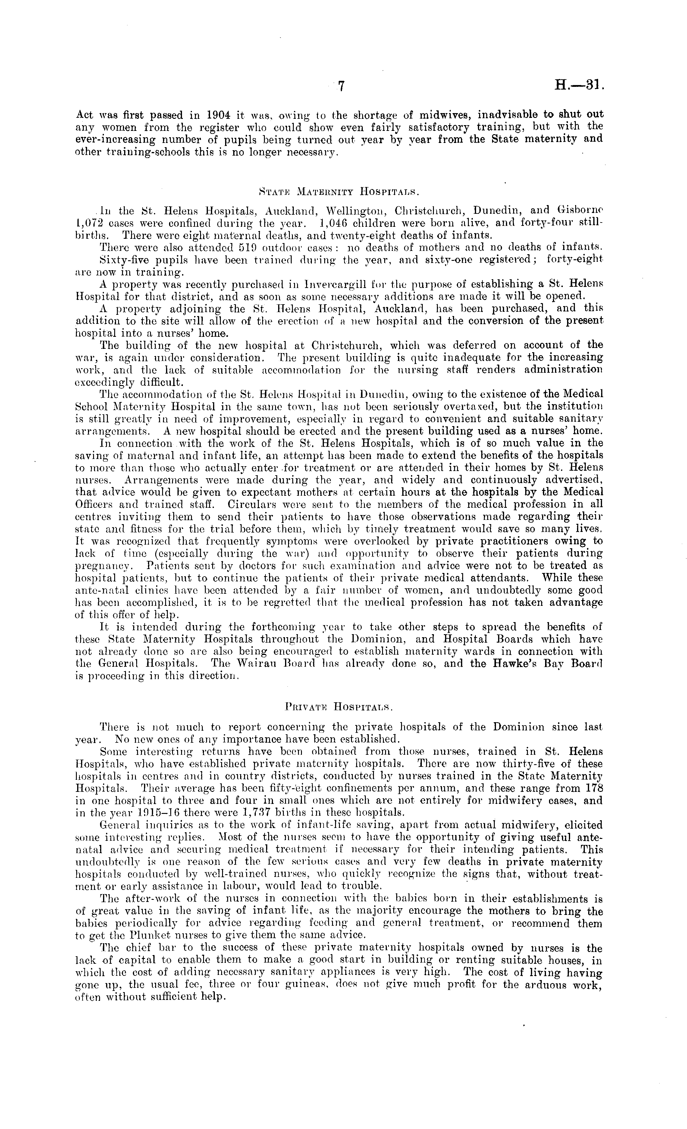 Act was first passed in 1904 it was, owing to the shortage of midwives, inadvisable to shut out any women from the register who could show even fairly satisfactory training, but with the ever-increasing number of pupils being turned out year by year from the State maternity and other training-schools this is no longer necessary. State Maternity Hospitals. In the St. Helens Hospitals, Auckland, Wellington, Christchurch, Dunedin, and Gisborne 1,072 cases were confined during the year. 1,046 children were born alive, and forty-four stillbirths. There were eight maternal deaths, and twenty-eight deaths of infants. There were also attended 519 outdoor cases : no deaths of mothers and no deaths of infants. Sixty-five pupils have been trained during the year, and sixty-one registered; forty-eight are now in training. A property was recently purchased in lnvercargill for the purpose of establishing a St. Helens Hospital for that district, and as soon as some necessary additions are made it will be opened. A property adjoining the St. Helens Hospital, Auckland, has been purchased, and this addition to the site will allow of the erection of a new hospital and the conversion of the present hospital into a nurses' home. The building of the new hospital at Christchurch, which was deferred on account of the war, is again under consideration. The present building is quite inadequate for the increasing work, and the lack of suitable accommodation for the nursing staff renders administration exceedingly difficult. The accommodation of the St, Helens Hospital in Dunedin, owing to the existence of the Medical School Maternity Hospital in the same town, has not been seriously overtaxed, but the institution is still greatly in need of improvement, especially in regard to convenient and suitable sanitary arrangements. A new hospital should be erected and the present building used as a nurses' home. In connection with the work of the St. Helens Hospitals, which is of so much value in the saving of maternal and infant life, an attempt has been made to extend the benefits of the hospitals to more than those who actually enter for treatment or are attended in their homes by St. Helens nurses. Arrangements were made during the year, and widely and continuously advertised, that advice would be given to expectant mothers at certain hours at the hospitals by the Medical Officers and trained staff. Circulars were sent to the members of the medical profession in all centres inviting them to send their patients to have those observations made regarding their state and fitness for the trial before them, which by timely treatment would save so many lives. It was recognized that frequently symptoms were overlooked by private practitioners owing to lack of time (especially during the war) and opportunity to observe their patients during pregnancy. Patients sent by doctors for such examination and advice were not to be treated as hosjiital patients, but to continue the patients of their private medical attendants. While these ante-natal clinics have been attended by a fair number of women, and undoubtedly some good has been accomplished, it is to be regretted that the medical profession has not taken advantage of this offer of help. It is intended during the forthcoming year to take other steps to spread the benefits of these State Maternity Hospitals throughout the Dominion, and Hospital Boards which have not already done so are also being encouraged to establish maternity wards in connection with the General Hospitals. The Wairau Board has already done so, and the Hawke's Bay Board is proceeding in this direction. Private Hospitals. There is not much to report concerning the private hospitals of the Dominion since last year. No new ones of any importance have been established. Some interesting returns have been obtained from those nurses, trained in St. Helens Hospitals, who have established private maternity hospitals. There are now thirty-five of these hospitals in centres and in country districts, conducted by nurses trained in the State Maternity Hospitals. Their average has been fifty-eight confinements per annum, and these range from 178 in one hospital to three and four in small ones which are not entirely for midwifery cases, and in the year 1915-16 there were 1,737 births in these hospitals. General inquiries as to the work of infant-life saving, apart from actual midwifery, elicited some interesting replies. Most of the nurses seem to have the opportunity of giving useful antenatal advice and securing medical treatment if necessary for their intending patients. This undoubtedly is one reason of the few serious cases and very few deaths in private maternity hospitals conducted by well-trained nurses, who quickly recognize the signs that, without treatment or early assistance in labour, would lead to trouble. The after-work of the nurses in connection with the babies born in their establishments is of great value in the saving of infant life, as the majority encourage the mothers to bring the babies periodically for advice regarding feeding and general treatment, or recommend them to get the Plunket nurses to give them the same advice. The chief bar to the success of these private maternity hospitals owned by nurses is the lack of capital to enable them to make a good start in building or renting suitable houses, in which the cost of adding necessary sanitary appliances is very high. The cost of living having gone up, the usual fee, three or four guineas, does not give much profit for the arduous work, often without sufficient help.