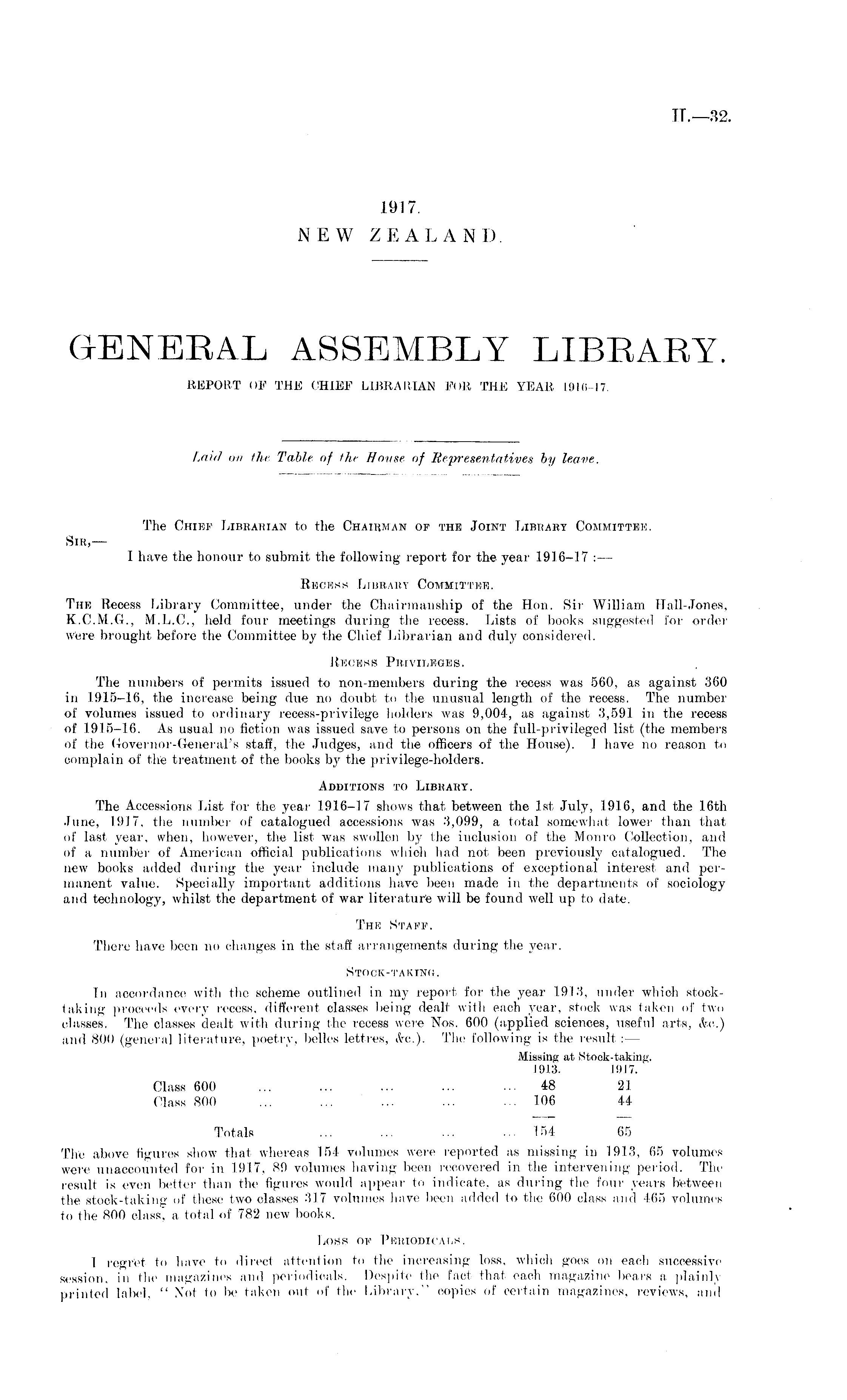 The Chief Librarian to the Chairman op the Joint Library Committee. Sir,— I have the honour to submit the following report for the year 1916-17 : — Recks s Library Committee. The Recess Library Committee, under the Chairmanship of the Hon. Sir William Hall-Jones, K.C.M.G., M.L.C., held four meetings during the recess. Lists of books suggested for order Were brought before the Committee by the Chief Librarian and duly considered. Recess Privileges. The numbers of permits issued to non-members during the recess was 560, as against 360 in 1915-16, the increase being due no doubt to the unusual length of the recess. The number of volumes issued to ordinary recess-privilege holders was 9,004, as against 3,591 in the recess of 1915-16. As usual no fiction was issued save to persons on the full-privileged list (the members of the Governor-General's staff, the Judges, and the officers of the House). I have no reason to complain of the treatment of the books by the privilege-holders. Additions to Library. The Accessions List for the year 1916-17 shows that between the Ist July, 1916, and the 16th June, 1917, the Dumber of catalogued accessions was 3,099, a total somewhat lower than that of last year, when, however, the list was swollen by the inclusion of the Monro Collection, and of a number of American official publications whioh had not been previously catalogued. The new books added during the year include many publications of exceptional interest and permanent value. Specially important additions have been made in the departments of sociology and technology, whilst the department of war literature will be found well up to date. The Staff. There have been no changes in the staff arrangements during the year. Stock-taking. In accordance with the scheme outlined in my report for the year 1.913, under whioh stocktaking proceeds every recess, different classes being dealt with each year, stock was taken of two classes, The classes dealt with during the recess were Nos. 600 (applied sciences, useful arts, i.e.) and 800 (general literature, poetry, belles lettres, ifcc). The following is the result : — Missing at Stock-taking. 1913. 1017. Class 600 ... ... ... ... ... 48 21. Class 800 ... ... ... ... ... 106 44 Totals ... ... ... ... 154 65 The above figures show that whereas 154 volumes were reported as missing in 1913, 65 volumes were unaccounted for in 191.7, 89 volumes having been recovered in the intervening period. The result is even better than the figures would appear to indicate, as during the four years between the stock-taking of these two classes 317 volumes have been added to the 600 class and 465 volumes to the 800 class", a total of 782 new books. Loss of Periodicals. I regret to have to direct attention to the increasing loss, which goes on each successive session, in the magazines and periodicals. Despite the fact that each magazine bears a plainly printed label, " Not to be taken out of the Library." copies of certain magazines, reviews, and