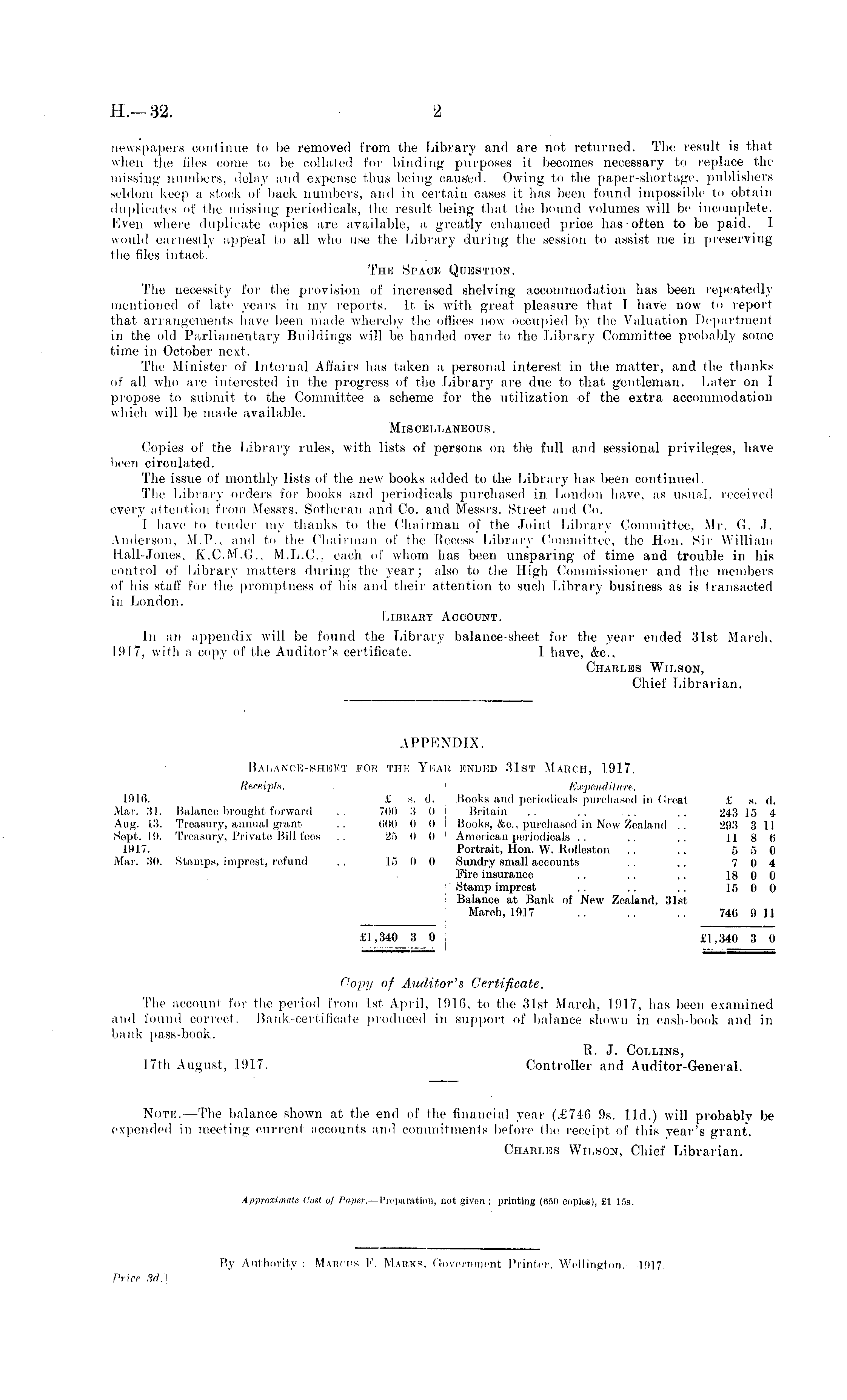 newspapers continue to be removed from the Library and are not returned. The result is that when the files come to be collated for binding purposes it becomes necessary to replace the missing numbers, delay and expense thus being caused. Owing to the paper-shortage, publishers seldom keep a stock of back numbers, and in certain cases it has been found impossible to obtain duplicates of the missing periodicals, the result being that the bound volumes will be incomplete. Kven where duplicate copies are available, a, greatly enhanced price has often to be paid. I would earnestly appeal to all who use the Library during the session to assist me in preserving the files intaot. The Space Question. The necessity for the provision of increased shelving accommodation has been repeatedly mentioned of late years in my reports. It is with great pleasure that I have now to report that arrangements have been made whereby the offices now occupied by the Valuation Department in the old Parliamentary Buildings will be handed over to the Library Committee probably some time in October next. The Minister of Internal Affairs has taken a personal interest in the matter, and the thanks of all who are interested in the progress of the Library are due to that gentleman. Later on I propose to submit to the Committee a scheme for the utilization of the extra accommodation which will be made available. Miscellaneous. Copies of the Library rules, with lists of persons on the full and sessional privileges, have been circulated. The issue of monthly lists of the new books added to the Library has been continued. The Library orders for books and periodicals purchased in London have, as usual, received every attention from Messrs. Sotheran and Co. and Messrs. Street and Co. I have to tender my thanks to the Chairman of the Joint Library Committee, Mr. G. J. Anderson, M.P., and to the Chairman of the Recess Library Committee, the Hon. Sir William Hall-Jones, K.C.M.G., M.L.C., each, of whom has been unsparing of time and trouble in his control of Library matters during the year; also to the High Commissioner and the members of his staff for the promptness of his and their attention to such Library business as is transacted in London. Library Account. In an appendix will be found the Library balance-sheet for the year ended 31st March, 1917, with a copy of the Auditor's certificate. I. have, &c, Charles Wilson, Chief Librarian.