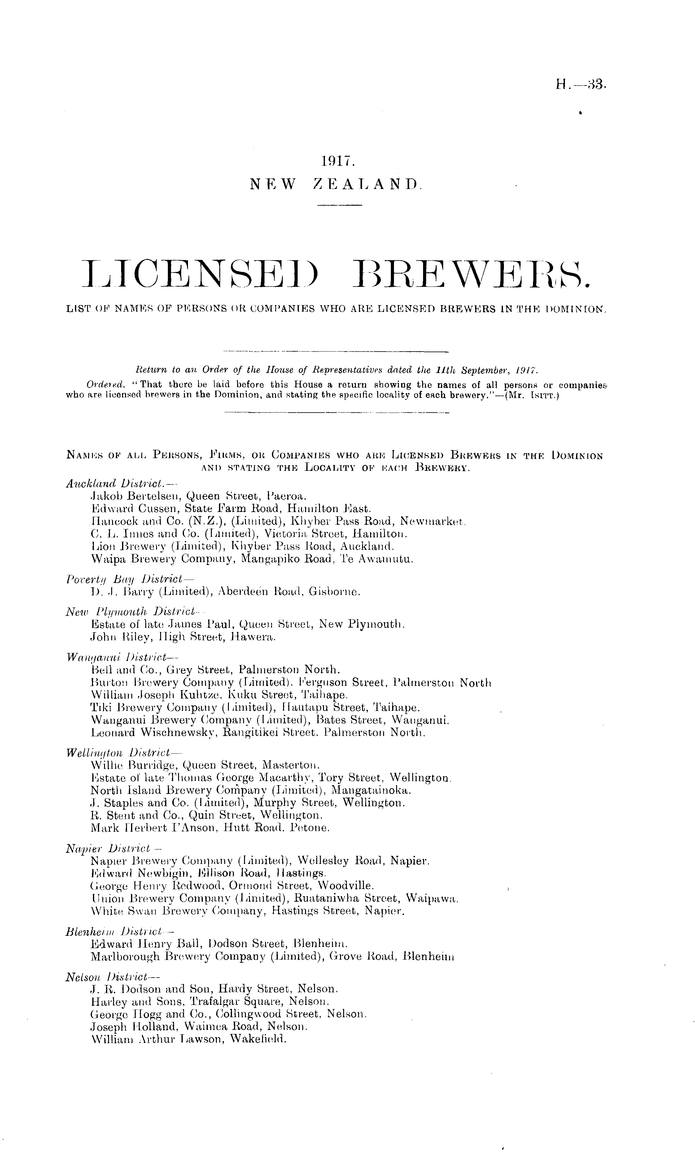 Names of all Persons, Firms, or Companies who are Licensed Brewers in the Dominion and stating the locality of each I.rkwery. Auckland District. — Jakob Bertelsen, Queen Street, Paeroa. Edward Cussen, State Farm Boad, Hamilton East. Hancock afld Co. (N.Z.), (Limited), Khyber Pass Boad, Newmarket. C. L. Innes and Co. (Limited), Victoria Street, Hamilton. Lion Brewery (Limited), Khyber Pass Road, Auckland. Waipa Brewery Company, Mangapiko Road, Te Awamutu. Poverty Bay District — D. J. Barry (Limited), Aberdeen Boad, Gisborne. New Plymouth District — Estitte of late James Paul, Queen Street, New Plymouth. John Biley, High Street, Hawera. Wangauui District — Bell and Co., Grey Street, Palmerston North. Burton Brewery Company (Limited). Ferguson Street, Palmerston North William Joseph Kuhtze, Kuku Street, Taihape. Tiki Brewery Company (Limited), Hautapu Street, Taihape. Wanganui Brewery Company (Limited), Bates Street, Wauganui. Leonard Wischnewsky, Bangitikei Street. Palmerston North. Wellington District — Willie Burridge, Queen Street, Masterton. Estate of late Thomas George Macarthy, Tory Street, Wellington. North Island Brewery Company (Limited), Mangatainoka. J. Staples and Co. (Limited), Murphy Street, Wellington. E. Stent and Co., Quin Street, Wellington. Mark Herbert I'Anson, Hutt Boad. Petone. Napier District — Napier Brewery Company (Limited), Wellesley Boad, Napier. Edward Newbigin, Ellison Boad, Hastings. George Henry Bedwood, Ormond Street, Woodville. , Union Brewery Company (Limited), Buataniwha Street, Waipawa. White Swan Brewery Company, Hastings Street, Napier. Blenheim District — Edward Henry Ball, Dodson Street, Blenheim. Marlborough Brewery Company (Limited), Grove Boad, Blenheim Nelson District — J. B. Dodson and Son, Hardy Street, Nelson. Harley and Sons, Trafalgar Square, Nelson. George Hogg and Co., Collingwood Street, Nelson. Joseph Holland, Waimea Boad, Nelson. William Arthur Lawson, Wakefield.