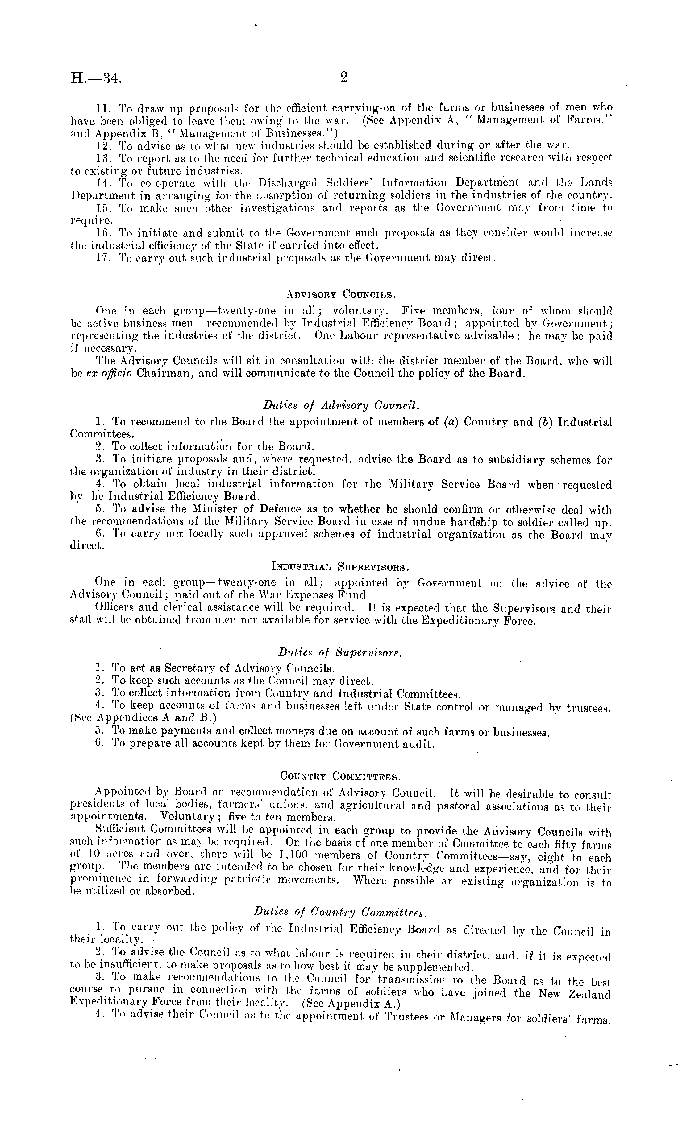11. To draw up proposals for the efficient carrying-on of the farms or businesses of men who have been obliged to leave them owing to the war. (See Appendix A, " Management of Farms," and Appendix B, " Management of Businesses.") 12. To advise as to what new industries should be established during or after the war. 13. To report as to the need for further technical education and scientific research with respect to existing or future industries. 14. To co-operate with the Discharged Soldiers' Information Department and the Lands Department in arranging for the absorption of returning soldiers in the industries of the country. 15. To make such other investigations and reports as the Government may from time to require. 16. To initiate and submit to the Government such proposals as they consider would increase the industrial efficiency of the State if carried into effect. 17. To carry out such industrial proposals as the Government may direct. Advisory Councils. One in each group —twenty-one in all; voluntary. Five members, four of whom should be active business men —recommended by Industrial Efficiency Board; appointed by Government; representing the industries of the district. One Labour representative advisable :he may be, paid if necessary. The Advisory Councils will sit in consultation with the district member of the Board, who will be ex officio Chairman, and will communicate to the Council the policy of the Board. Duties of Advisory Council. 1. To recommend to the Board the appointment of members of (a) Country and (b) Industrial Committees. 2. To collect information for the Board. 3. To initiate proposals and, where requested, advise the Board as to subsidiary schemes for the organization of industry in their district. 4. To obtain local industrial information I'm- the Military Service Board when requested by the Industrial Efficiency Board. 5. To advise the Minister of Defence as to whether he should confirm or otherwise deal with the recommendations of the Military Service Board in case of undue hardship to soldier called up. G. To carry out locally such approved schemes of industrial organization as the Board may direct. Industrial Supervisors. One in each group—twenty-one in all; appointed by Government on the advice of the Advisory Council; paid out of the War Expenses Fund. Officers and clerical assistance will be required. It is expected that the Supervisors and their staff will be obtained from men not available for service with the Expeditionary Force. Duties of Supervisors. 1. To act as Secretary of Advisory Councils. 2. To keep such accounts as the Council may direct. 3. To collect information from Country and Industrial Committees. 4. To keep accounts of farms and businesses left under State control or managed by trustees. (See Appendices A and B.) 5. To make payments and collect moneys due on account of such farms or businesses. 6. To prepare all accounts kept by them for Government audit. Country Committees. Appointed by Board on recommendation of Advisory Council. It will be desirable to consult presidents of local bodies, farmers' unions, and agricultural and pastoral associations as to their appointments. Voluntary; five to ten members. Sufficient Committees will be appointed in each group to provide the Advisory Councils with such information as may be required. On the basis of one member of Committee to each fifty farms of 10 acres and over, there will be 1,100 members of Country Committees—say, eight to each group. The members are intended to be chosen for their knowledge and experience, and for their prominence in forwarding patriotic movements. Where possible an existing organization is to be utilized or absorbed. Duties of Country Committees. 1. To carry out the policy of the Industrial Efficiency Board as directed by the Council in their locality. 2. To advise the Council as to what labour is required in their district, and, if it is expected to be insufficient, to make proposals as to how best it may be supplemented. 3. To make recommendations to the Council for'transmission to the Board as to the best course to pursue in connection with the farms of soldiers who have joined the New Zealand Expeditionary Force from their locality. (See Appendix A.) 4. To advise their Council as to the appointment of Trustees or Managers for soldiers' farms.