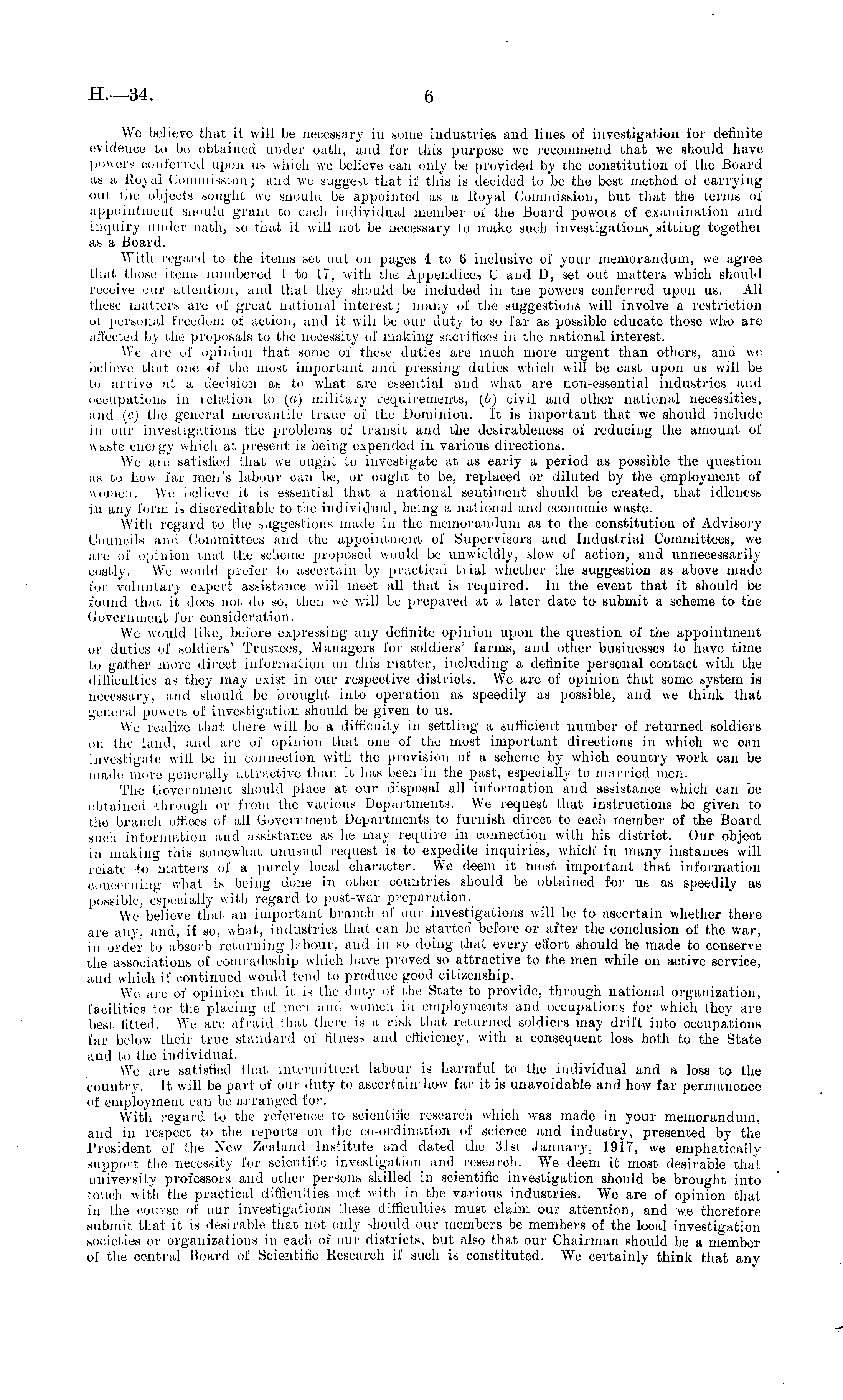 We believe that it will be necessary in some industries and lines of investigation for definite evidence to be obtained under oath, and for this purpose we recommend that we should have powers conferred upon us which we believe can only be provided by the constitution of the Board as a Royal Commission; and we suggest that if this is decided to be the best method of carrying out the objects sought we should be appointed as a Royal Commission, but that the terms of appointment should grant to each individual member of the Board powers of examination and inquiry under oath, so that it will not be necessary to make such sitting together as a Board. With regard to the items set out on pages 4 to 6 inclusive of your memorandum, we agree that, those items numbered f to 17, with the Appendices C and D, set out matters which should receive our attention, and that they should be included in the powers conferred upon us. Ail these matters are of great national interest; many of the suggestions will involve a restriction of personal freedom of action, and it will be our duty to so far as possible educate those who are affected by the proposals to the necessity of making sacrifices in the national interest. We are of opinion that some of these duties are much more urgent than others, and we believe that one of the most important and pressing duties which will be cast upon us will be to arrive at a decision as to what are essential and what are non-essential industries and occupations in relation to («) military requirements, (6) civil and other national necessities, and (c) the general mercantile trade of the Dominion. It is important that we should include in our investigations the problems of transit and the desirableness of reducing the amount of waste energy which at present is being expended in various directions. We are satisfied that we ought, to investigate at as early a period as possible the question as to how far men's labour can be, or ought to be, replaced or diluted by the employment of women. We believe it is essential that a national sentiment should be created, that idleness in any form is discreditable to the individual, being a national and economic waste. With regard to the suggestions made in the memorandum as to the constitution of Advisory Councils and Committees and the appointment of Supervisors and Industrial Committees, we are of opinion that the scheme proposed would be unwieldly, slow of action, and unnecessarily costly. We would prefer to ascertain by practical trial whether the suggestion as above made for voluntary expert assistance will meet all that is required. In the event that it should be found that it does not do so, then we will be prepared at a later date to submit a scheme to the Government for consideration. We would like, before expressing any definite opinion upon the question of the appointment or duties of soldiers' Trustees, Managers for soldiers' farms, and other businesses to have time to gather more direct information, on this matter, including a definite personal contact with the difficulties as they may exist in our respective districts. We are of opinion that some system is necessary, and should be brought into operation as speedily as possible, and we think that general powers of investigation should be given to us. We realize that there will be a difficulty in settling a sufficient number of returned soldiers on the land, and are of opinion that one of the most important directions in which we can investigate will be in connection with the provision of a scheme by which country work can be made more generally attractive than it has been in the past, especially to married men. The Government should place at our disposal all information and assistance which can be obtained through or from the various Departments. We request that instructions be given to the branch offices of all Government Departments to furnish direct to each member of the Board such information and assistance as he may require in connection with his district. Our object in making this somewhat unusual request is to expedite inquiries, which in many instances will relate to matters of a purely local character. We deem it most important that information concerning what is being done in other countries should be obtained for us as speedily as possible, especially with regard to post-war preparation. We believe that an important branch of our investigations will be to ascertain whether there are any, and, if so, what, industries thai, can be started before or after the conclusion of the war, in order to absorb returning labour, and in so doing that every effort should be made to conserve the associations of comradeship which have proved so attractive to the men while on active service, and which if continued would tend to produce good citizenship. We are of opinion that it is the duty of the State to provide, through national organization, facilities for the placing of men and women in employments and occupations for which they arc best fitted. We are afraid that there is a risk that returned soldiers may drift into occupations far below their true standard of fitness and efficiency, with a consequent loss both to the State and to the individual. We are satisfied that intermittent labour is harmful to the individual and a loss to the country. It will be part of our duty to ascertain how far it is unavoidable and how far permanence of employment can be arranged for. AVith regard to the reference to scientific research which was made in your memorandum, and in respect to the reports on the co-ordination of science and industry, presented by the President of the New Zealand Institute and dated the 31st January, 1917, we emphatically support the necessity for scientific investigation and research. We deem it most desirable that university professors and other persons skilled in scientific investigation should be brought into touch with the practical difficulties met with in the variou