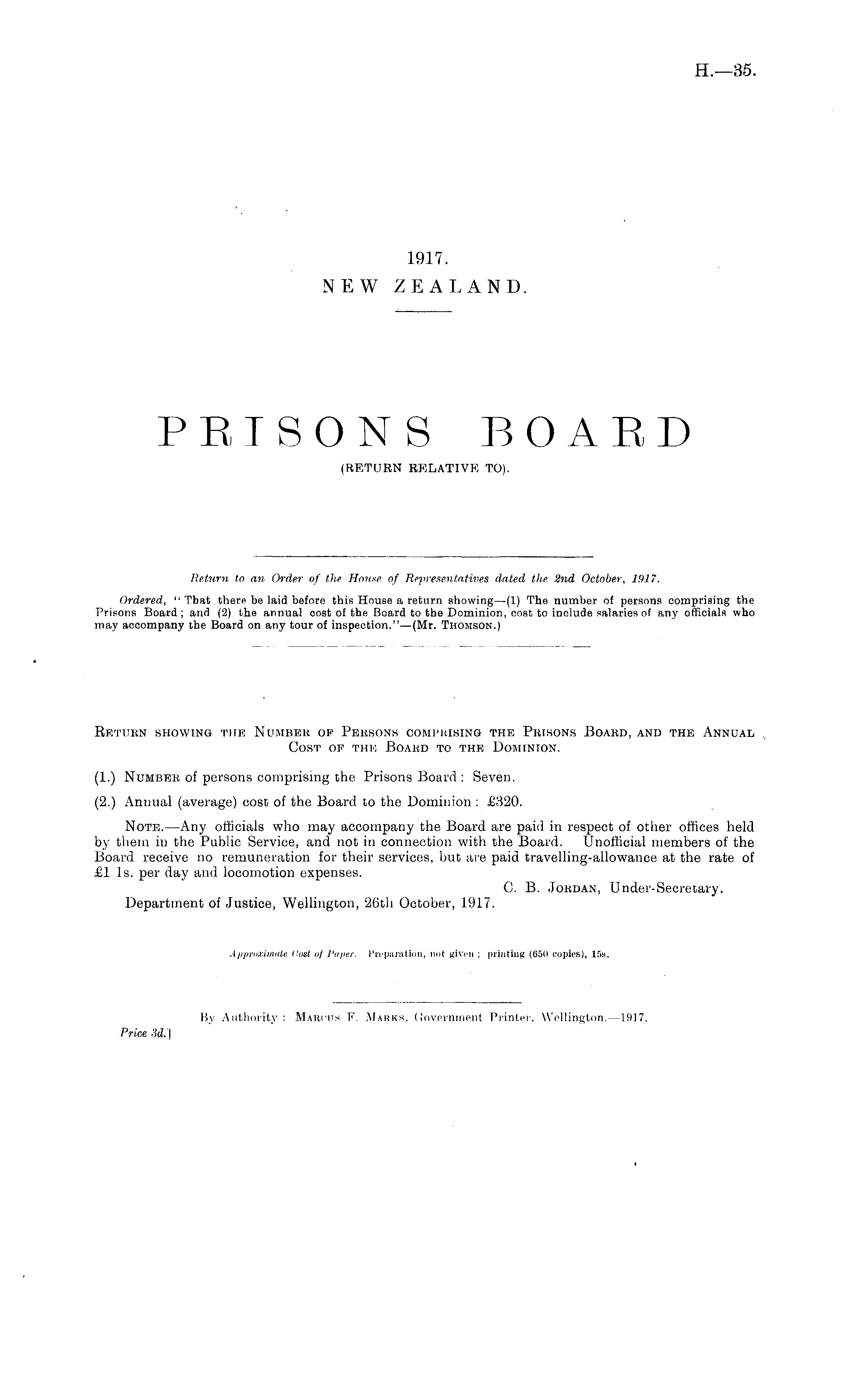 Return showing the Number op Persons comprising the Prisons Board, and the Annual Cost op the Board to the Dominion. (1.) Number of persons comprising the Prisons Board : Seven. (2.) Annual (average) cost of the Board to the Dominion : £320. Note. —Any officials who may accompany the Board are paid in respect of other offices held by them in the Public Service, and not in connection with the Board. Unofficial members of the Board receive no remuneration for their services, but are paid travelling-allowance at the rate of £1 Is. per day and locomotion expenses. C. B. Jordan, Under-Secretary. Department of Justice, Wellington, 26th October, 1917.