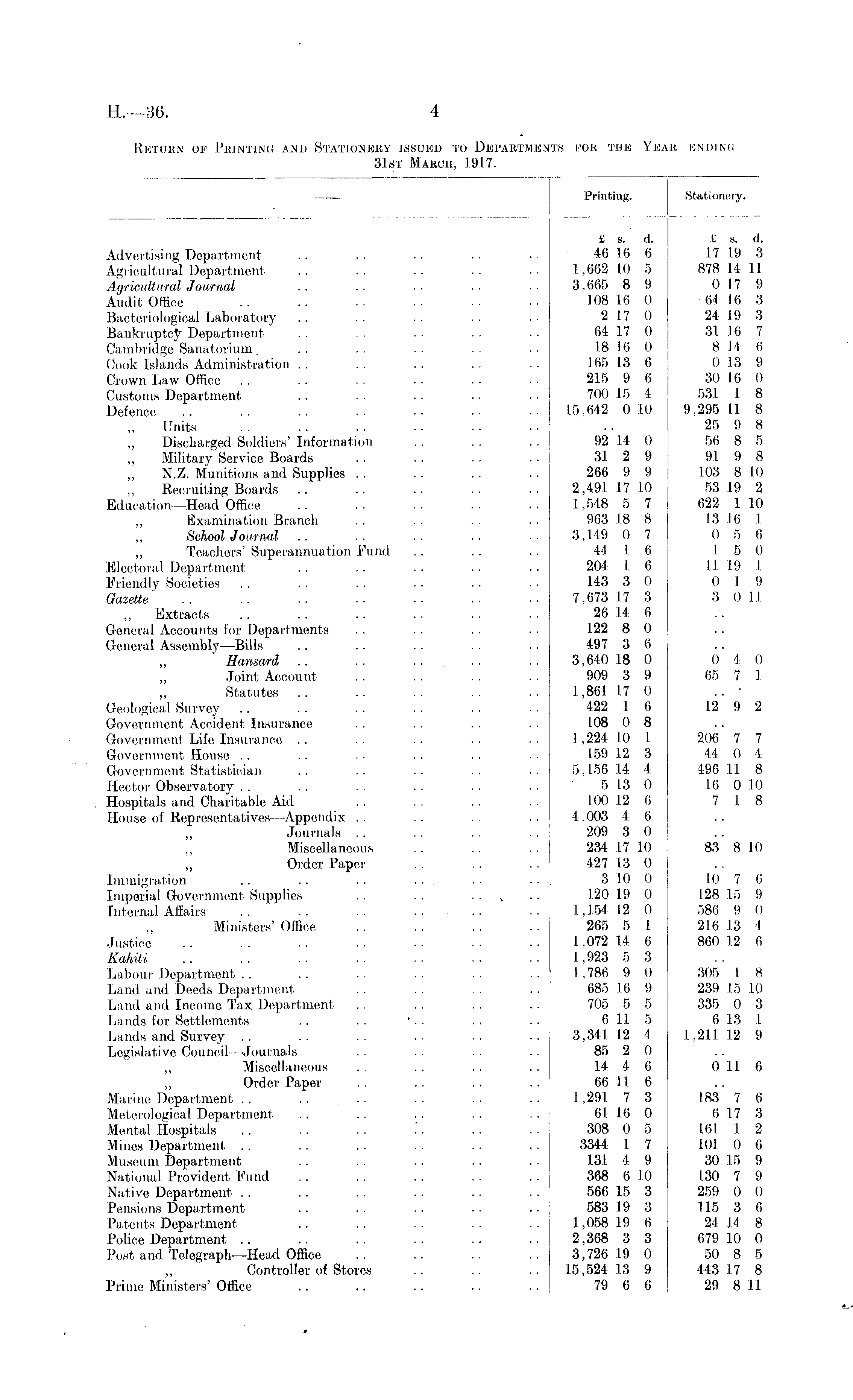 Printing. Stationery. I Advertising Department Agricultural Department Agricultural Journal Audit Office Bacteriological Laboratory Bankruptcy Department Cambridge Sanatorium . Cook Islands Administration Crown Law Office Customs Department Defence ,, Units ,, Discharged Soldiers' Information ,, Military Service Boards ,, N.Z. Munitions and Supplies . . ,, Recruiting Boards Education—Head Office ,, Examination Branch ,, School Journal ,, Teachers' Superannuation Fund Electoral Department Friendly Societies £ s. d. 46 16 6 I .662 10 5 3,665 8 9 108 16 0 2 17 0 64 17 0 18 16 0 165 13 6 215 9 6 700 15 4 15,642 0 10 £ s. d. 17 19 3 878 .14 11 0 17 9 •64 16 3 24 19 3 31 16 7 8 14 6 0 .13 9 30 16 0 531 1 8 9,295 11 8 25 9 8 56 8 5 91 9 8 103 8 10 53 19 2 622 1 10 13 .16 1 0 5 6 1 5 0 II 19 I 0 1 9 3 0 II Gazette „ Extracts General Accounts for Departments General Assembly—Bills ,, Hansard ,, Joint Account ,, Statutes Geological Survey Government Accident Insurance Government Life Insurance Government House Government Statistician Hector Observatory Hospitals and Charitable Aid House of Representatives—Appendix . . ,, Journals . . ,, Miscellaneous ,, Order Paper Immigration Imperial Government Supplies Internal Affairs ,, Ministers' Office 92 14 0 31 2 9 266 9 9 2,491 17 10 I ,548 5 7 963 18 8 3.149 0 7 44: I. 6 204 1. 6 143 3 0 7.673 17 3 26 14 6 122 8 0 497 3 6 3,640 18 0 909 3 9 I,861 17 0 422 1 6 108 0 8 I .224 10 1 159 12 3 5,156 14 4 5 13 0 100 .12 6 4,003 4 6 209 3 0 234 17 10 427 13 0 3 10 0 120 19 0 I ,154 12 0 265 5 1 I.072 14 6 1.923 5 3 I.786 9 0 685 16 9 705 5 5 6 11 5 3.341 12 4 85 2 0 14 4 6 66 11 6 I ,291 7 3 61. 16 0 308 0 5 3344 1 7 131 4 9 368 6 10 566 15 3 583 19 3 1,058 19 6 2,368 3 3 3,726 19 0 15,524 13 9 79 6 6 0 4 0 65 7 1 12 9 2 206 7 7 44 0 4 496 11 8 16 0 10 7 I 8 83 8 10 10 7 6 128 15 9 586 9 0 216 13 I 860 12 6 Justice Kahili Labour Department .. Land and Deeds Department Land and Income Tax Department Lands for Settlements Lands and Survey Legislative Council—Journals ,, Miscellaneous ,, Order Paper Marine Department Meterologieal Department Mental Hospitals Mines Department Museum Department National Provident Fund Native Department Pensions Department Patents Department Police Department Post and Telegraph—Head Office ,, Controller of Stores Prime Ministers' Office 305 1 8 239 15 10 335 0 3 6 1.3 1. 1.211 12 9 0 11 6 183 7 6 6 17 3 161 .1 2 10.1 0 6 30 15 9 130 7 9 259 0 0 1.15 3 6 24 14 8 679 10 0 50 8 5 443 17 8 29 8 11