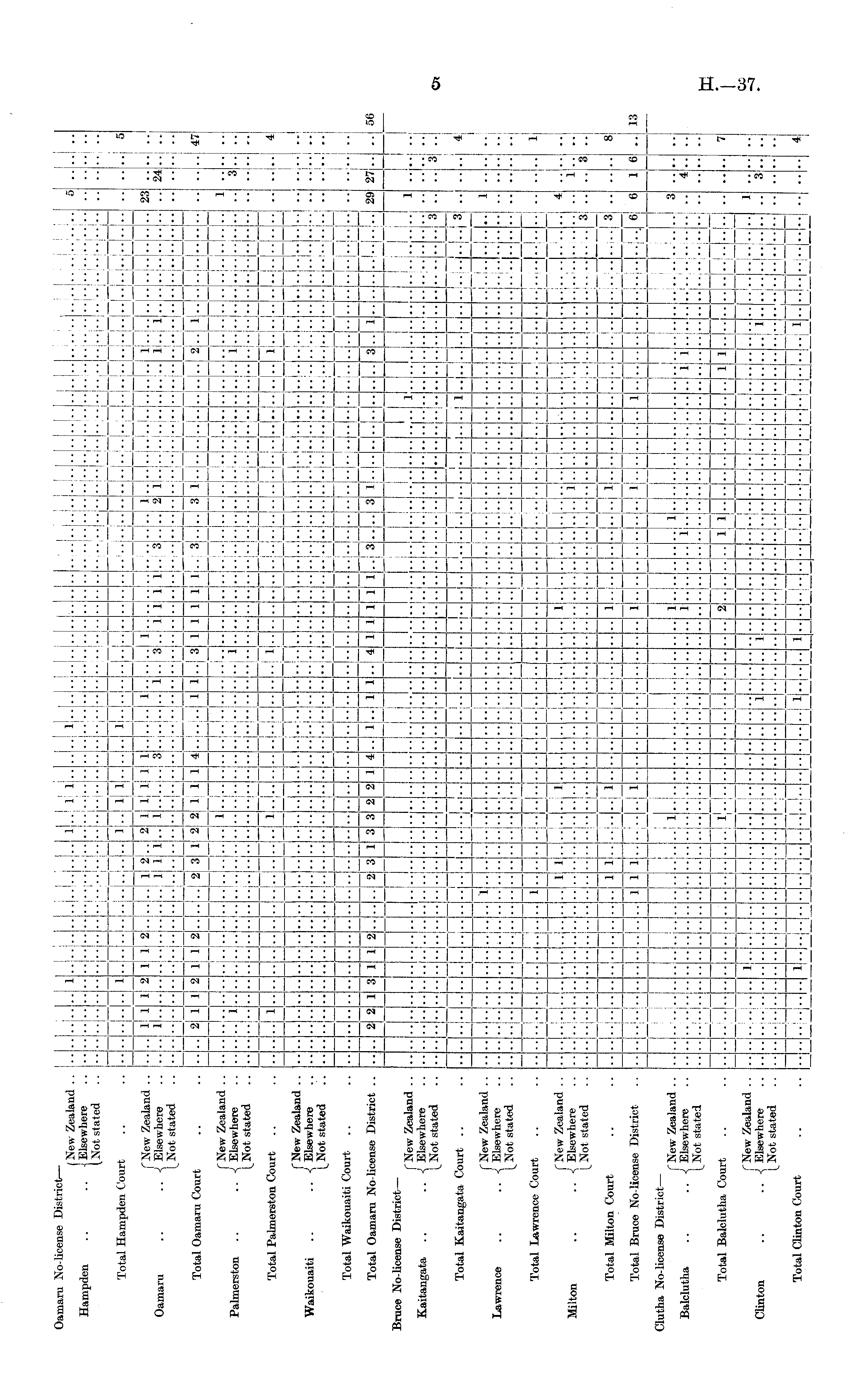 Oamaru No-license Districts— t New Zealand .. Hampden .. • • 1 El sewnere (Not stated Total Hampden Court ("New Zealand .. Oamaru .. .. < Elsewhere [_ Not stated Total Oamaru Court •• - :••; u •' — •• :- •• — 1 1 1 .. 2 1 .. 1 •■ i_i l i i •" 1 H 2 •I 2 •■ 1 — ' 'I'' 1 1 1 •• ■■ H hi 2 !■■ I 2 L_l '■• •■ — .111 •I .. 1 .. 1 .. 2 •• I 2 H 3 — •• — •■ i i •• i - 2 •• ■■ 2 •■ - •• .- 1 1 2 - 1 1 .... lj 1 1 J 1 1 4 - J 3 • • i .... Hill 11 l.... .... i .. .. i .. _ i i -14 •■ - i - i i •• - 1 - i •• •■ - i - i .... ..... .... ••' 3 i J .. 3 I I - " •• I • • •• •• — •' H i 2 3 i ..j "177.77:7" .. ..!.. .. .. .. .. •••-[••••I- ! I I I I 1 .. .. 1 .. 1 2 .. 1 1 .. .. i " " i • ■• - _ L_l •• •■ •• ■• 5 "I 23 •• 24 .. •■ ; J .1 i " .. I •• 47 f New Zealand .. Palmerston .. .. < Elsewhere stated 1 .. i .. l i .... 3 •■ Total Palmerston Court ("New Zealand .. Waikouaiti .. .. < Elsewhere stated •' - •• — •• — ,•■ - I .. 1 2 2 : ■■ -4 -i •• - •• — •• - •• i- •■ - •1 -: ■■ •■: — ■ " - " — ■■ - - ■■ - •• — •• - •• — ■• - •■ - •■ — •• i •• — ■• - •• - •• - •■ - •■ —' •••• I. ■• - ■• - •• — •■ - •■ - •■ - ■■ _ _ ! _i. 1 .. .. - •• - •• - •• 4 .. ••! - •1 • • I - 1 " ■■ •■ - " ' •• •• •• ••] •• •• •• • •• HUH __.__._1 .. .. •■ "I •• " ■• ■■ •• •• - - — - L_J -- - _ - _ _ - - , - - Total Waikouaiti Court •• , •• ..... •• ;■• •• •• •I •I ■■ •• •• •• •■ 'I •• •■ •• •• "I .. 51 — - H H — 3 - — u - !- 1 L_L_J I : I __ - — - — 29 27 Total Oamaru No-license District .. 1 3 1 1 2 3 3 2 2 1 4 1 ••! 1 4 i .. 3 •- 3 3 - 1 ! !'• •• •■ •• •■ •• ■• •■ ■■ •■ •• — - l_l - 1 - U __ - - i- : I -' I L_ - - - Bruce No-license District — ""! ("New Zealand .. Kaitangata .. .. { Elsewhere L Not stated !••! •• •■ •• ■■; '• ■• r .... •■ •• "I •• '7777,777701 i iiii'ilii'iAl 3 7777^7771 3 '.'. 3 ••! ! ■■■ •■ " •• •• - ■• •■ •• ■■ ••! : I i_ — - -! - - — M —! —■ — ; - - - i 4: Total Kaitangata Court •• •1 ■■■■ •• " •■ "i •• •■ ••i i" •■ I I- ■- -■ •■ H " - I | l H - - l— __ - hi - - -H 1 :- - — - — — — - i f New Zealand .. Lawrence .. •• A Elsewhere [_ Not stated .. .. 1 \'\ .... •1 •• "I "I ■■ - !-•: ... •• - •• HH •■ - ... H - •1 -4 ■- _!. ■■ - •■ - nil •• •■ ■■ - - .... HH .. - •• - - .... __ • Total Lawrence Court : :' i i| •■ " ■• •■ ■ ■• •• •I •• ■• •• •■ ■• ■• •' •• ■• - — ! i - 1 - - L- - -' - - - — - - — ("New Zealand .. Milton .. .. -i Elsewhere ' L Not stated .... ! I I •• ••; 1 .. 1 .. •• 3 .. 1 •• •' .... ■• •• •• 3 •• — •• - ■I •■ I ■ •■ I L i L i •■ - ■■ - •• - •■ - •• - - •■ - A - - .. H _ - - - - — - - Total Milton Court — i 1 8 '■ '• "I '■ ■' •■ ■■ ■' •• ■ •• •• ■• ■■ •• ■• •• ■■ •• " •• - - - _ - ™ i — I - ! - - - - U - - — - - - - - Total Bruce No-license District i ■ 1 i • - ■• i i 6 1 •■ ■• '■ •1 •I •1 Hill •• •• ■•i •■ •• "I "I •• •■ •■ •• ••! - — — - — — - I- - — - - I. - — - M - - - ;— I —! Clutha No-license District — ("New Zealand .. Balclutha .. .. -i Elsewhere [_Not stated Total Balclutha Court f New Zealand .. Clinton .. .. ■< Elsewhere Not stated i-l •• -4 •• " hi - I. "- i- • nndn 777777 i.... i.. •■ "I — •I — •I "I — "I - ■• — •I \-4 r\—' — ■■ - ■• - •• - ............ .... i ! .... i ■■ — •• •• — :■ ■■ - •• - .. ■• 1 1 •• __ •• — ■• - •• — •■ - •■ - "I •• - •• ■• - i 1 •• - 1 1 " •' II •• ! - •• 3 •• 4 •■ " 7 14 '■ f ■•! •1 ■• •• •• i 1 i 3 " "I •• •■ ■ -I •' ■ ■ •■ •■ •■ •• '■ • •• •■ •■ .. •• •• •• — - -' — - I - — — - - l_i - - - - .'— H - Total Clinton Court LI *i •• in Hi .... •1 •■ ■•! •• •■! ■■ •■ •■ .......... 'I ■• |..| I I ! l_l I I I i I I M . I I I i _