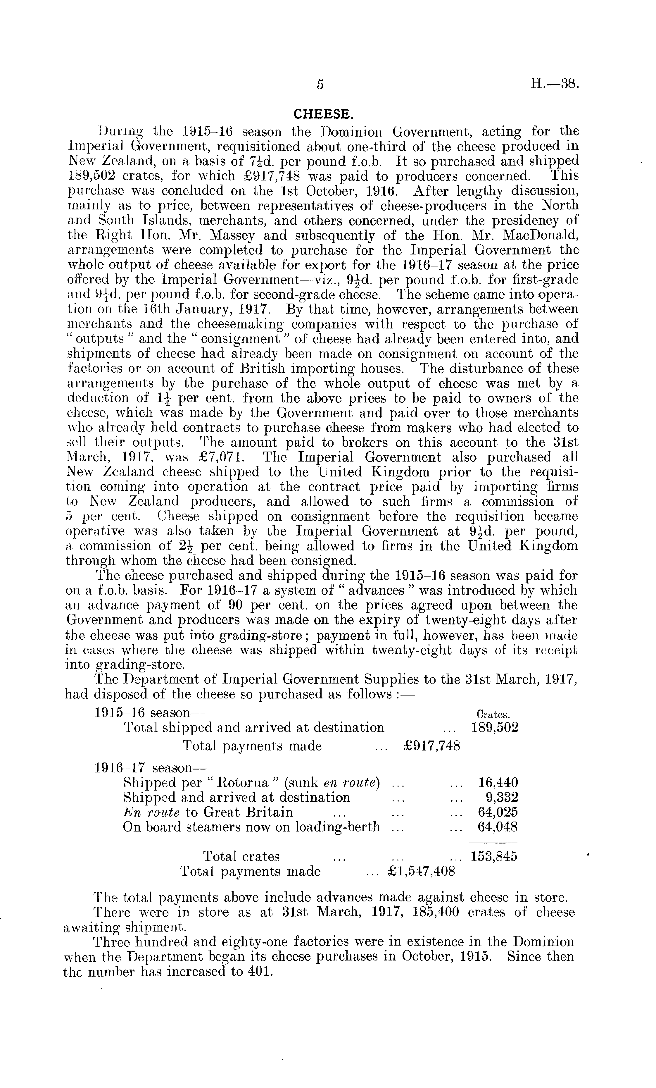 CHEESE. During the 1915-16 season the Dominion Government, acting for the Imperial Government, requisitioned about one-third of the cheese produced in New Zealand, on a basis of 7{-d. per pound f.o.b. It so purchased and shipped 189,502 crates, for which £917,748 was paid to producers concerned. This purchase was concluded on the Ist October, 1916. After lengthy discussion, mainly as to price, between representatives of cheese-producers in the North and South Islands, merchants, and others concerned, under the presidency of the Right Hon. Mr. Massey and subsequently of the Hon. Mr. MacDonald, arrangements were completed to purchase for the Imperial Government the whole output of cheese available for export for the 1916-17 season at the price offered by the Imperial Government —viz., 9-|d. per pound f.o.b. for first-grade and 9-|d. per pound f.o.b. for second-grade cheese. The scheme came into operation on the 16th January, 1917. By that time, however, arrangements between merchants and the cheesemaking companies with respect to the purchase of " outputs " and the " consignment " of cheese had already been entered into, and shipments of cheese had already been made on consignment on account of the factories or on account of British importing houses. The disturbance of these arrangements by the purchase of the whole output of cheese was met by a deduction of 1\ per cent, from the above prices to be paid to owners of the cheese, which was made by the Government and paid over to those merchants who already held contracts to purchase cheese from makers who had elected to sell their outputs. The amount paid to brokers on this account to the 31st March, 1917, was £7,071. The Imperial Government also purchased all New Zealand cheese shipped to the United Kingdom prior to the requisition coming into operation at the contract price paid by importing firms to New Zealand producers, and allowed to such firms a commission of 5 per cent. Cheese shipped on consignment before the requisition became operative was also taken by the Imperial Government at per pound, a commission of 2\ per cent, being allowed to firms in the United Kingdom through whom the cheese had been consigned. The cheese purchased and shipped during the 1915-16 season was paid for on a f.o.b. basis. For 1916-17 a system of " advances " was introduced by which an advance payment of 90 per cent, on the prices agreed upon between the Government and producers was made on the expiry of twenty-eight days after the cheese was put into grading-store; payment in full, however, has been made in cases where the cheese was shipped within twenty-eight days of its receipt into grading-store. The Department of Imperial Government Supplies to the 31st March, 1917, had disposed of the cheese so purchased as follows : — 1915-16 season— dates. Total shipped and arrived at destination ... 189,502 Total payments made ... £917,748 1916-17 season — Shipped per " Kotorua " (sunk en route) ... ... 16,440 Shipped and arrived at destination ... ... 9,332 En route to Great Britain ... ... ... 64,025 On board steamers now on loading-berth ... ... 64,048 Total crates ... ... ... 153,845 Total payments made ... £1,547,408 The total payments above include advances made against cheese in store. There were in store as at 31st March, 1917, 185,400 crates of cheese awaiting shipment. Three hundred and eighty-one factories were in existence in the Dominion when the Department began its cheese purchases in October, 1915. Since then the number has increased to 401.