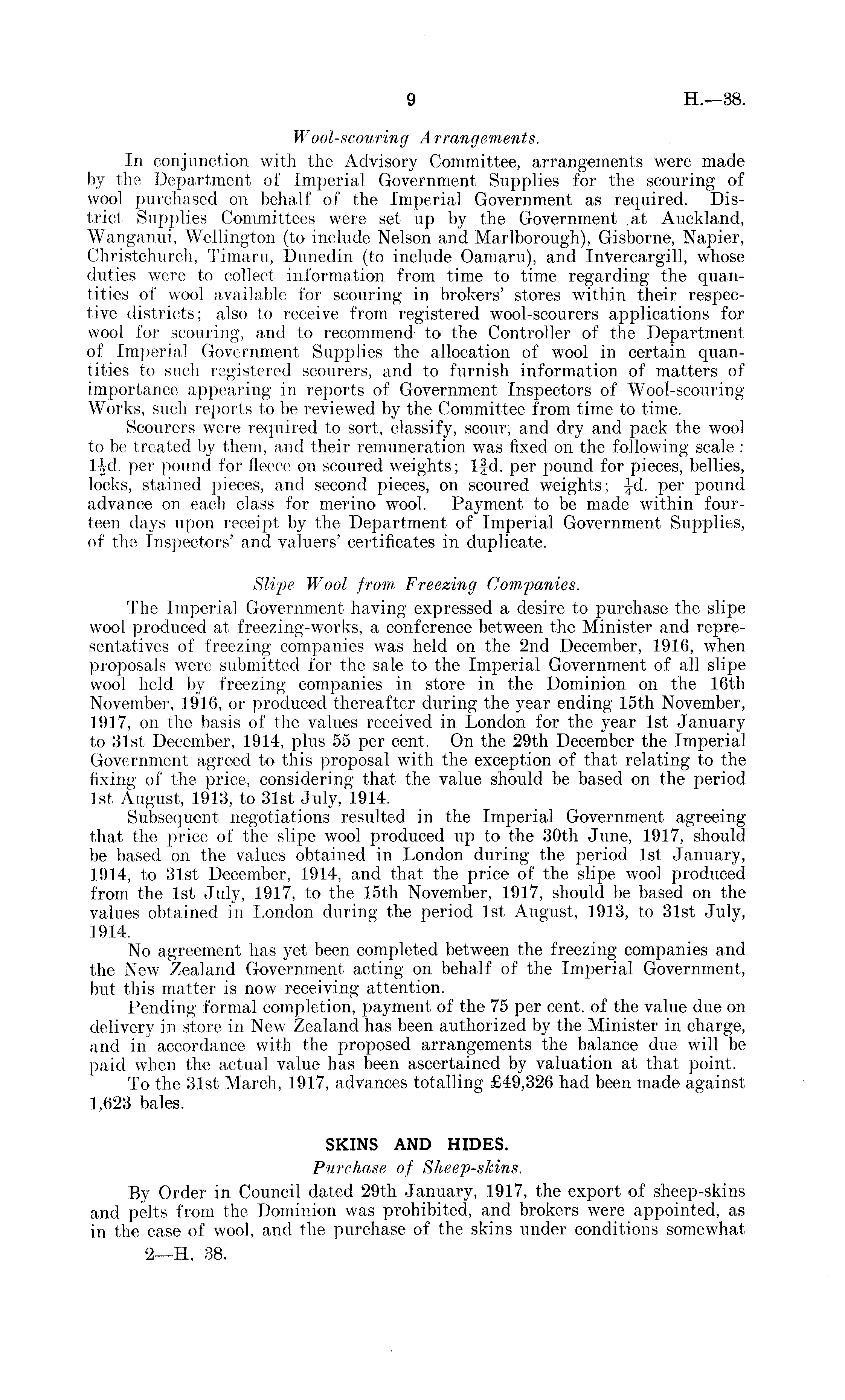 Wool-scouring A rrangements. In conjunction with the Advisory Committee, arrangements were made by the Department of Imperial Government Supplies for the scouring of wool purchased on behalf of the Imperial Government as required. District Supplies Committees were set up by the Government at Auckland, Wanganui, Wellington (to include Nelson and Marlborough), Gisborne, Napier, Christchurch, Timaru, Dunedin (to include Oamaru), and Invercargill, whose duties were to collect information from time to time regarding the quantities of wool available for scouring in brokers' stores within their respective districts; also to receive from registered wool-scourers applications for wool for scouring, and to recommend to the Controller of the Department of Imperial Government Supplies the allocation of wool in certain quantities to such registered scourers, and to furnish information of matters of importance appearing in reports of Government Inspectors of Wool-scouring Works, such reports to be reviewed by the Committee from time to time. Scourers were required to sort, classify, scour, and dry and pack the wool to be treated by them, and their remuneration was fixed on the following scale : l|-d. per pound for fleece on scoured weights; Ifd. per pound for pieces, bellies, locks, stained pieces, and second pieces, on scoured weights; 4/1. per pound advance on each class for merino wool. Payment to be made within fourteen days upon receipt by the Department of Imperial Government Supplies, of the Inspectors' and valuers' certificates in duplicate. Slipe Wool from, Freezing Companies. The Imperial Government having expressed a desire to purchase the slipe wool produced at freezing-works, a conference between the Minister and representatives of freezing companies was held on the 2nd December, 1916, when proposals were submitted for the sale to the Imperial Government of all slipe wool held by freezing companies in store in the Dominion on the 16th November, 1916, or produced thereafter during the year ending 15th November, 1917, on the basis of the values received in London for the year Ist January to 31st December, 1914, plus 55 per cent. On the 29th December the Imperial Government agreed to this proposal with the exception of that relating to the fixing of the price, considering that the value should be based on the period Ist August, 1913, to 31st July, 1914. Subsequent negotiations resulted in the Imperial Government agreeing that the price of the slipe wool produced up to the 30th June, 191.7, should be based on the values obtained in London during the period Ist January, 1914, to 31st December, 1914, and that the price of the slipe wool produced from the Ist July, 1917, to the 15th November, 1917, should be based on the values obtained in London during the period Ist August, 1913, to 31st July, 1914. No agreement has yet been completed between the freezing companies and the New Zealand Government acting on behalf of the Imperial Government, but this matter is now receiving attention. Pending formal completion, payment of the 75 per cent, of the value due on delivery in store in New Zealand has been authorized by the Minister in charge, and in accordance with the proposed arrangements "the balance due will be paid when the actual value has been ascertained by valuation at that point. To the 31st March, 1917, advances totalling £49,326 had been made against 1,623 bales. SKINS AND HIDES. Purchase of Sheep-skins. By Order in Council dated 29th January, 1917, the export of sheep-skins and pelts from the Dominion was prohibited, and brokers were appointed, as in the case of wool, and the purchase of the skins under conditions somewhat