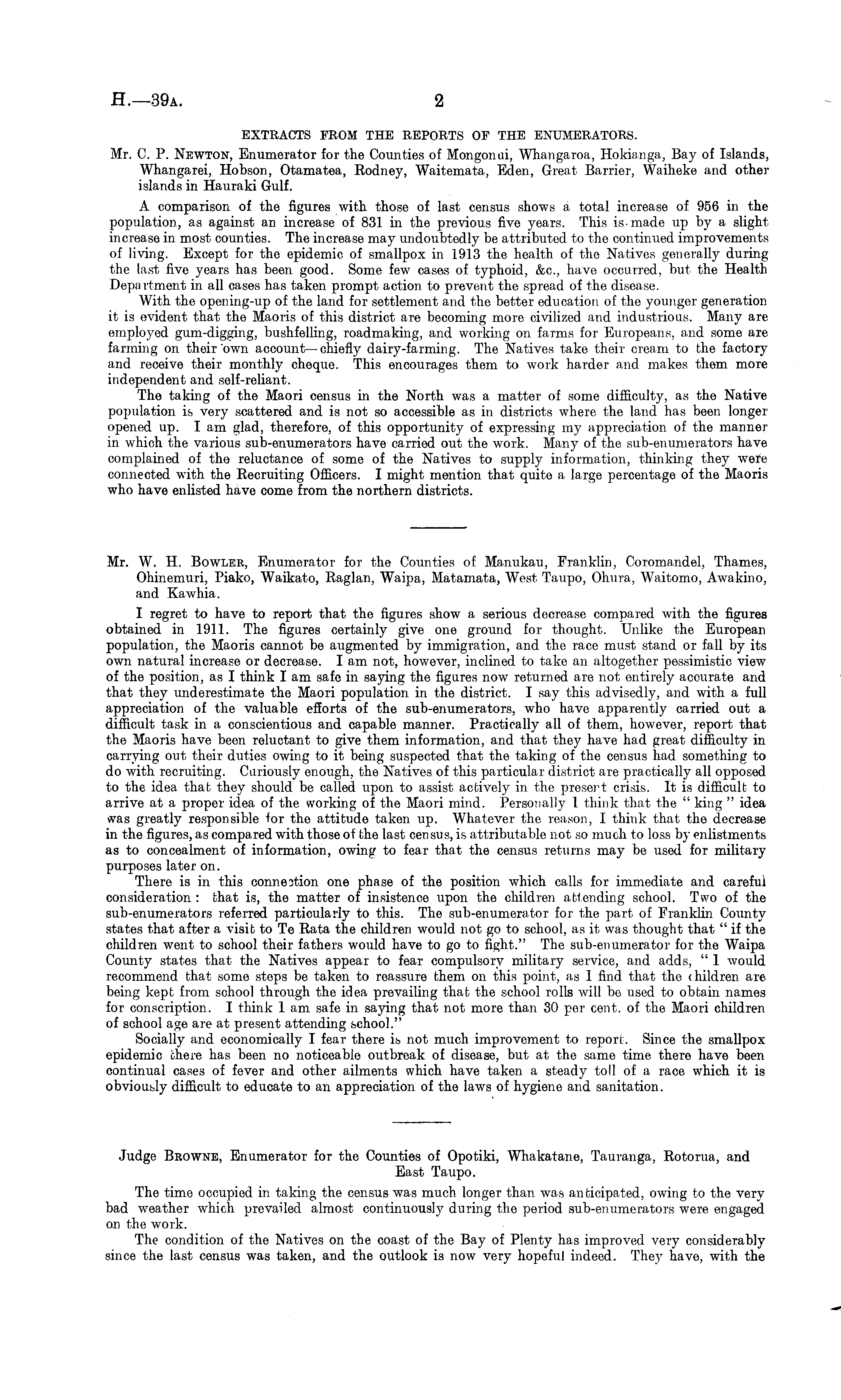 EXTRACTS FROM THE REPORTS OF THE ENUMERATORS. Mr. C. P. Newton, Enumerator for the Counties of Mongonui, Whangaroa, Hokianga, Bay of Islands, Whangarei, Hobson, Otamatea, Rodney, Waitemata, Eden, Great Barrier, Waiheke and other islands in Hauraki Gulf. A comparison of the figures with those of last census shows a total increase of 956 in the population, as against an increase of 831 in the previous five years. This is made up by a slight increase in most counties. The increase may undoubtedly be attributed to the continued improvements of living. Except for the epidemic of smallpox in 1913 the health of the Natives generally during the last five years has been good. Some few cases of typhoid, &c, have occurred, but the Health Department in all cases has taken prompt action to prevent the spread of the disease. With the opening-up of the land for settlement and the better education of the younger generation it is evident that the Maoris of this district are becoming more civilized and industrious. Many are employed gum-digging, bushfelling, roadmaking, and working on farms for Europeans, and some are farming on their'own account—chiefly dairy-farming. The Natives take their cream to the factory and receive their monthly cheque. This encourages them to work harder and makes them more independent and self-reliant. The taking of the Maori census in the North was a matter of some difficulty, as the Native population is very scattered and is not so accessible as in districts where the land has been longer opened up. lam glad, therefore, of this opportunity of expressing my appreciation of the manner in which the various sub-enumerators have carried out the work. Many of the sub-enumerators have complained of the reluctance of some of the Natives to supply information, thinking they were connected with the Recruiting Officers. I might mention that quite a large percentage of the Maoris who have enlisted have come from the northern districts. Mr. W. H. Bowler, Enumerator for the Counties of Manukau, Franklin, Coromandel, Thames, Ohinemuri, Piako, Waikato, Raglan, Waipa, Matamata, West Taupo, Ohura, Waitomo, Awakino, and Kawhia. I regret to have to report that the figures show a serious decrease compared with the figures obtained in 1911. The figures certainly give one ground for thought. Unlike the European population, the Maoris cannot be augmented by immigration, and the race must stand or fall by its own natural increase or decrease. lam not, however, inclined to take an altogether pessimistic view of the position, as I think I am safe in saying the figures now returned are not entirely accurate and that they underestimate the Maori population in the district. I say this advisedly, and with a full appreciation of the valuable efforts of the sub-enumerators, who have apparently carried out a difficult task in a conscientious and capable manner. Practically all of them, however, report that the Maoris have been reluctant to give them information, and that they have had great difficulty in carrying out their duties owing to it being suspected that the taking of the census had something to do with recruiting. Curiously enough, the Natives of this particular district are practically all opposed to the idea that they should be called upon to assist actively in the present crisis. It is difficult to arrive at a proper idea of the working of the Maori mind. Personally 1 think that the " king " idea was greatly responsible for the attitude taken up. Whatever the reason, I think that the decrease in the figures, as compared with those of the last census, is attributable not so much to loss by enlistments as to concealment of information, owing to fear that the census returns may be used for military purposes later on. There is in this connection one phase of the position which, calls for immediate and careful consideration : that is, the matter of insistence upon the children attending school. Two of the sub-enumerators referred particularly to this. The sub-enumerator for the part of Franklin County states that after a visit to Te Rata the children would not go to school, as it was thought that " if the children went to school their fathers would have to go to fight." The sub-enumerator for the Waipa County states that the Natives appear to fear compulsory military service, and adds, " I would recommend that some steps be taken to reassure them on this point, as I find that the children, are being kept from school through the idea prevailing that the school rolls will be used to obtain names for conscription. I think lam safe in saying that not more than 30 per cent, of the Maori children of school age are at present attending school." Socially and economically I fear there is not much improvement to report. Since the smallpox epidemic there has been no noticeable outbreak of disease, but at the same time there have been continual cases of fever and other ailments which have taken a steady toll of a race which it is obviously difficult to educate to an appreciation of the laws of hygiene and sanitation. Judge Browne, Enumerator for the Counties of Opotiki, Whakatane, Tauranga, Rotorua, and East Taupo. The time occupied in taking the census was much longer than was anticipated, owing to the very bad weather which prevailed almost continuously during the period sub-enumerators were engaged on the work. The condition of the Natives on the coast of the Bay of Plenty has improved very considerably since the last census was taken, and the outlook is now very hopeful indeed. They have, with the