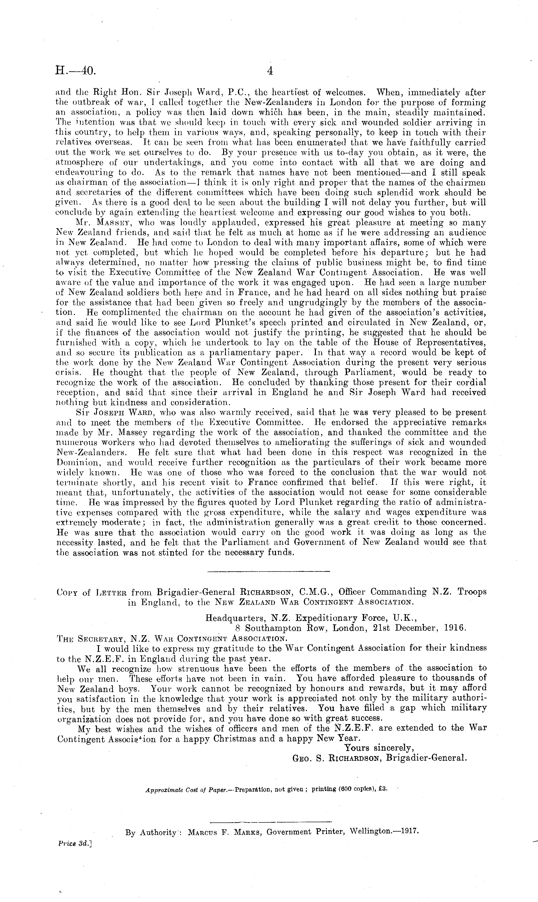 Copy of Letter from Brigadier-General Richardson, C.M.G., Officer Commanding N.Z. Troops in England, to the New Zealand War Contingent Association. Headquarters, N.Z. Expeditionary Force, U.K., 8 Southampton Row, London, 21st December, 1916. The Secretary, N.Z. War Contingent Association. I would like to express my gratitude to the War Contingent Association for their kindness to the N.Z.E.F. in England during the past year. We all recognize how strenuous have been the efforts of the members of the association to help our men. These efforts have not been in vain. You have afforded pleasure to thousands of New Zealand boys. Your work cannot be recognized by honours and rewards, but it may afford you satisfaction in the knowledge that your work is appreciated not only by the military authorities, but by the men themselves and by their relatives. You have filled a gap which military organization does not provide for, and you have done so with great success. My best wishes and the wishes of officers and men of the N.Z.E.F. are extended to the War Contingent Association for a happy Christmas and a happy New Year. Yours sincerely, Geo. S. Richardson, Brigadier-General.