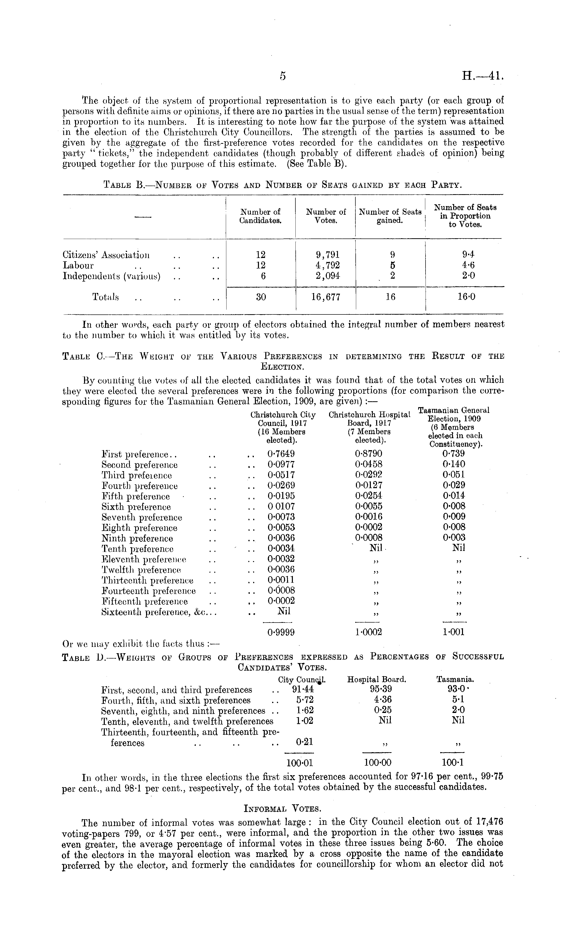 The object of the system of proportional representation is to give each party (or each group of persons with definite aims or opinions, if there are no parties in the usual sense of the term) representation in proportion to its numbers. It is interesting to note how far the purpose of the system was attained in the election of the Christchurch City Councillors. The strength of the parties is assumed to be given by the aggregate of the first-preference votes recorded for the candidates on the respective party " tickets," the independent candidates (though probably of different shades of opinion) being grouped together for the purpose of this estimate. (See Table B).