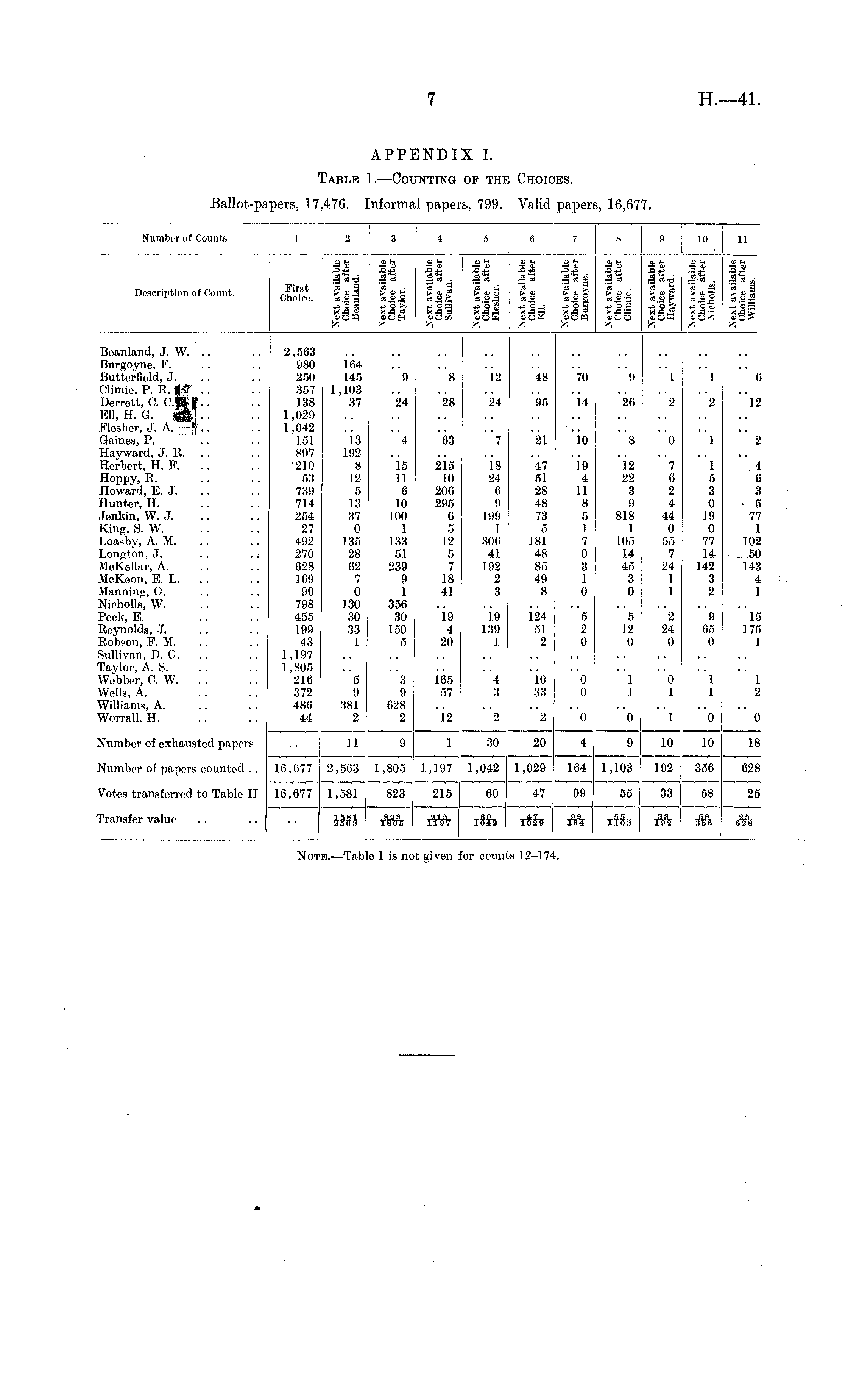 Number of Counts. Description of Count. 1 2 O) rH r-H 0. 173 First ; « g Choice. 'S.SLi'fl 4t Ol Sgr, 'At ;i 01 tH ■9*5 'efl -. oi t- *&£ 4- O r-. A.xt rt oiOEH 'At 4 5 O r- ft> rH ■°±I -°£ f> <D ,™ t> 9 9 fijf fill t KO« oj O fen ft ft ri I 9 si an 5 «.2 ft fl <U rH S-J *j o Xr7 X Oi fH 4) rH —J ft) -H J, 'co • 'eS > 0) i J ►> O 0) «a .2 a «..2 ■=; -f-. o j- +a o S y,A & XA'A do PQ cuo ft 9 5 '««' '« 3 > » S « o> p 440 b rl-3_* OlCjK 'A, 10 11 9 U 9 r-l •H 9 r- D & h£ rO 4Eh * £ Ml 5 li *Og H-O" ft ft Beanland, ,T. W. .. Burgoyne, E. Butterfield, J. Climie, P. P. (sT Derrett, 0. C.l§|.. Ell, H. G. gg . . Flesher, J. A. ~ r $.. Gaines, P. Hayward, J. R. Herbert, IT. E. Hoppy, R. Howard, E. J. Hunter, H. Jenkin, W. J. King, S. W. Loasby, A. M. Longton, J. McKellar, A. McKeon, E. L. . . Manning, G. Nicholls, W. Peek, E. Reynolds, T. Robson, E. M. Sullivan, D. G. .. Taylor, A. S. Webber, C. W. Wells, A. Williams, A. Worrall, H. 2. ,563 980 250 357 138 I ,029 1,042 151 897 '210 53 739 714 254 27 492 270 628 169 99 798 455 199 43 1,197 1,805 216 372 486 44 164 145 1,103 37 13 192 8 12 5 13 37 0 135 28 62 7 0 130 30 33 I 9 24 4 15 11 6 10 100 ] 133 51 239 9 1 356 30 150 5 8 28 63 215 10 206 295 6 5 12 5 7 18 41 12 24 7 .18 24 6 9 199 1 306 41 192 2 3 48 95 21 47 51 28 48 73 5 181 48 85 49 8 70 14 io 19 4 11 8 5 1 7 0 3 1 (I !) 26 8 12 22 3 0 818 1 105 14 45 3 0 1 2 0 7 0 2 4 44 0 55 7 24 1 1 I 2 1 .1 5 3 0 19 0 77 14 142 3 2 • ft 77 1 102 . 50 143 4 I 6 12 2 10 4 20 19 139 I 124 51 2 5 2 0 5 12 0 2 24 0 9 65 0 15 175 I 5 9 381 2 3 9 628 2 165 57 4 3 10 33 0 0 1 1 0 1 1 1 1 2 12 2 2 "o "o 1 0 0 — [umber of exhausted papers II 9 1 30 20 io L0 IS lumber of papers counted . . 16,677 2,563 1,805 1,197 1,042 1,029 164 1,103 192 356 628 60 47 ! I ' 55 33 25 'otes transferred to Table II 16,677 I ,581 823 215 99 58 'ransfer value Iff J ffi i%V I ll.il! loilT m rffs | m m M No'Ft. —Tab: lo 1 is not given for counts 12-17-
