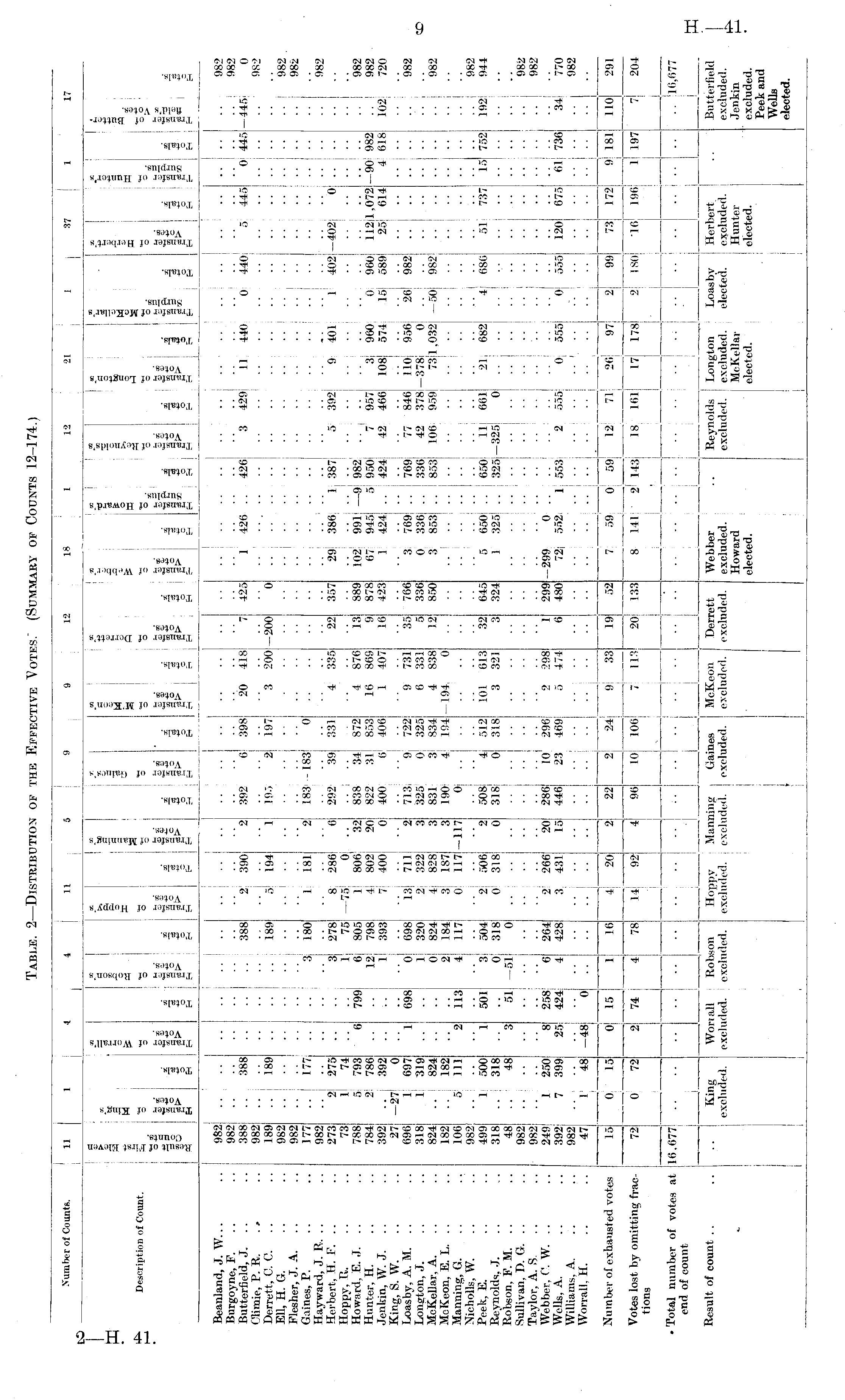 Number of Counts. I 11 11 5 9 12 18 12 ■21 37 1 17 Description of Count. a s a JO gi> | A Eh 6-i OB Is r= So ra o r- ill O r. © IB — © g^ 1. rr It ij r. ■3 a,J En H eh as a fH „T * c8 fl © CS O fH O rr gjS 1 © o 11 H 3 O i "sa ao Is * H H_< 3 a a EH OD a * I a,? : 3 jfi I « ." a W o © s j fn a IS a © "3 a a ~it *- ss> +J Sod -g ©n © Ph o E-.H H EH H rr W H En E- H tH fl © <H « fl 01 H oi Beanland, J. W. Burgovne, F. Butterfield, J. .. Climie, P. R. Derrett, C. C. Ell, H. G. Flesher, J. A. Gaines, P. Hayward, J. P.. Herbert, H. F. .. Hoppv, R. Howard, E. J. Hunter, H. Jenkin, W. J. King, S. W. Loasb\% A. M, Longton, J. McKellar, A. McKeon, E. L. .. Manning, G. Xicholls, W. Peek, E. Reynolds. J. Robson, F. M. .. Sullivan, D. G. .. Taylor, A. S. Webber. 0. W. Wells, A. Williams, A. Worrall. H. 982 982 388 982 189 982 982 177 982 273 73 7881 784, 392| 27 696 318 824 182 106 982; 499 318 48 982 982 249 : 392 982 47 I .. 388 I .. 189 ™ I .. .. ■• •• :! 177 •■ ■ "• • 2 275 1 74 I 5 793 2 786 392 -27 0 1 697 1 319 824 182 5 111 •• .. •' .. I 6 " •• ■• •••- .. .. .. 388 189 .. .. .. ■• : •■ : 3 180 3 278 1 75 799: 61 805 12 798 .. 1 393 2 390 2 5 194 1 1 181 2 8 286 6 -75 0; .. 1 S06 ! 32 4, 802 20 7 400 Oi 392 6 398 20 418 195 2 197 3 200 183-183 0 .. 292 39 331 4 335 838 34 872 4 876 822 31 853 16 868 ! 400 0; 406 ] 407 713 9, 722: 9 731 325 0| 325 6 331 831 31 834 4 838 190 4 ! 194 -194. 0 Oj 508 4 512 101 613 318| 0 318 3 321 286 10 ! 296 2 298 446 23 469 5 474 7 -200 22 13 9 16 j 357 889 878 423 425 0 1 426 .. 426 3 429 11 440 0 440 5 445 0 445 29 386 1,387 5 392 0 401 1 402-402 0 .. .. 102 991 —9 982 67 945 5 9,50 7 957 3 960 0 960 112,1,072-90 982 1 424 .. 424 42 466 108 574, 15 589 25; 614 4 618 3 769 .. 769 77 846 110 956 26 982 ..' 0 336 .. 336 42 378-378 0 .. .. | .. | 3 853 .. 853 106 959 731,032 -50 .. j 5 650 .. 650 11 661 21 682 4 686 51 737 15 7.52 1 325 .. 325-325: 0 ,'-. -299 0 . '. 72 552 1 553 2 555 0 555 0 555 120 675 61 j 736 7 59 0 59 12 71 26 97 2 99 73 172 9! 181 i ■ I 8 141 2 143 18 161 17 178 2 ISO 'loj 196 1 197 Webber .. Reynolds Longton Loasby Herbert excluded. excluded. ' excluded. elected. excluded. Howard , McKellar Hunter elected. j elected. elected. 982 982 -14.-, 0 982 982 982 982 982 982 102 72(1 1 .. 698 0 698 1 320 0 824 2 184 113 4 117 13 711 2 2 322 3 4 828 3 3 187 3 0 117-117 35 5 12 766 336 850 982 982 "2 .. .. 982 192 944 1 500 318 48 I 501 3 504 0 318 51 -51 0 2 506 2| 0 31 8 : 0 32 3 645 324 .. .. 3 982 982 .. .. j .. I 1 250 7 399 ■• 25' 258 6 264 1 424 4 428 2 266! 20 3 43l! 15 "l 6 299 480 34 770 .. 1 982 1 48 ;-480 .. 15 1 16 74 4 78 •• " .. .. ! .. .. .. Number of exhausted votes H-H 15 72 0 15 0 72 ! ' 0: 4] 20 2 14; 92 4 .. .. .. .. 22 2 24 9 33 96 10 106 7 113 19 20 : 52 133 j i HOJ 291 7J 204 Votes lost by omitting fractions 2 J16.677 1 ' Total number of votes at end of count ! j .. 16,677 .. .. -■ i ! .. Result of count King excluded. Won all excluded. Robson excluded. Hoppy Mam excluded, oxclu ning Gaines McKeon ided. J excluded. excluded. ' I \ Derr oxclu ! rett ided. Butterfield excluded. Jenkin excluded. Peek and Wells elected. r