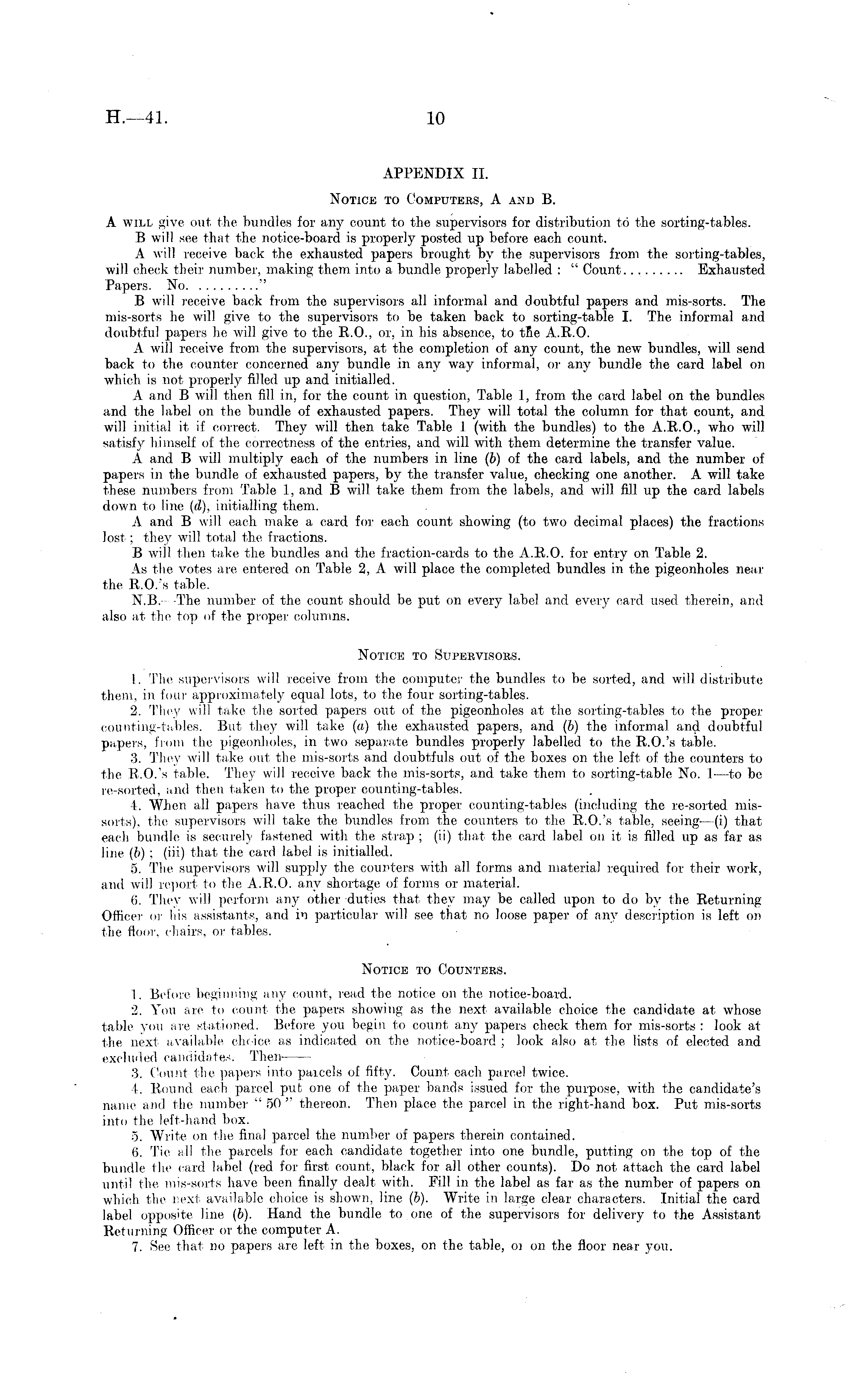APPENDIX 11. Notice to Computers, A and B. A will give out the bundles for any count to the supervisors for distribution to the sorting-tables. B will see that the notice-board is properly posted up before each count. A will receive back the exhausted papers brought by the supervisors from the sorting-tables, will check their number, making them into a bundle properly labelled : " Count Exhausted Papers. No " B will receive back from the supervisors all informal and doubtful papers and mis-sorts. The mis-sorts he will give to the supervisors to be taken back to sorting-table I. The informal and doubtful papers he will give to the R. 0., or, in his absence, to the A.8.0. A will receive from the supervisors, at the completion of any count, the new bundles, will send back to the counter concerned any bundle in any way informal, or any bundle the card label on which is not properly filled up and initialled. A and B will then fill in, for the count in question, Table 1, from the card label on the bundles and the label on the bundle of exhausted papers. They will total the column for that count, and will initial it if correct. They will then take Table I (with the bundles) to the A.R.0., who will satisfy himself of the correctness of the entries, and will with them determine the transfer value. A and B will multiply each of the numbers in line (b) of the card labels, and the number of papers in the bundle of exhausted papers, by the transfer value, checking one another. A will take these numbers from Table 1, and B will take them from the labels, and will fill up the card labels down to line (d), initialling them. A and B will each make a card for each count showing (to two decimal places) the fractions lost; they will total the fractions. B will then take the bundles and the fraction-cards to the A.R.O. for entry on Table 2. As the votes are entered on Table 2, A will place the completed bundles in the pigeonholes near the R.O.s table. N.B. -The number of the count should be put on every label and every card used therein, and also at the top of the proper columns. Notice to Supervisors. 1. The supervisors will receive from the computer the bundles to be sorted, and will distribute them, in four approximately equal lots, to the four sorting-tables. 2. They will take the sorted papers out of the pigeonholes at the sorting-tables to the proper counting-tables. But they will take (a) the exhausted papers, and (b) the informal and doubtful papers, from the pigeonholes, in two separate bundles properly labelled to the R.O.s table. -3. They will take out the mis-sorts and doubtfuls out of the boxes on the left of the counters to the R.O.s table. They will receive back the mis-sorts, and take them to sorting-table No. I—to be re-sorted, and then taken to the proper counting-tables. 4. When all papers have thus reached the proper' counting-tables (including the re-sorted missorts), the supervisors will take the bundles from the counters to the R.O.s table, seeing— (i) that each bundle is securely fastened with the strap ; (ii) that the card label on it is filled up as far as line (b) ; (iii) that the card label is initialled. 5. The supervisors will supply the counters with all forms and material required for their work, and will report to the A.R.O. any shortage of forms or material. 6. They will perform any other duties that they may be called upon to do by the Returning Officer oi- his assistants, and in particular will see that no loose paper of any description is left on the floor, chairs, or tables. Notice to Counters. 1. Before beginning any count, read the notice on the notice-board. 2. You are to count the papers showing as the next available choice the candidate at whose table you are stationed. Before you begin to count any papers check them for mis-sorts : look at the next available choice as indicated on. the notice-board ; look also at the lists of elected and excluded candidates. Then 3. Count the papers into parcels of fifty. Count each parcel twice. 4. Round each parcel put one of the paper bands issued for the purpose, with the candidate's name and the number "50 " thereon. Then place the parcel in the right-hand box. Put mis-sorts into the left-hand box. 5. Write on the final parcel the number of papers therein contained. 6. Tie all the parcels for each candidate together into one bundle, putting on the top of the bundle the card label (red for first count, black for all other counts). Do not attach the card label until the mis-sorts have been finally dealt with. Eill in the label as far as the number of papers on which the next available choice is shown, line (b). Write in large clear characters. Initial the card label opposite line (b). Hand the bundle to one of the supervisors for delivery to the Assistant Returning Officer or the computer A. 7. See that no papers are left in. the boxes, on the table, oi on the floor near you.