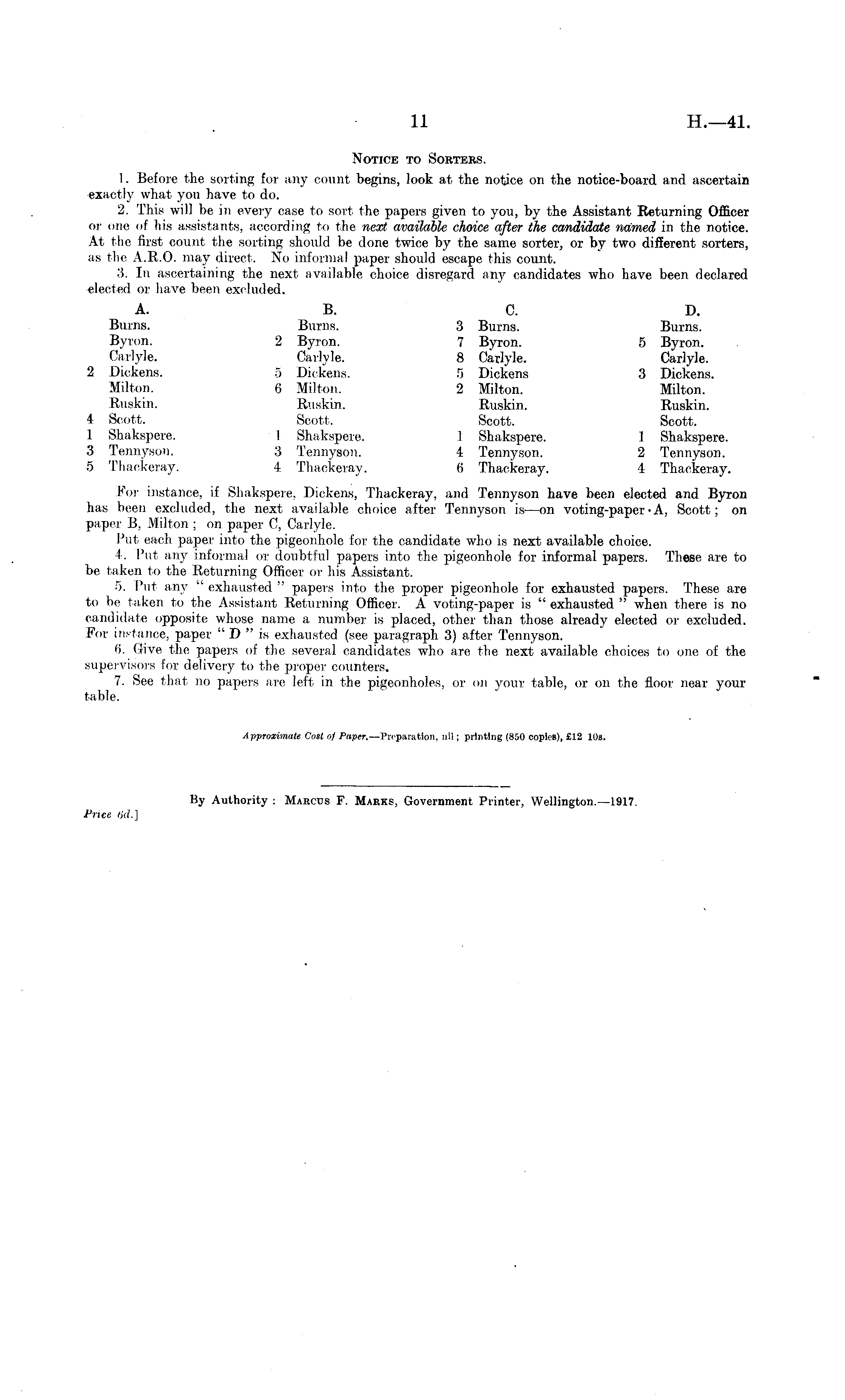 Notice to Sorters. 1. Before the sorting for any count begins, look at the notice on the notice-board and ascertain exactly what you have to do. 2. This will be in every case to sort the papers given to you, by the Assistant Returning Officer or one of his assistants, according to the next available choice after the candidate named in the notice. At the first count the sorting should be done twice by the same sorter, or by two different sorters, as the 3AR.O. may direct. No informal paper should escape this count. 3. In ascertaining the next available choice disregard any candidates who have been declared elected or have been excluded. A. B. C. D. Burns. Burns. 3 Burns. Burns. Byron. 2 Byron. 7 Byron. 5 Byron. Carlyle. Carlyle. 8 Carlyle. Carlyle. 2 Dickens. 5 Dickens. 5 Dickens 3 Dickens. Milton. 6 Milton. 2 Milton. Milton. Ruskin. Ruskin. Ruskin. Ruskin. 4 Scott. Scott. Scott. Scott. 1 Shakspere. I Shakspere. .1 Shakspere. 1 Shakspere. 3 Tennyson. 3 Tennyson. 4 Tennyson. 2 Tennyson. 5 Thackeray. 4 Thackeray. 6' Thackeray. 4 Thackeray. For instance, if Shakspere, Dickens, Thackeray, and Tennyson have been elected and Byron has been excluded, the next available choice after Tennyson is-—on voting-paper• A, Scott; on paper B, Milton ; on paper C, Carlyle. Put each paper into the pigeonhole for the candidate who is next available choice. 4. Put any informal or doubtful papers into the pigeonhole for informal papers. These are to be taken to the Returning Officer or his Assistant. 5. Put any " exhausted " papers into the proper pigeonhole for exhausted papers. These are to be taken to the Assistant Returning Officer. A voting-paper is " exhausted " when there is no candidate opposite whose name a number is placed, other than those already elected or excluded. For instance, paper " D " is exhausted (see paragraph 3) after Tennyson. 6. Give the papers of the several candidates who are the next available choices to one of the supervisors for delivery to the proper counters. 7. See that no papers are left in the pigeonholes, or on your table, or on the floor near your table.