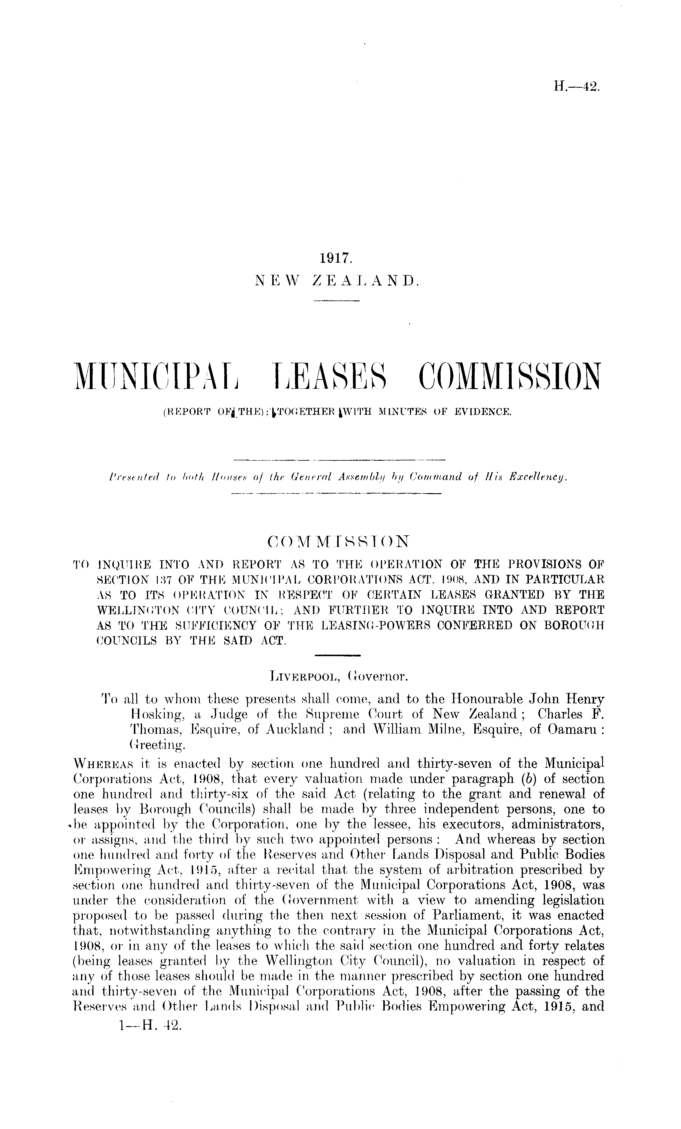 COMMISSION TO INQUIRE INTO AND REPORT AS TO THE OPERATION OF THE PROVISIONS OP SECTION 137 OF THE MUNICIPAL CORPORATIONS ACT, 1908, AND IN PARTICULAR AS TO ITS OPERATION IN RESPECT OF CERTAIN LEASES GRANTED BY THE WELLINGTON CITY COUNCIL; AND FURTHER TO INQUIRE INTO AND REPORT AS TO THE SUFFICIENCY OF THE LEASING-POWERS CONFERRED ON BOROUGH COUNCILS BY THE SAID ACT. Liverpool, Governor. To all to whom these presents shall come, and to the Honourable John Henry Hosking, a Judge of the Supreme Court of New Zealand ; Charles P. Thomas, Esquire, of Auckland ; and William Milne, Esquire, of Oamaru : Greeting. Whereas it is enacted by section one hundred and thirty-seven of the Municipal Corporations Act, 1908, that every valuation made under paragraph (b) of section one hundred and thirty-six of the said Act (relating to the grant and renewal of leases by Borough Councils) shall be made by three independent persons, one to be appointed by the Corporation, one by the lessee, his executors, administrators, or assigns, and the third by such two appointed persons : And whereas by section one hundred and forty of the Reserves and Other Lands Disposal and Public Bodies Empowering Act, 1915, after a recital that the system of arbitration prescribed by section one hundred and thirty-seven of the Municipal Corporations Act, 1908, was under the consideration of the Government with a view to amending legislation proposed to be passed during the then next session of Parliament, it was enacted that, notwithstanding anything to the contrary in the Municipal Corporations Act, 1908, or in any of the leases to which the said section one hundred and forty relates (being leases granted by the Wellington. City Council), no valuation in respect of any of those leases should be made in the manner prescribed by section one hundred and thirty-seven of the Municipal Corporations Act, 1908, after the passing of the Eeserves and Other Lands Disposal and Public Bodies Empowering Act, 1915, and