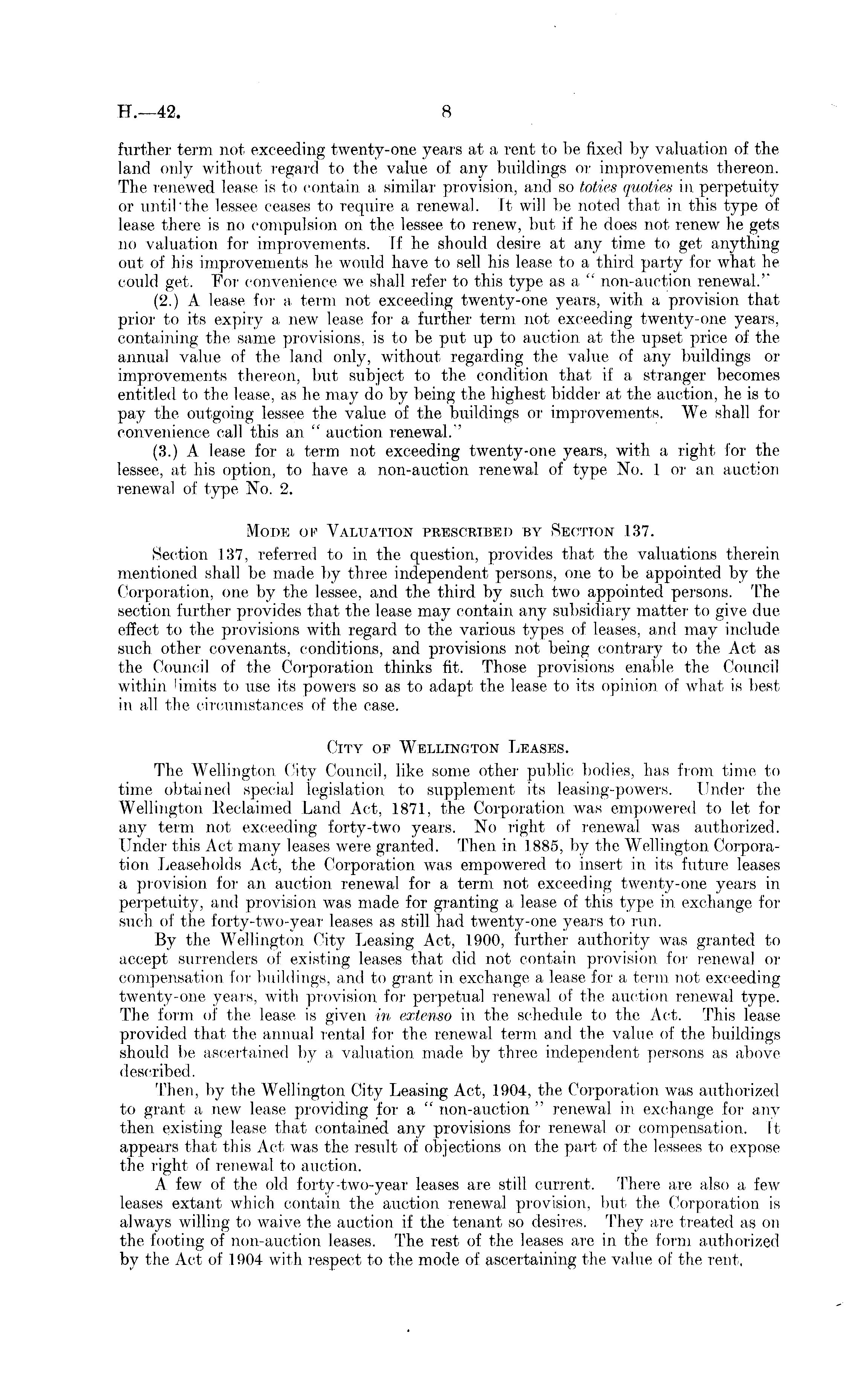 further term not exceeding twenty-one years at a rent to be fixed by valuation of the land only without regard to the value of any buildings or improvements thereon. The renewed lease is to contain a similar provision, and so toties quoties in perpetuity or until'the lessee ceases to require a renewal. It will be noted that in this type of lease there is no compulsion on the lessee to renew, but if he does not renew he gets no valuation for improvements. If he should desire at any time to get anything out of his improvements he would have to sell his lease to a third party for what he could get. For convenience we shall refer to this type as a " non-auction renewal." (2.) A lease for a term not exceeding twenty-one years, with a provision that prior to its expiry a new lease for a further term not exceeding twenty-one years, containing the same provisions, is to be put up to auction, at the upset price of the annual value of the land only, without regarding the value of any buildings or improvements thereon, but subject to the condition that if a stranger becomes entitled to the lease, as he may do by being the highest bidder at the auction, he is to pay the outgoing lessee the value of the buildings or improvements. We shall for convenience call this an " auction renewal." (3.) A lease for a term not exceeding twenty-one years, with a right for the lessee, at his option, to have a non-auction renewal of type No. 1 or an auction renewal of type No. 2. Mode of Valuation prescribed by Section 137. Section 137, referred to in the question, provides that the valuations therein mentioned shall be made by three independent persons, one to be appointed by the Corporation, one by the lessee, and the third by such two appointed persons. The section further provides that the lease may contain any subsidiary matter to give clue effect to the provisions with regard to the various types of leases, and may include such other covenants, conditions, and provisions not being contrary to the Act as the Council of the Corporation thinks fit. Those provisions enable the Council within limits to use its powers so as to adapt the lease to its opinion, of what is best in all the circumstances of the case. City of Wellington Leases. The Wellington City Council, like some other public bodies, has from time to time obtained special legislation, to supplement its leasing-powers. Under the Wellington Reclaimed Land Act, 1871, the Corporation was empowered to let for any term not exceeding forty-two years. No right of renewal was authorized. Under this Act many leases were granted. Then in 1885, by the Wellington Corporation Leaseholds Act, the Corporation was empowered to insert in. its future leases a provision for an auction renewal for a term not exceeding twenty-one years in perpetuity, and provision was made for granting a lease of this type in. exchange for such of the forty-two-year leases as still had twenty-one years to run. By the Wellington City Leasing Act, 1900, further authority was granted to accept surrenders of existing leases that did not contain provision for renewal or compensation for buildings, and to grant in exchange a lease for a term not exceeding twenty-one years, with provision for perpetual renewal of the auction renewal type. The form of the lease is given in extenso in. the schedule to the Act. This lease provided that the annual rental for the renewal term and the value of the buildings should be ascertained by a valuation made by three independent persons as above described. Then, by the Wellington City Leasing Act, 1904, the Corporation was authorized to grant a new lease providing for a " non-auction " renewal in exchange for any then, existing lease that contained any provisions for renewal or compensation. It. appears that this Act was the result of objections on. the part of the lessees to expose the right of renewal to auction. A. few of the old forty-two-year leases are still current. There are also a few leases extant which contain the auction renewal provision, but the Corporation is always willing to waive the auction if the tenant so desires. They are treated as on the footing of non-auction leases. The rest of the leases are in the form authorized by the Act of 1904 with respect to the mode of ascertaining the value of the rent,