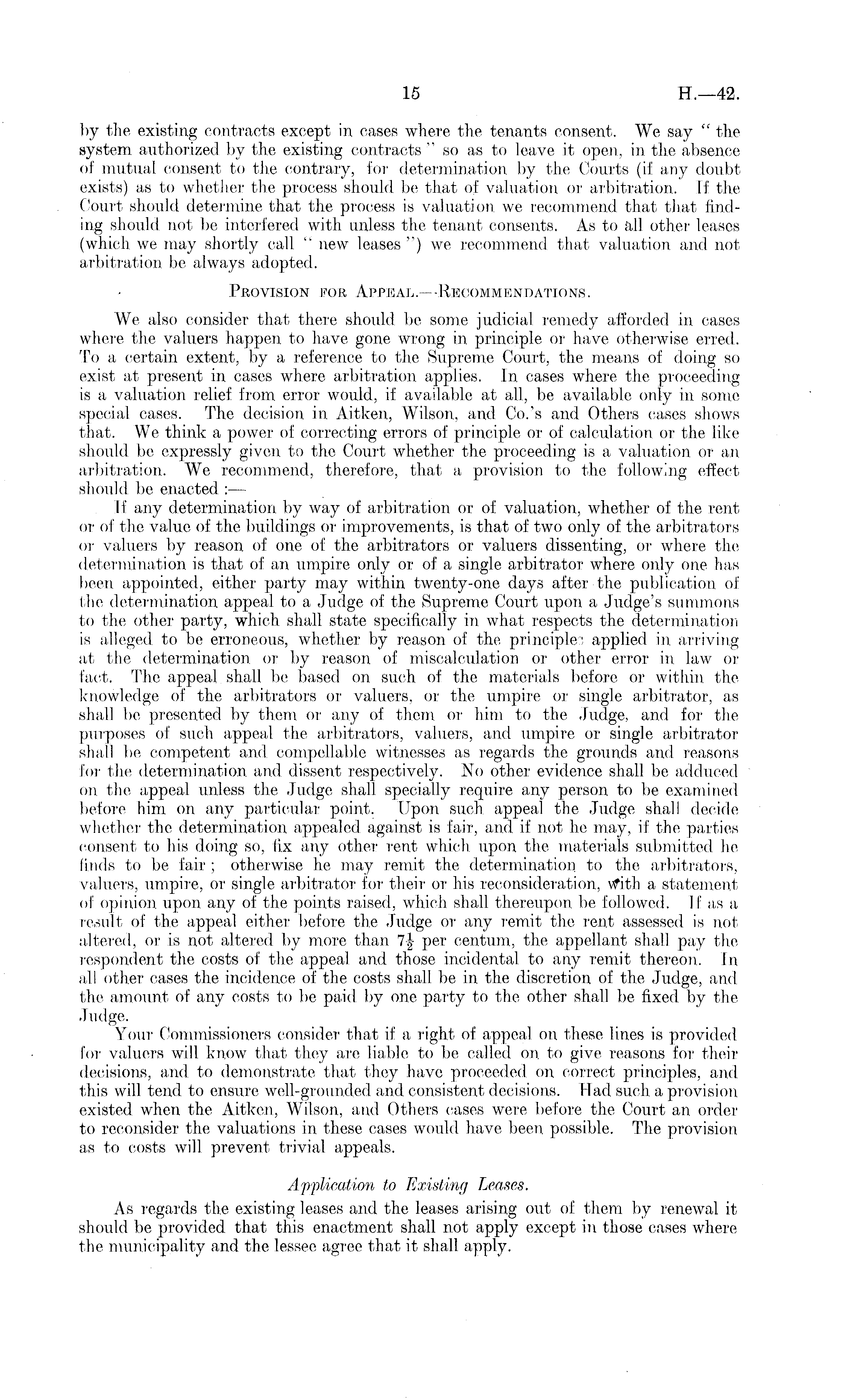 by the existing contracts except in cases where the tenants consent. We say " the system authorized by the existing contracts " so as to leave it open, in the absence of mutual consent to the contrary, for determination by the Courts (if any doubt exists) as to whether the process should be that of valuation or arbitration. If the Court should determine that the process is valuation we recommend that that finding should not be interfered with unless the tenant consents. As to all other leases (which we may shortly call " new leases ") we recommend that valuation and not arbitration be always adopted. Provision por Ai>peal.—- Recommendations . We also consider that there should be some judicial remedy afforded in cases where the valuers happen to have gone wrong in, principle or have otherwise erred. To a certain extent, by a reference to the Supreme Court, the means of doing so exist at present in cases where arbitration, applies. In cases where the proceeding is a valuation relief from error would, if available at all, be available only in some special cases. The decision in. Aitken, Wilson, and Co.'s and Others cases shows that. We think a power of correcting errors of principle or of calculation or the like should be expressly given to the Court whether the proceeding is a valuation, or an arbitration. We recommend, therefore, that a provision to the following effect should be enacted :— If any determination by way of arbitration or of valuation, whether of the rent or of the value of the buildings or improvements, is that of two only of the arbitrators or valuers by reason of one of the arbitrators or valuers dissenting, or where the determination is that of an umpire only or of a single arbitrator where only one has been appointed, either party may within twenty-one days after the publication of the determination appeal to a Judge of the Supreme Court upon a Judge's summons to the other party, which, shall state specifically in what respects the determination is alleged to be erroneous, whether by reason of the principle; applied in arriving at the determination or by reason of miscalculation or other error in law or fact. The appeal shall be based on such of the materials before or within, the knowledge of the arbitrators or valuers, or the umpire or single arbitrator, as shall be presented by them or any of them or him to the Judge, and for the purposes of such appeal the arbitrators, valuers, and umpire or single arbitrator shall be competent and compellable witnesses as regards the grounds and reasons for the determination and dissent respectively. No other evidence shall be adduced on, the appeal unless the Judge shall specially require any person to be examined before him on any particular point. Upon such appeal the Judge shall decide whether the determination appealed against is fair, and if not he may, if the parties consent to his doing so, fix any other rent which upon the materials submitted he finds to be fair ; otherwise he may remit the determination, to the arbitrators, valuers, umpire, or single arbitrator for their or his reconsideration, with a statement of opinion, upon any of the points raised, which shall thereupon be followed. If as a result of the appeal either before the Judge or any remit the rent assessed is not altered, or is not altered by more than 1\ per centum, the appellant shall pay the respondent the costs of the appeal and those incidental to any remit thereon. In all other cases the incidence of the costs shall be in the discretion of the Judge, and the amount of any costs to be paid by one party to the other shall be fixed by the Judge. Your Commissioners consider that if a right of appeal on these lines is provided for valuers will know that they are liable to be called on to give reasons for their decisions, and, to demonstrate that they have proceeded on correct principles, and this will tend to ensure well-grounded and consistent decisions. Had such a provision existed when the Aitken, Wilson, and Others cases were before the Court an, order to reconsider the valuations in these cases would have been, possible. The provision as to costs will prevent trivial appeals. Application to Existing Leases. As regards the existing leases and the leases arising out of them by renewal it should be provided that this enactment shall not apply except in those cases where the municipality and the lessee agree that it shall apply.