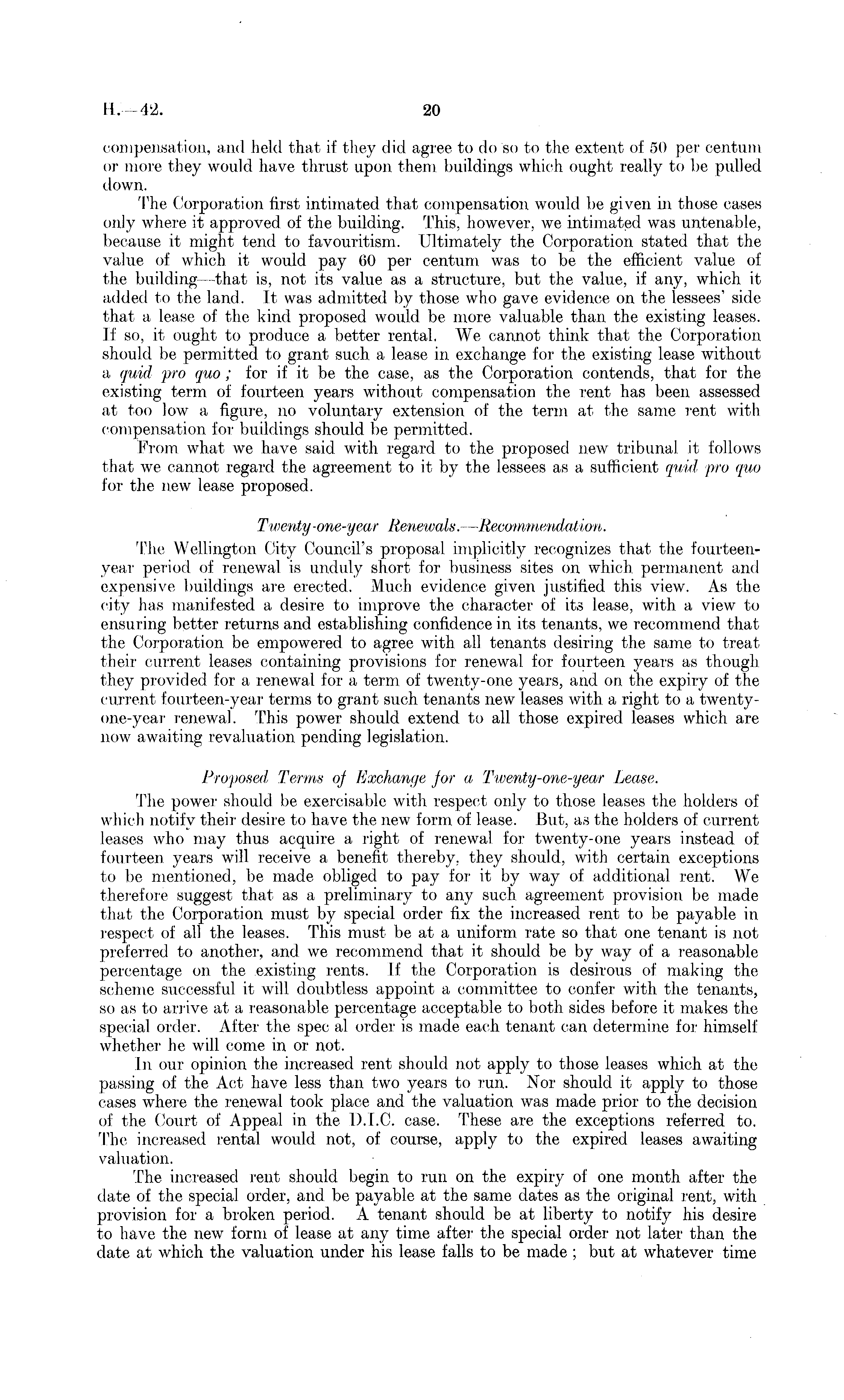 compensation, and held that if they did agree to do so to the extent of 50 per centum or more they would have thrust upon them buildings which ought really to be pulled down. The Corporation first intimated that compensation would be given in those cases only where it approved of the building. This, however, we intimated was untenable, because it might tend to favouritism. Ultimately the Corporation stated that the value of which it would pay 60 per centum was to be the efficient value of the building—that is, not its value as a structure, but the value, if any, which it added to the land. It was admitted by those who gave evidence on the lessees' side, that a lease of the kind proposed would be more valuable than the existing leases. If so, it ought to produce a better rental. AYe cannot think that the Corporation should be permitted to grant such a lease in exchange for the existing lease without a quid pro quo; for if it be the case, as the Corporation contends, that for the existing term of fourteen years without compensation the rent has been assessed at too low a figure, no voluntary extension of the term at the same rent with compensation for buildings should be permitted. From what, we have said with regard to the proposed new tribunal it follows that we cannot regard the agreement to it by the lessees as a sufficient quid pro quo for the new lease proposed. Twenty-one-year Renewals. — Recommendation. The Wellington City Council's proposal implicitly recognizes that the fourteenyear period of renewal is unduly short for business sites on which permanent and expensive buildings are erected. Much evidence given justified this view. As the city has manifested a desire to improve the character of its lease, with a view to ensuring better returns and establishing confidence in its tenants, we recommend that the Corporation be empowered to agree with all tenants desiring the same to treat their current leases containing provisions for renewal, for fourteen years as though they provided for a renewal for a term of twenty-one years, and on the expiry of the current fourteen-year terms to grant such tenants new leases with a right to a twenty-one-year renewal. This power should extend to all those expired leases which are now awaiting revaluation pending legislation. Proposed Terms oj Exchange jor a Twenty-one-year Lease. The power should be exercisable with, respect only to those leases the holders of which notify their desire to have the new form of lease. But, as the holders of current leases who may thus acquire a right of renewal for twenty-one years instead of fourteen years will receive a benefit thereby, they should, with certain exceptions to be mentioned, be made obliged to pay for it by way of additional rent. We therefore suggest that as a preliminary to any such agreement provision be made that the Corporation must by special order fix the increased rent to be payable in respect of all the leases. This must be at a uniform rate so that one tenant is not preferred to another, and we recommend that it should be by way of a reasonable percentage on the existing rents. If the Corporation is desirous of making the scheme successful it will doubtless appoint a committee to confer with the tenants, so as to arrive at, a reasonable percentage acceptable to both sides before it makes the special order. After the spec al order is made each tenant can determine for himself whether he will come in or not. In our opinion the increased rent should not apply to those leases which at the passing of the Act have less than two years to run. Nor should it apply to those cases where the renewal took place and the valuation was made prior to the decision of the Court of Appeal in the D.I.C. case. These are the exceptions referred to. The increased rental would not, of course, apply to the expired leases awaiting valuation. The increased rent should begin to run on the expiry of one month after the date of the special order, and be payable at the same dates as the original rent, with provision for a broken period. A tenant should be at liberty to notify his desire to have the new form of lease at any time after the special order not later than the date at which the valuation under his lease falls to be made ; but at whatever time