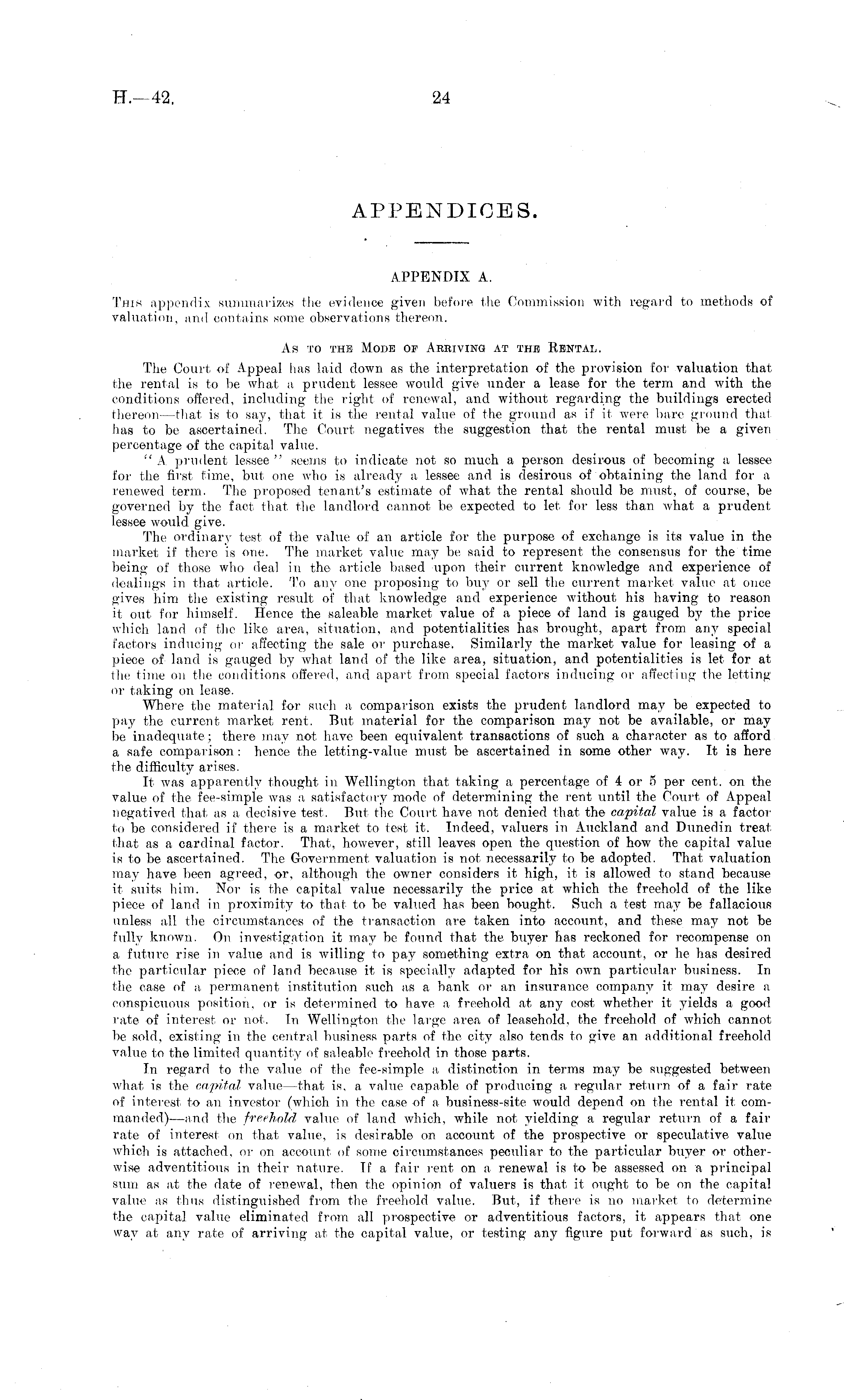 APPENDICES. APPENDIX A. This appendix summarizes the evidence given before the Commission with regard to methods of valuation, unci contains .some observations thereon. As to the Mode op Arbiving at the Rental. The Court of Appeal lias laid down as the interpretation of the provision for valuation that the rental is to be what a prudent lessee would give under a lease for the term and with the conditions offered, including the right of renewal, and without- regarding the buildings erected thereon—that is to say, that it is the rental value of the ground as if it were bare ground thai has to be ascertained. The Court negatives the suggestion that the rental must be a given percentage of the capital value. " A prudent lessee " seems to indicate not so much a person desirous of becoming a lessee for the first time, but one who is already a, lessee and is desirous of obtaining the land for a renewed term. The proposed tenant's estimate, of what the rental should be must, of course, be governed by the fact that, the landlord cannot bo expected to let for less than what a prudent, lessee would give. The ordinary test of the value of an article for the purpose of exchange is its value in the market if there is one. The market value may be said to represent the consensus for the time being of those who deal in the article based -upon their current knowledge and experience of dealings in that article. To any one proposing to buy or sell the current market value at once gives him the existing result of that knowledge and experience without his having to reason it out for himself. Hence the saleable market value of a piece of land is gauged by the price which land of the like area, situation, and potentialities has brought, apart from any special factors inducing or affecting the sale or purchase. Similarly the market value for leasing of a piece of land is gauged by what land of the like area, situation, and potentialities is let for at the time on the conditions offered, and apart from speoial factors inducing or affecting the letting or taking on lease. Where the material for such a comparison exists the prudent, landlord may be expected to pay the current market- rent. But material for the comparison may not be available, or may be inadequate ; there may not have been equivalent transactions of such a character as to afford a safe comparison : hence the letting-value must be ascertained in some other way. It is here the difficulty arises. It was apparently thought in Wellington that taking a percentage of 4 or o per cent, on the value of the fee-simple was a, satisfactory mode of determining the rent until the Court of Appeal negatived that as a decisive test. But the Court have, not denied that the capital value is a factor to be considered if there is a market to test it. Indeed, valuers in Auckland and Dunedin treat that as a cardinal factor. That, however, still leaves open the question of how the capital value is to be ascertained. The Government, valuation is not necessarily to be adopted. That valuation may have been agreed, or, although the owner considers it high, it is allowed to stand because it suits him. Nor is the capital value necessarily the price at. which the freehold of the like piece of land in proximity to that to be valued has been bought. Such a test may be fallacious unless all the circumstances of the transaction are taken into account, and these may not be fully known. On investigation it may be found that the buyer has reckoned for recompense on a future rise in value and is willing to pay something extra on that account, or he has desired the particular piece of land because it- is specially adapted for his own particular business. In the case of a, permanent institution such as a bank or an insurance company it may desire a conspicuous position, or is determined to have a freehold at any cost whether it yields a good rate of interest, or not. In Wellington the large area of leasehold, the freehold of which cannot be sold, existing in the central business parts of the city also tends to give an additional freehold value to the limited quantity of saleable freehold in those parts. In regard to the value of the fee-simple a distinction in terms may be suggested between what, is the capital value—that is, a value capable of producing a regular return of a fair rate of interest to an investor (which in the case of a business-site would depend on the rental it commanded) —and the freehold value of land which, while not yielding a regular return of a fair rate of interest on that value, is desirable on account of the prospective or speculative value which is attached, or on account of some circumstances peculiar to the particular buyer or otherwise adventitious in their nature. If a fair rent on a renewal is to be assessed on a principal sum as at the date of renewal, then the opinion of valuers is that it ought to be on the capital value as thus distinguished from the freehold value. But, if there is no market to determine the capita] value eliminated from all prospective or adventitious factors, it appears that one way at- any rate of arriving at the capital value, or testing any figure put forward as such, is