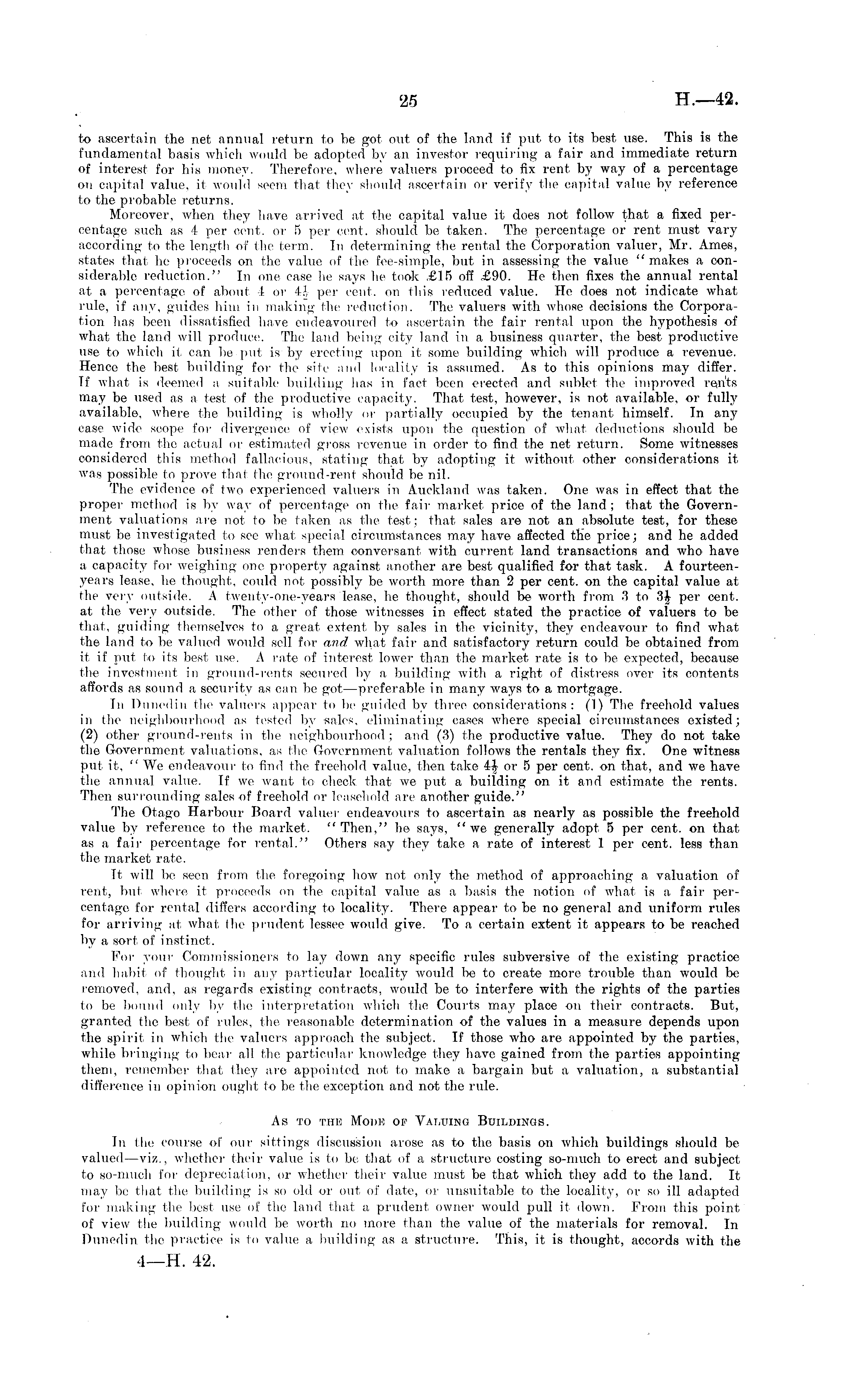 to ascertain the net annual return to be got out of the land if put to its best use. This is the fundamental basis which would be adopted by an investor requiring a fair and immediate return of interest for his money. Therefore, where valuers proceed to fix rent by way of a percentage on capital value, it would seem that they should ascertain or verify the capital value by reference to the probable returns. Moreover, when they have arrived at the capital value it does not follow that a fixed percentage such as 4 per cent, or 5 per cent, should be taken. The percentage or rent must vary according to the length of the term. In determining the rental the Corporation valuer, Mr. Ames, states that he proceeds on the value of the fee-simple, but in assessing the value " makes a considerable reduction." In one case lie says he took .£ls off .£9O. He then fixes the annual rental at a percentage of about. 4 or 4-J per cent, on this reduced value. He does not indicate what rule, if any, guides him in making the reduction. The valuers with whose decisions the Corporation has been dissatisfied have endeavoured to ascertain, the fair rental upon the hypothesis of what the land will produce. The land being city land in a business quarter, the best productive use to which it can be put is by erecting upon it some building which will produce a revenue. Hence the best building for the site and locality is assumed. As to this opinions may differ. Tf what is deemed a suitable building has in fact been erected and sublet the improved rents may be used as a test of the productive capacity. That test, however, is not available, or fully available, where the building is wholly or partially occupied by the tenant himself. In any case wide scope for divergence of view exists upon the question of what deductions should be made from the actual or estimated gross revenue in order to find the net return. Some witnesses considered this method fallacious, stating that by adopting it without, other considerations it, was possible to prove that, the ground-rent should be nil. The evidence of two experienced valuer's in Auckland was taken. One was in effect that the proper method is by way of percentage on the fair market, price of the land; that the Government valuations are not to be taken as the test; that sales are not an absolute test, for these must be investigated to see what special circumstances may have affected the price; and he added that those whose business renders them conversant with current land transactions and who have a capacity for weighing one property against another are best qualified for that task. A fourteenyears lease, he thought, could not possibly be worth more than 2 per cent, on the capital value at the very outside. A twenty-one-years lease, he thought, should be worth from 3to 3| per cent, at the very outside. The other of those witnesses in effect stated the practice of valuers to be that, guiding themselves to a great extent by sales in the vicinity, they endeavour to find what the land to be valued would sell for and what fair and satisfactory return could be obtained from it if put to its best use. A rate of interest lower than the market rate is to be expected, because the investment in ground-rents secured by a building with a right of distress over its contents affords as sound a security as can be got—preferable in many ways to a mortgage. In Dunedin the valuers appear to be guided by three considerations: (1) The freehold values in the neighbourhood as tested by sales, eliminating cases where special circumstances existed; (2) other ground-rents in the neighbourhood; and (3) the productive value. They do not take the Government valuations, as the Government valuation follows the rentals they fix. One witness put it, "We endeavour to find the freehold value, then take or 5 per cent, on that, and we have the annual value. If we want to check, that we put a building on it and estimate the rents. Then surrounding sales of freehold or leasehold are another guide." The Otago Harbour Board valuer endeavours to ascertain as nearly as possible the freehold value by reference to the market. " Then," he says, "we generally adopt 5 per cent, on that as a fair percentage for rental." Others say they take a rate of interest- 1 per cent, less than the market rate. It will be seen from the foregoing how not only the method of approaching a valuation of rent, but wdiere it proceeds on the capital value as a basis the notion of what is a fair percentage for rental differs according to locality. There appear to be no general and uniform rules for arriving at what the prudent lessee would give. To a certain extent it appears to be reached by a sort of instinct. For your Commissioners to lay down any specific rules subversive of the existing practice and habit of thought in any particular locality would be to create more trouble than would be removed, and, as regards existing contracts, would be to interfere with the rights of the parties to be bound only by the interpretation which the Courts may place on their contracts. But, granted the best of rules, the reasonable determination of the values in a measure depends upon the spirit, in which the valuers approach the subject. If those who are appointed by the parties, while bringing to bear all the particular knowledge they have gained from the parties appointing them, remember that they are appointed not to make a bargain but a valuation, a substantial difference in opinion ought to be the exception and not the rule. As to the Mode of Valuing Buildings. In the course of our sittings discussion arose as to the basis on which buildings should be valued—viz., whether their value is to be that of a structure costing so-much to erect and subject to so-much for depreciation, or whether their value must be that which they add to the land. It may be that the building is so old or out, of date, or unsuitable to the locality, or so ill adapted for makin