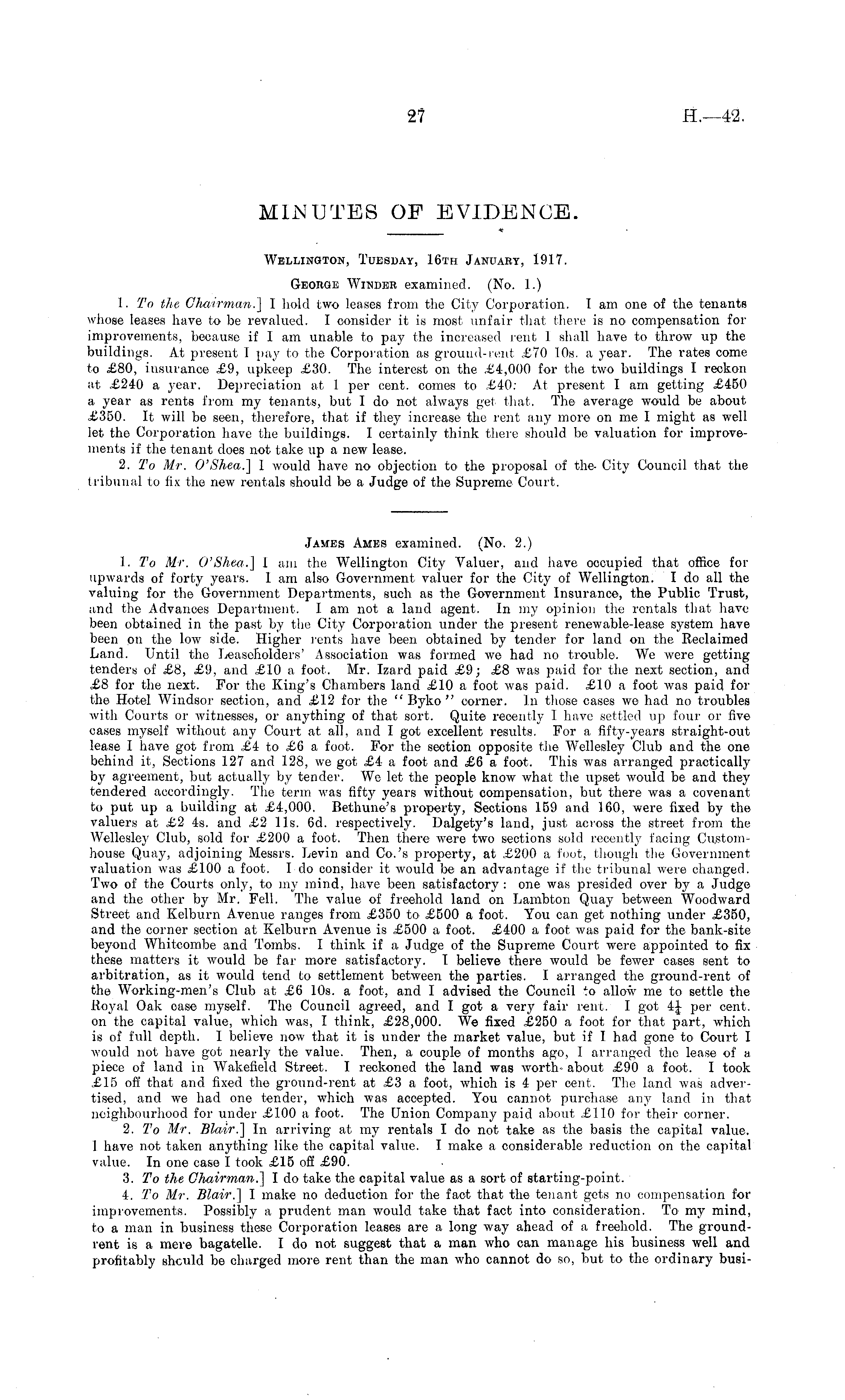 MINUTES OF EVIDENCE. Wellington, Tuesday, 16th January, 1917. George Winder examined. (No. 1.) 1. To the Chairman.] I hold two leases from the City Corporation. I am one of the tenants whose leases have to be revalued. I consider it is most unfair that there is no compensation for improvements, because if I am unable to pay the increased rent I shall have to throw up the buildings. At present I pay to the Corporation as ground-rent £70 10s. a year. The rates come to £80, insurance £9, upkeep £30. The interest on the £4,000 for the two buildings I reckon at £240 a year. Depreciation at 1 per cent, comes to £40: At present I am getting £450 a year as rents from my tenants, but I do not always get that. The average would be about £350. It will be seen, therefore, that if they increase the rent any more on me I might as well let the Corporation have the buildings. I certainly think there should be valuation for improvements if the tenant does not take up a new lease. 2. To Mr. O'Shea.] I would have no objection to the proposal of the- City Council that the tribunal to fix the new rentals should be a Judge of the Supreme Court. James Ames examined. (No. 2.) 1. To Mr. O'Shea.] I am the Wellington City Valuer, and have occupied that office for upwards of forty years. lam also Government valuer for the City of Wellington. Ido all the valuing for the Government Departments, such as the Government Insurance, the Public Trust, and the Advances Department. I am not a land agent. In my opinion the rentals that have been obtained in the past by the City Corporation under the present renewable-lease system have been on the low side. Higher rents have been obtained by tender for land on the Reclaimed Land. Until the Leaseholders' Association was formed we had no trouble. We were getting tenders of £8, £9, and £10 a foot. Mr. Izard paid £9; £8 was paid for the next section, and £8 for the next. For the King's Chambers land £10 a foot was paid. £10 a foot was paid for the Hotel Windsor section, and £12 for the " Byko " corner. In those cases we had no troubles with Courts or witnesses, or anything of that sort. Quite recently 1 have settled up four or five cases myself without any Court at. all, and I got excellent results. For a fifty-years straight-out lease I have got from £4 to £6 a foot. For the section opposite the Wellesley Club and the one behind it, Sections 127 and 128, we got £4 a foot and £6 a foot. This was arranged practically by agreement, but actually by tender. We let the people know what the upset would be and they tendered accordingly. The term was fifty years without compensation, but there was a covenant to put up a building at £4,000. Bethune's property, Sections 159 and 160, were fixed by the valuers at £2 4s. and £2 lis. 6d. respectively. Dalgety's land, just across the street from the Wellesley Club, sold for £200 a foot. Then there were two sections sold recently facing Customhouse Quay, adjoining Messrs. Levin and Co.'s property, at £200 a foot, though the Government valuation was £100 a foot. Ido consider it would be an advantage if the tribunal were changed. Two of the Courts only, to my mind, have been satisfactory : one was presided over by a Judge and the other by Mr. Fell. The value of freehold land on Lambton Quay between Woodward Street and Kelburn Avenue ranges from £350 to £500 a foot. You can get nothing under £350, and the corner section at Kelburn Avenue is £500 a foot. £400 a foot was paid for the bank-site beyond Whitcombe and Tombs. I think if a Judge of the Supreme Court were appointed to fix these matters it would be far more satisfactory. I believe there would be fewer cases sent to arbitration, as it would tend to settlement between the parties. I arranged the ground-rent of the Working-men's Club at £6 10s. a foot, and I advised the Council to allow me to settle the Royal Oak case myself. The Council agreed, and I got a very fair rent. I got 4J per cent. on the capital value, which was, I think, £28,000. We fixed £250 a foot for that part, which is of full depth. I believe now that it is under the market value, but if I had gone to Court I would not have got nearly the value. Then, a couple of months ago, I arranged the lease of a piece of land in Wakefield Street. I reckoned the land was worth- about £90 a foot. I took £15 off that and fixed the ground-rent at £3 a foot, which is 4 per cent. The land was advertised, and we had one tender, which was accepted. You cannot purchase any land in that neighbourhood for under £100 a foot. The Union Company paid, about £110 for their corner. 2. To Mr. Blair.] In arriving at my rentals I do not take as the basis the capital value. 1 have not taken anything like the capital value. I make a considerable reduction on the capital value. In one case I took £15 off £90. 3. To the Chairman.] I do take the capital value as a sort of starting-point. 4. To Mr. Blair.] I make no deduction for the fact that the tenant gets no compensation for improvements. Possibly a prudent man would take that fact into consideration. To my mind, to a man in business these Corporation leases are a long way ahead of a freehold. The groundrent is a mere bagatelle. I do not suggest that a man who can manage his business well and profitably should be charged more rent than the man who cannot do so, but to the ordinary busi-