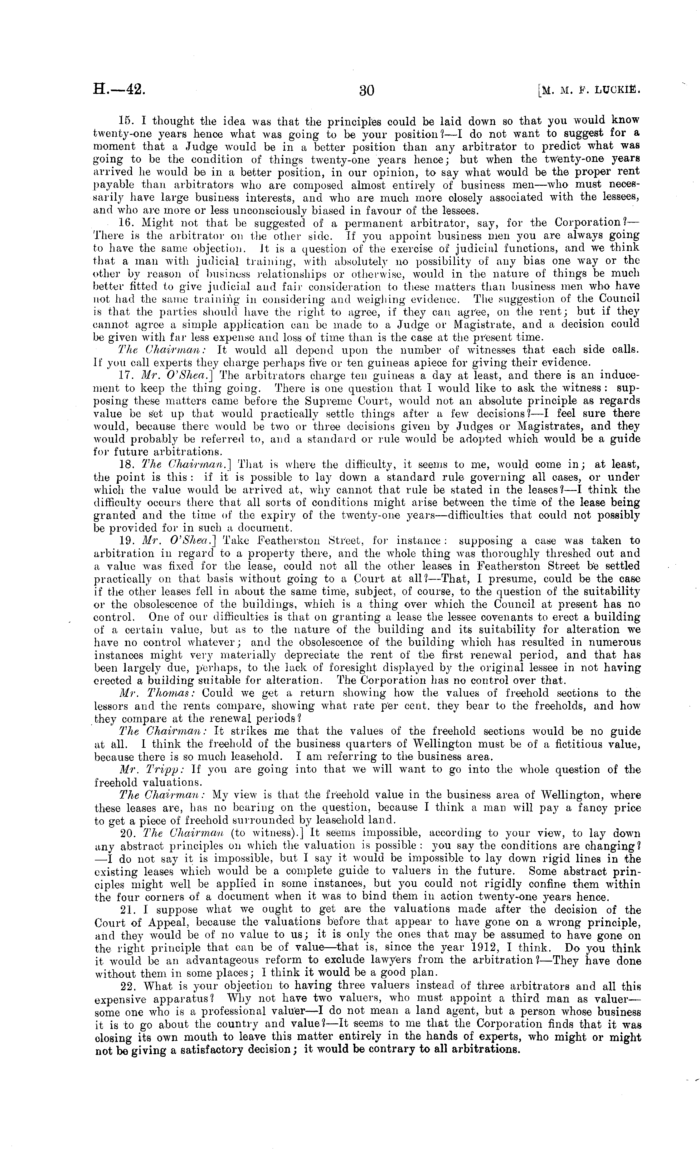 15. I thought the idea was that the principles could be laid down so that you would know twenty-one years hence what was going to be your position? —I do not want to suggest for a moment that a Judge would be in a better position than any arbitrator to predict what was going to be the condition of things twenty-one years hence; but when the twenty-one years arrived he would be in a better position, in our opinion, to say what would be the proper rent payable than arbitrators who are composed almost entirely of business men —who must necessarily have large business interests, and who are much more closely associated with the lessees, and who are more or less unconsciously biased in favour of the lessees. 16. Might not that be suggested of a permanent arbitrator, say, for the Corporation? — There is the arbitrator on the other side. If you appoint business men you are always going to have the same objection. It is a question of the exercise of judicial functions, and we think that a man with judicial training, with absolutely no possibility of any bias one way or the other by reason of business relationships or otherwise, would in the nature of things be much better fitted to give judicial and fair consideration to these matters than business men who have not had the same training in considering and weighing evidence. The suggestion of the Council is that the parties should have the right to agree, if they can agree, on the rent; but if they cannot agree a simple application can be made to a Judge or Magistrate, and a decision could be given with far less expense and loss of time than is the case at the present time. The Chairman: It would all depend upon the number of witnesses that each side calls. If you call experts they charge perhaps five or ten guineas apiece for giving their evidence. 17. Mr. O'Shea.] The arbitrators charge ten guineas a day at least, and there is an inducement to keep the thing going. There is one question that 1 would like to ask the witness : supposing these matters came before the Supreme Court, would not an absolute principle as regards value be set up that would practically settle things after a few decisions?—l feel sure there would, because there would be two or three decisions given by Judges or Magistrates, and they would probably be referred to, and a standard or rule would be adopted which would be a guide for future arbitrations. 18. The Chairman.] That is where the difficulty, it seems to me, would come in; at least, the point is this : if it is possible to lay down a standard rule governing all cases, or under which the value would be arrived at, why cannot that rule be stated in the leases ?—I think the difficulty occurs there that all sorts of conditions might arise between the time of the lease being granted and the time of the expiry of the twenty-one years —difficulties that could not possibly be provided for in such a document. 19. Mr. O'Shea.] Take Featherston Street, for instance : supposing a case was taken to arbitration in regard to a property there, and the whole thing was thoroughly threshed out and a value was fixed for the lease, could not all the other leases in Featherston Street be settled practically on that basis without going to a Court at all? —That, I presume, could be the case if the other leases fell in about the same time, subject, of course, to the question of the suitability or the obsolescence of the buildings, which is a thing over which the Council at present has no control. One of our difficulties is that on granting a lease the lessee covenants to erect a building of a certain value, but as to the nature of the building and its suitability for alteration we have no control whatever; and the obsolescence of the building which has resulted in numerous instances might very materially depreciate the rent of the first renewal period, and that has been largely due, perhaps, to the lack of foresight displaj'ed b}' the original lessee in not having erected a building suitable for alteration. The Corporation has no control over that. Mr. Thomas: Could we get a. return showing how the values of freehold sections to the lessors and the rents compare, showing what rate per cent, they bear to the freeholds, and how they compare at the renewal periods? The Chairman: It strikes me that the values of the freehold sections would be no guide at all. I think the freehold of the business quarters of Wellington must be of a fictitious value, because there is so much leasehold. lam referring to the business area. Mr. Tripp: If you are going into that we will want to go into the whole question of the freehold valuations. The Chairman: My view is that the freehold value in the business area of Wellington, where these leases are, has no bearing on the question, because I think a man will pay a fancy price to get a piece of freehold surrounded by leasehold land. 20. The Chairman (to witness).] It seems impossible, according to your view, to lay down any abstract principles on which the valuation is possible : you say the conditions are changing? —I do not say it is impossible, but 1 say it would be impossible to lay down rigid lines in the existing leases which would be a complete guide to valuers in the future. Some abstract principles might well be applied in some instances, but you could not rigidly confine them within the four corners of a document when it was to bind them in action twenty-one years hence. 21. I suppose what we ought to get are the valuations made after the decision of the Court of Appeal, because the valuations before that appear to have gone on a wrong principle, and they would be of no value to us; it is only the ones that may be assumed to have gone on the right principle that can be of value—that is, since the year 1912, I think. Do you think it, would be an advantageous reform to exclude lawyers from the arbitration ?—They have done without them in some places; I think it would be a good plan. 22.