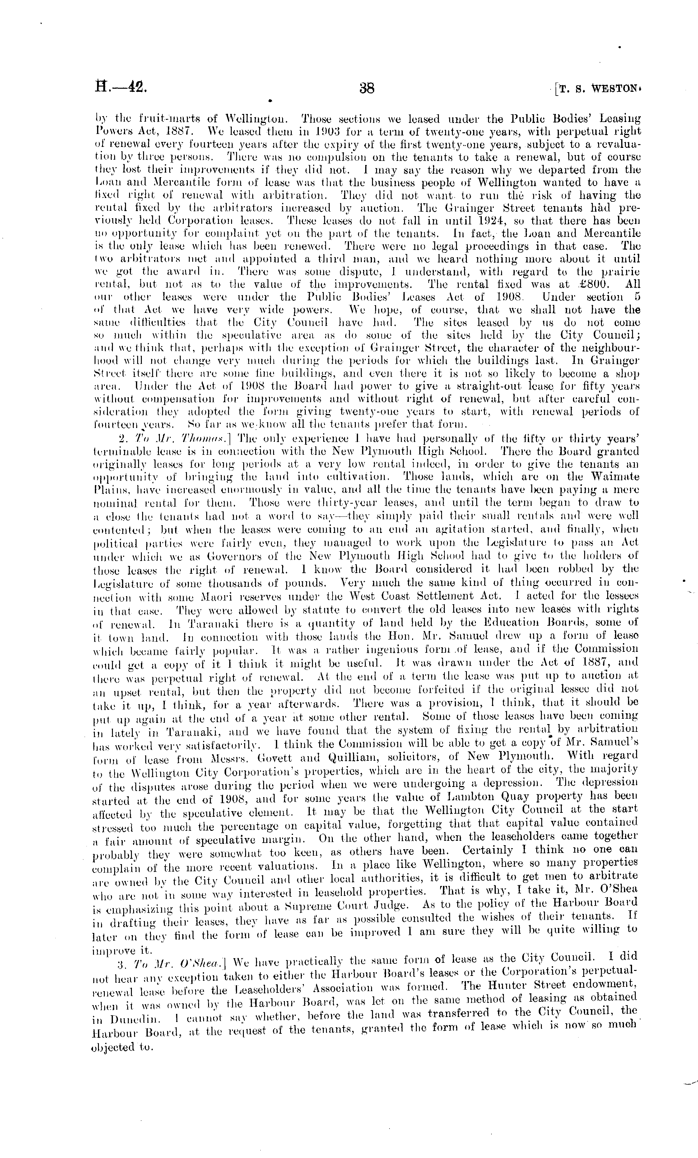 by the fruit-marts of Wellington. Those sections we leased under the Public Bodies' Leasing Powers Act, 1887. We leased them in 1903 for a term of twenty-one years, with perpetual right of renewal every fourteen years after the expiry of the first twenty-one years, subject to a revaluation by three persons. There was no compulsion on the tenants to take a renewal, but of course (hey lost their improvements if they did not. J may say the reason why we departed from the Loan and Mercantile form of lease was that (fie business people of Wellington wanted to have a lixed right of renewal with arbitration. They did not want, to run the risk of having the rental fixed by the arbitrators increased by auction. The Grainger Street tenants had previously held Corporation leases. These leases do not fall in until 1924, so that there has been no opportunity for complaint yet on the part of the tenants. In fact, the Loan and Mercantile is the only lease which has been renewed. There were no legal proceedings in that case. The Iwo arbitrators met and appointed a third man. and we heard nothing more about it until we got the award in. There was some dispute, I understand, with regard to the prairie rental, but not as to the value of the improvements. The rental fixed was at £800. All our other leases were under the Public Bodies' Leases Act of 1908. Under section 5 of thai Act we have very wide [lowers. We hope, of course, that, we shall not have the same difficulties that the City Council have had. The sites leased by us do not come so much within the speculative area as do some of the sites held by the City Council; and we think that, perhaps with the exception of Grainger Street, the character of the neighbourhood will not change very much during the periods for which the buildings last. In Grainger Street itself' there are some line buildings, and even there it is not, so likely to become a shop area. Under the Act of 1908 the Board had power to give a straight-out lease for fifty years without compensation for improvements and without right of renewal, but after careful consideration they adopted the form giving twenty-one years to start, with renewal periods of fourteen years. So far as weknow all the tenants prefer that form. 2. To Mr. Thomas.] The only experience I have had personally of the fifty or thirty year's' terminable lease is in connection with the New Plymouth High School. There the Board granted originally leases for long periods at. a very low rental indeed, in order to give' the tenants an opportunity of bringing the land into cultivation. Those lands, which are on the Waimale I'lains, have increased enormously in value, and all the time the tenants have been paying a mere nominal rental foi' them. Those were thirty-year leases, ami until the term began to draw to a close the tenants had not, a weird to say —they simply paid their small rentals anil were well contented; lint when the leases were coining to an end an agitation started, and finally, when political parties were fairly even, they managed to work upon the Legislature to pass an Act under which we as Governors of the New Plymouth High School had to give to the holders of those leases the right of renewal. I know the Board considered it had been robbed by the Legislature of some thousands of pounds. Vviy much the same kind of thing occurred in connection with some Maori reserves under the West Coast Settlement Act. I acted for the lessees in that case. They were allowed by statute to convert the old leases into new leases with rights of renewal. In Taranaki there is a quantity of land held by the Education Boards, some of it town land. In connection with those lands the Hon. Mr. Samuel drew up a form of lease which became fairly popular. It was a rather ingenious form .of lease, and if (lie Commission could get a copy of it 1 think it might be, useful. It was drawn under the Act of 1887, and there was perpetual, right of renewal. At the end of a term the lease was put up to auction at an upset rental, but then the property did not become forfeited if the original lessee did not t a i_ e it up, I think, for a year afterwards. There was a provision, I think, that it should be put up again at the end of a year at some other rental. Some of those leases have been coining in lately "in Taranaki, and we have found that the system of fixing the rental by arbitration has worked very satisfactorily. I think the Commission will be able to get a copy of Mr. Samuel's form of lease from Messrs. Govett and Quilliam, solicitors, of New Plymouth. With regard to the Wellington City Corporation's properties, which are in the heart of the city, the majority of the disputes arose during the period when we were undergoing a depression. The depression started at the end of 1908," and for some years the value of Lambton Quay property has been affected by the speculative element. It may be that the Wellington City Council at the start stressed too much the percentage on capital value, forgetting that that capital value contained a fair amount of speculative margin. On the other hand, when the leaseholders came together probably they were somewhat too keen, as others have been. Certainly I think no one can complain of the more recent valuations. In a place like Wellington, where so many properties are owned by the City Council and other local authorities, it is difficult to get men to arbitrate who are not'in some way interested in leasehold properties. That is why. I take it, Mr. 0 Shea is emphasizing this point about; a Supreme Court Judge. As to the policy ol the Harbour Board ,„ drafting their leases, they have as far as possible consulted the wishes o their tenants. I later on they find the form of lease can be improved I am sure they will be quite willing to ""'"TVo Ur O'Shea.] We have practically the same form of lease as the City Council. I did „„ t hear any exception taken to cither the Harbour Board's leases or the Corporation 