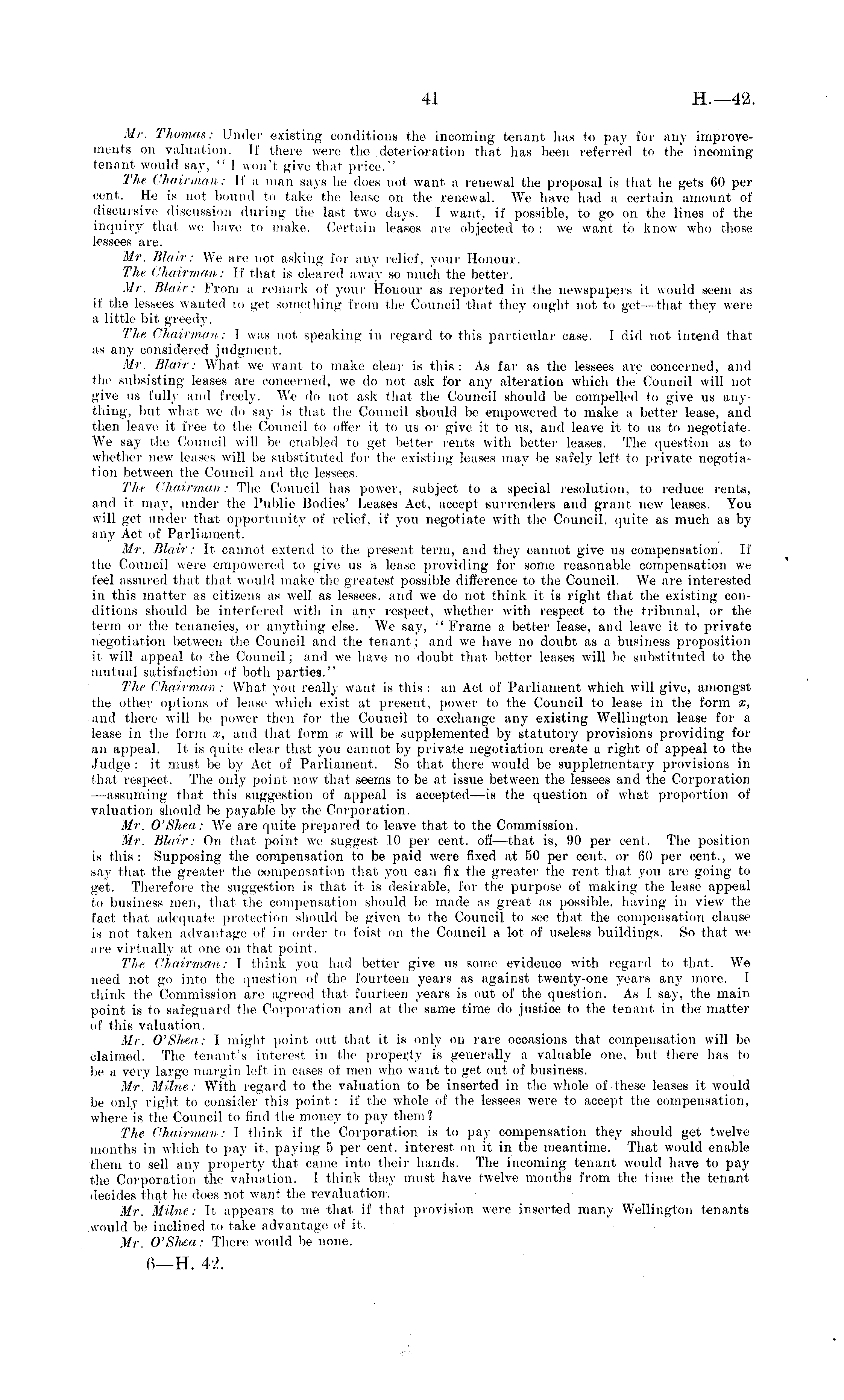Mr. Thomas: Under existing conditions the incoming tenant has to pay for any improvements on valuation. If there were the deterioration that lias been referred to the incoming tenant would say, " 1 won't give that price." The Chairman: If a man says he does not want a renewal the proposal is that he gets 60 per cent. He is not bound to take the lease on the renewal. We have had a certain amount of discursive discussion during the last two days. 1 want, if possible, to go on the lines of the inquiry that we have to make. Certain leases are objected to :we want to know who those lessees are. Mr. Blair: We are not asking for any relief, your Honour. The Chairman: If that is cleared away so much the better. Mr. Blair: From a remark of your Honour as reported in the newspapers it would seem as if the lessees wanted to get. something from the Council that they ought not to get —that they were a little bit greedy. The Chairman: I was not speaking in regard to this particular case. I did not intend that as any considered judgment. Mr. Blair: What we want to make clear is this: As far as the lessees are concerned, and the subsisting leases are concerned, we do not ask for any alteration which the Council will not give us fully and freely. We do not ask that the Council should be compelled to give us anything, but what we do say is that the Council should be empowered to make a better lease, and then leave it free to the Council to offer it to us or give it: to us, and leave it to us to negotiate. We say the Council will be enabled to get better rents with better leases. The question as to whether new leases will be substituted for the existing leases may be safely left to private negotiation between the Council and the lessees. The Chairman: The Council has power, subject to a special resolution, to reduce rents, and it may, under the Public Bodies' Leases Act, accept surrenders and grant new leases. You will get under that opportunity of relief, if you negotiate with the Council, quite as much as by any Act of Parliament. Mr. Blair: It cannot extend io the present term, and they cannot give us compensation. If the Council were empowered to give us a lease providing for some reasonable compensation we feel assured that that would make the greatest possible difference to the Council. We are interested in this matter as citizens as well as lessees, and we do not think it is right that the existing conditions should be interfered with in any respect, whether with respect to the tribunal, or the term or the tenancies, or anything else. We say, " Frame a better lease, and leave it to private negotiation between the Council and the tenant; and we have no doubt as a business proposition it will appeal to the Council; and we have no doubt that better leases will be substituted to the mutual satisfaction of both parties." The Chairman : What you really want is this : an Act of Parliament which will give, amongst the other options of lease which exist at present, power to the Council to lease in the form x, and there will be power then for the Council to exchange any existing Wellington lease for a lease in the form x, and that form x will be supplemented by statutory provisions providing for an appeal. It is quite clear that you cannot by private negotiation create a right of appeal to the Judge :it must be by Act of Parliament. So that there would be supplementary provisions in that respect. The only point now that seems to be at issue between the lessees and the Corporation —assuming that this suggestion of appeal is accepted—is the question of what proportion of valuation should be payable by the Corporation. Mr. O'Shea: We are quite prepared to leave that to the Commission. Mr. Blair: On that point we suggest 10 per cent, off—that is, 90 per cent. The position is this: Supposing the compensation to be paid were fixed at 50 per cent, or 60 per cent., we say that the greater the compensation that you can fix the greater the rent that you are going to get. Therefore the suggestion is that it is desirable, for the purpose of making the lease appeal to business men, that the compensation should be made as great as possible, having in view the fact that adequate protection should be given to the Council to see that the compensation clause is not taken advantage of in order to foist on the Council a lot of useless buildings. So that we are virtually at one on that point. The Chairman: I think you had better give us some evidence witli regard to that. We need not go into the question of tin- fourteen years as against twenty-one years any more. I think the Commission are agreed that fourteen years is out of the question. As I say, the main point is to safeguard the Corporation and at the same time do justice to the tenant in the matter of this valuation. Mr. O'Shea: I might point out that it is only on rare occasions that compensation will be claimed. The tenant's interest in the property is generally a valuable one, but there has to be a very large margin left in eases of men who want to get out of business. Mr. Milne: With regard to the valuation to be inserted in the whole of these leases it would be only right to consider this point : if the whole of the lessees were to accept the compensation, where is the Council to find the money to pay them ? The Chairman: 1 think if the Corporation is to pay compensation they should get twelve months in which to pay it, paying 5 per cent, interest on it in the meantime. That would enable them to sell any property that came into their hands. The incoming tenant would have to paj' the Corporation the valuation, I think they must have twelve months from the time the tenant decides that he docs not want the revaluation. Mr. Milne,: It appears to me that if that provision were inserted many Wellington tenants would be inclined to take advantage of it. Mr. O'Shea: There would be none.