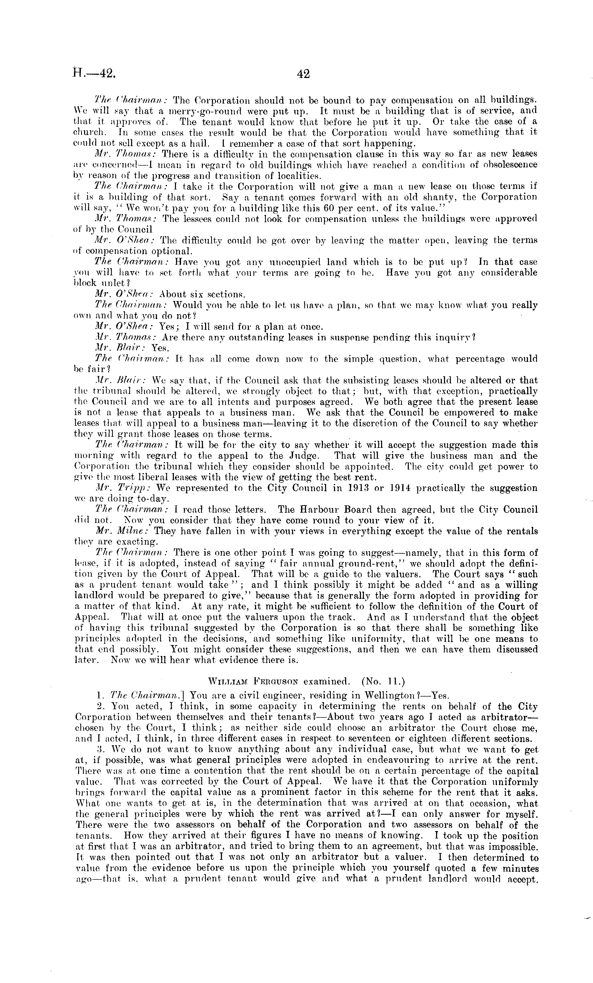 The Chairman: The Corporation should not be bound to pay compensation on all buildings. We will say that a merry-go-round were put up. It must be a building that is of service, and that it approves of. The tenant, would know that before he put it up. Or take the case of a church. In some cases the result would be that, the Corporation would have something that it could not sell except as a hail. I remember a case of that sort happening. Mr. Thomas: There is a difficulty in the compensation clause in this way so far as new leases are concerned —I mean in regard to old buildings which have reached a condition of obsolescence by reason of the progress and transition of localities. The Chairman: I take it the Corporation will not give a man a new lease on those terms if it is a building of that, sort. Say a tenant comes forward with an old shanty, the Corporation will say, " We won't pay you for a building like this 60 per cent, of its value." Mr. Thomas: The lessees could not look for compensation unless the buildings were approved of by the Council Mr. O'Shea: The difficulty could be got over by leaving the matter open, leaving the terms of compensation optional. The Chairman: Have you got any unoccupied land which is to be put up? In that case you will have to set forth what your terms are going to be. Have you got any considerable block unlet? Mr. O'Shea: About six sections. The Chairman: Would you be able to let us have a plan, so that we may know what you really own and what you do not? Mr. O'Shea: Yes; I will send for a plan at once. Mr. Thomas: Are there any outstanding leases in suspense pending this inquiry? Mr. Blair: Yes. The Chairman: It has all come down now to the simple question, what percentage would be fair ? .1/. Blair: We say that, if the Council ask that the subsisting leases should be altered or that the tribunal should be altered, we strongly object to that; but, with that exception, practically the Council and we are to all intents and purposes agreed. We both agree that the present lease is not a lease that appeals to a business man. We ask that the Council be empowered to make leases that will appeal to a business man—leaving it to the discretion of the Council to say whether they will grant those leases on those terms. The Chairman: It will be for the city to say whether it will accept the suggestion made this morning with regard to the appeal to the Judge. That will give the business man and the Corporation the tribunal which they consider should be appointed. The city could get power to give the most liberal leases with the view of getting the best rent. Mr. Tripp: We represented to the City Council in 1913 or 1914 practically the suggestion we are doing to-day. The Chairman: I read those letters. The Harbour Board then agreed, but the City Council did not. Now you consider that they have come round to your view of it. Mr. Milne: They have fallen in with your views in everything except the value of the rentals they are exacting. The Chairman : There is one other point I was going to suggest—namely, that in this form of lease, if it is adopted, instead of saying " fair annual ground-rent," we should adopt the definition given by the Court of Appeal. That will be a guide to the valuers. The Court says " such as a prudent tenant would take"; and I think possibly it might be added "and as a willing landlord would be prepared to give," because that is generally the form adopted in providing for a matter of that kind. At any rate, it might be sufficient to follow the definition of the Court of Appeal. That will at once put the valuers upon the track. And as I understand that the object of having this tribunal suggested by the Corporation is so that there shall be something like principles adopted in the decisions, and something like uniformity, that will be one means to that end possibly. You might consider these suggestions, and then we can have them discussed later. Now we will hear what evidence there is. William Ferguson examined. (No. 11.) 1. The Chairman.] You are a civil engineer, residing in Wellington?— Yes. 2. You acted, I think, in some capacity in determining the rents on behalf of the City Corporation between themselves and their tenants ?—About two years ago I acted as arbitrator— chosen by the Court, I think; as neither side could choose an arbitrator the Court chose me, and I acted, I think, in three different cases in respect to seventeen or eighteen different sections. 3. We do not want to know anything about any individual case, but what we want to get at, if possible, was what general principles were adopted in endeavouring to arrive at the rent. There was at one time a contention that the rent should be on a certain percentage of the capital value. That was corrected by the Court of Appeal. We have it that the Corporation uniformly brings forward the capital value as a prominent factor in this scheme for the rent that it asks. What one wants to get at is, in the determination that was arrived at on that occasion, what the general principles were by which the rent was arrived at ? —I can only answer for myself. There were the two assessors on behalf of the Corporation and two assessors on behalf of the tenants. How they arrived at their figures I have no means of knowing. I took up the position at first that I was an arbitrator, and tried to bring them to an agreement, but that was impossible. It was then pointed out that I was not only an arbitrator but a valuer. I then determined to value from the evidence before us upon the principle which you yourself quoted a few minutes ago—that is, what a prudent tenant would give and what a prudent landlord would accept.