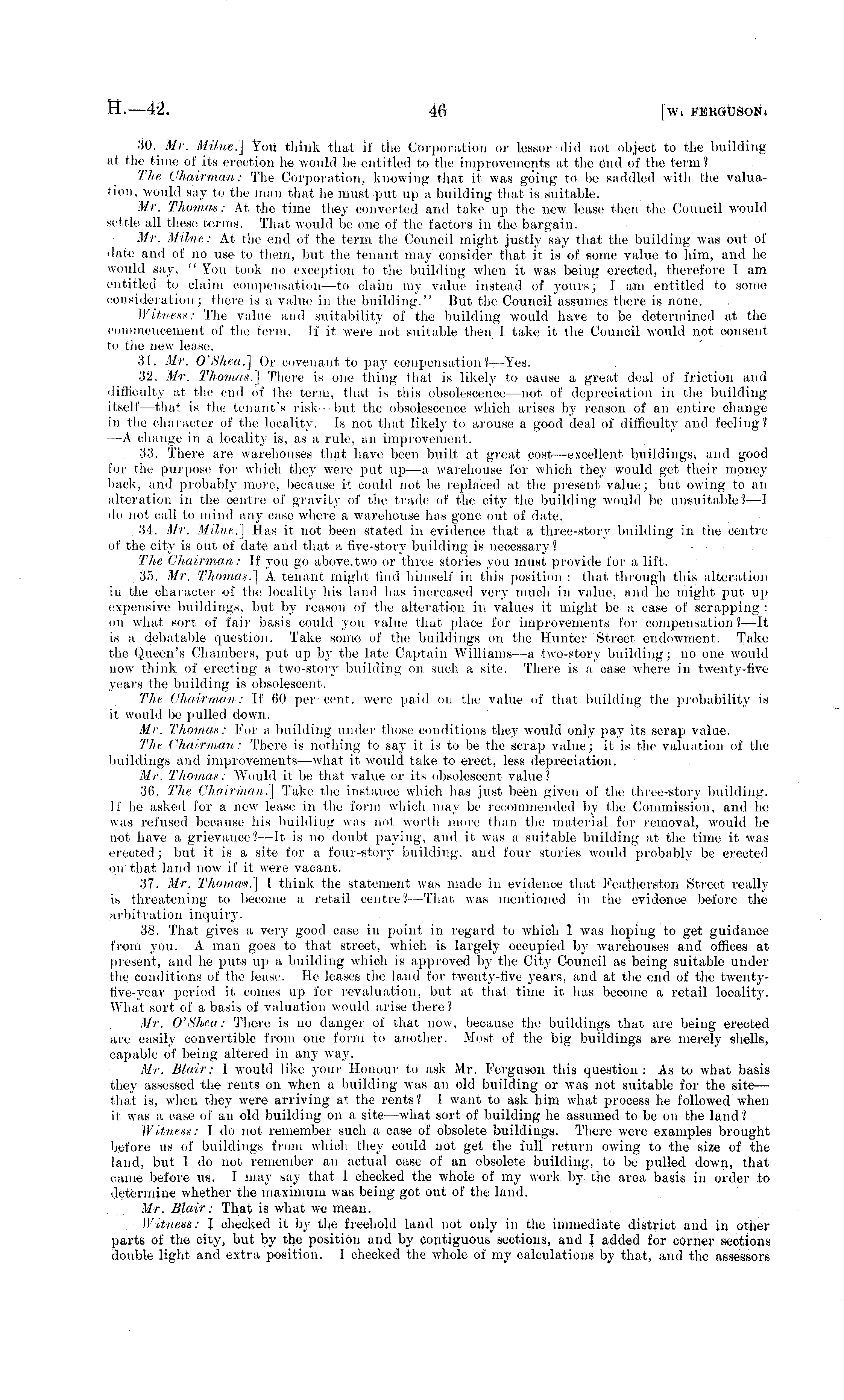 80. Mr. Milne.] Yoii think that if the Corporation or lessor did not object to the building at the time of its erection he would be entitled to the improvements at the end of the term? The Chairman: The Corporation, knowing that it was going to be saddled with the valuation, would say to the man that he must put up a building that is suitable. Mr. Thomas: At the time they converted and take up the new lease then the Council, would settle all these terms. That would be one of the factor's in the bargain. Mr. Milne: At the end of the term the Council might justly say that the building was out of date and of no use to them, but the tenant may consider that it is of some value to him, and he would say, " You took no exception to the building when it was being erected, therefore 1 am entitled to claim compensation—to claim my value instead of yours; I am entitled to some consideration; there is a value in the building." But the Council assumes there is none. Witness: The value and suitability of the building would have to be determined at the commencement of the term. If it were not suitable then I take it the Council would not consent to the new lease. 31. Mr. O'Shea.] Or covenant to paj' compensation ?—-Yes. 32. Mr. Thomas.] There is one thing that is likely to cause a great deal of friction and difficulty at the end of the term, that is this obsolescence—not, of depreciation in the building itself —that is the tenant's risk—but the obsolescence which arises by reason of an entire change in the character of the locality. Is not that likely to arouse a good deal of difficulty and feeling? —A change in a locality is, as a rule, an improvement. 33. There are warehouses that have been built at great cost —excellent buildings, and good for the purpose for which they were put up—a warehouse for which they would get their money back, and probably more, because it could not be replaced at the present value; but owing to an alteration in the centre of gravity of the trade of the city the building would be unsuitable? —1 do not call to mind any case where a warehouse has gone out, of date. 34. Mr, Milne.] Has it not been stated in evidence that a three-story building in the centre of the city is out of date and that a five-story building is necessary? The Chairman: If you go above.two'or three stories you must provide for- a lift. 35. Mr. Thomas.] A tenant might find himself in this position : that through this alteration in the character of the locality his land lias increased very much in value, and he might put up expensive buildings, but by reason of the alteration in values it might be a case of scrapping : on what sort of fair basis could you value that place for improvements for compensation?-*—lt is a debatable question. 'lake some of the buildings on the Hunter Street endowment. Take the Queen's Chambers, put up by the late Captain Williams —a two-story building; no one would now think of erecting a two-story building on such a site. There is a case where in twenty-five years the building is obsolescent. The Chairman: If 60 per cent, were paid on the value of that building the probability is it would be pulled down. Mr, Thomas: For a building under those conditions they would only pay its scrap value. The Chairman: There is nothing to say it. is to be the scrap value; it is the valuation of the buildings and improvements—what it- would take to erect, less depredation. Mr. Thomas: Would it be that value or its obsolescent value? 36. The Chairman.] Take the instance which has just been given of the three-story building. If he asked for a new lease in the form which may be recommended by the Commission, and he was refused because his building was not worth more than the material for removal, would he not have a grievance? —It is no doubt paying, and it, was a suitable building at the time it was erected; but it is a site for a four-story building, and four stories would probably be erected on that land now if it, were vacant. 37. Mr, Thomas.] I think the statement was made in evidence that Featherston Street really is threatening to become a retail centre?— That was mentioned in the evidence before the arbitration inquiry. 38. That gives a very good case in point in regard to which 1 was hoping to get guidance from you. A man goes to that street, which is largely occupied by warehouses and offices at present, and he puts up a building which is approved by the City Council as being suitable under the conditions of the lease. He leases the land for twenty-five years, and at the end of the twenty-five-year period it comes up for revaluation, but at that time it has become a retail locality. What sort of a basis of valuation would arise there ? Mr. O'Shea: There is no danger of that now, because the buildings that are being erected are easily convertible from one form to another. Most, of the big buildings are merely shells, capable of being altered in any way. Mr. Blair: I would like your Honour to ask Mr. Ferguson this question : As to what basis they assessed the rents on when a building was an old building or was not suitable for the site — that is, when they were arriving at the rents? I want to ask him what process he followed when it was a case of an old building on a site—what sort of building he assumed to be on the land ? Witness: Ido not remember such a case of obsolete buildings. There were examples brought before us of buildings from which they could not get the full return owing to the size of the laud, but I do not remember an actual case of an obsolete building, to be pulled down, that came before us. I may say that I checked the whole of my work by the area basis in order to determine whether the maximum was being got out of the land. Mr. Blair: That is what we mean. Witness: I checked it by the freehold land not only in the immediate district and in other parts of the city, but by the position and by contiguous sections, and I added for corner secti