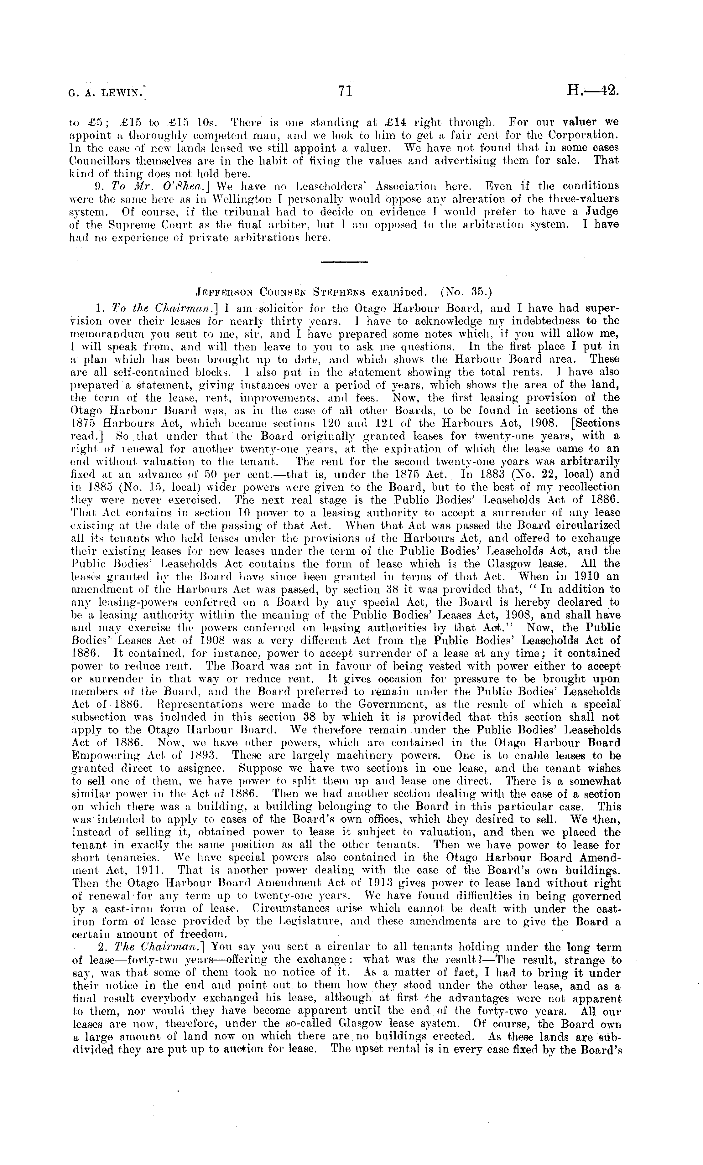 to £5; £15 to £15 10s. There is one standing at, £14 right through. For our valuer we appoint a thoroughly competent man, and we look to him to get a fair rent for the Corporation. In the case of new lands leased we still appoint a valuer. We have not found that in some oases Councillors themselves are in the habit of fixing the values and advertising them for sale. That kind of thing does not hold here. 9. To Mr. O'Shea.] We have no Leaseholders' Association here. Even if the conditions were the same here as in Wellington I personally would oppose any alteration of the three-valuers system. Of course, if the tribunal had to decide on evidence I would prefer to have a Judge of the Supreme Court as the final arbiter, but 1 am opposed to the arbitration system. I have had no experience of private arbitrations here. Jefferson Counsen Stephens examined. (No. 35.) 1. To the Chairman.] I am solicitor for the Otago Harbour Board, and I have had supervision over their leases for nearly thirty years. I have to acknowledge my indebtedness to the memorandum you sent to me, sir, and I. have prepared some notes which, if you will allow me, I will speak from, and will then leave to you to ask me questions. In the first place I put in a plan which has been brought up to date, and which shows the Harbour Board area. These are all self-contained blocks. 1 also put in the statement, showing the total rents. I have also prepared a statement, giving instances over a period of years, which shows the area of the land, the term of the lease, rent, improvements, and fees. Now, the first leasing provision of the Otago Harbour Board was, as in the case of all other Boards, to be found in sections of the 1,875 Harbours Act, which became sections 120 and 121 of the Harbours Act, 1908. [Sections read;] So that under that the Board originally granted leases for twenty-one years, with a right of renewal for another twenty-one years, at the expiration of which the lease came to an end without valuation to the tenant. The rent for the second twenty-one years was arbitrarily fixed at an advance of 50 per cent. —that is, under the 1875 Act. In 1883 (No. 22, local) and in 1885 (No. 15, local) wider powers were given to the Board, but to the best of my recollection they were never exercised. The next, real stage is the Public Bodies' Leaseholds Act of 1886. That Act contains in section 10 power to a leasing authority to accept a surrender of any lease existing at the date of the passing of that Act. When Act was passed the Board circularized all its tenants who held leases under the provisions of the Harbours Act, and offered to exchange their existing leases for new leases under the term of the Public Bodies' Leaseholds Act, and the Public Bodies' Leaseholds Act contains the form of lease which is the Glasgow lease. All the leases granted by the Board have since been granted in terms of that Act. When in 1910 an amendment of the Harbours Act was passed, by section 38 it was provided that, " In addition to any leasing-powers conferred on a Board by any special Act, the Board is hereby declared to be a leasing authority within the meaning of the Public Bodies' Leases Act, 1908, and shall have and may exercise the powers conferred on leasing authorities by that Aot." Now, the Public Bodies' Leases Act of 1908 was a very different Act from the Public Bodies' Leaseholds Act of 1886. It contained, for instance, power to accept surrender of a lease at any time; it contained power to reduce rent. The Board was not in favour of being vested with power either to accept or surrender in that way or reduce rent. It gives occasion for pressure to be brought upon. members of the Board, and the Board preferred to remain under the Publio Bodies' Leaseholds Act of 1886. Representations were made to the Government, as the result of which a special subsection was included in this section 38 by which it is provided that this section shall not apply to the Otago Harbour Board. We therefore remain under the Publio Bodies' Leaseholds Act of 1886. Now, we have other powers, which are contained in the Otago Harbour Board Empowering Act of 1893. These are largely machinery powers. One is to enable leases to be granted direct to assignee. Suppose we have two sections in one lease, and the tenant wishes to sell one-of them, we have power' to split them up and lease one direct. There is a somewhat similar power' in the Act of 1886. Then we had another section dealing with the case of a section on which there was a building, a building belonging to the Board in this particular case. This was intended to apply to cases of the Board's own offices, which they desired to sell. We then, instead of selling it, obtained power- to lease it subject to valuation, and then we placed the tenant in exactly the same position as all the other tenants. Then we have power to lease for short tenancies. We have special powers also contained in the Otago Harbour Board Amendment Act, 1911. That is another power dealing with the case of the Board's own buildings. Then the Otago Harbour Board Amendment Act of 1913 gives power to lease land without right of renewal for any term up to twenty-one years. We have found difficulties in being governed by a oast-iron form of lease. Circumstances arise which cannot be dealt with under the castiron form of lease provided by the Legislature, and these amendments arc to give the Board a certain amount of freedom. 2. The Chairman.] You say you sent a circular to all tenants holding under the long term of lease —forty-two years —offering the exchange: what was the result?— The result, strange to say, was that some of them took no notice of it. As a matter of fact, I had to bring it under their notice in the end and point out, to them how they stood under- the other lease, and as a final result everybody exchanged his lease, although at first the advantages were not apparent to them, nor- would they have become apparent until th