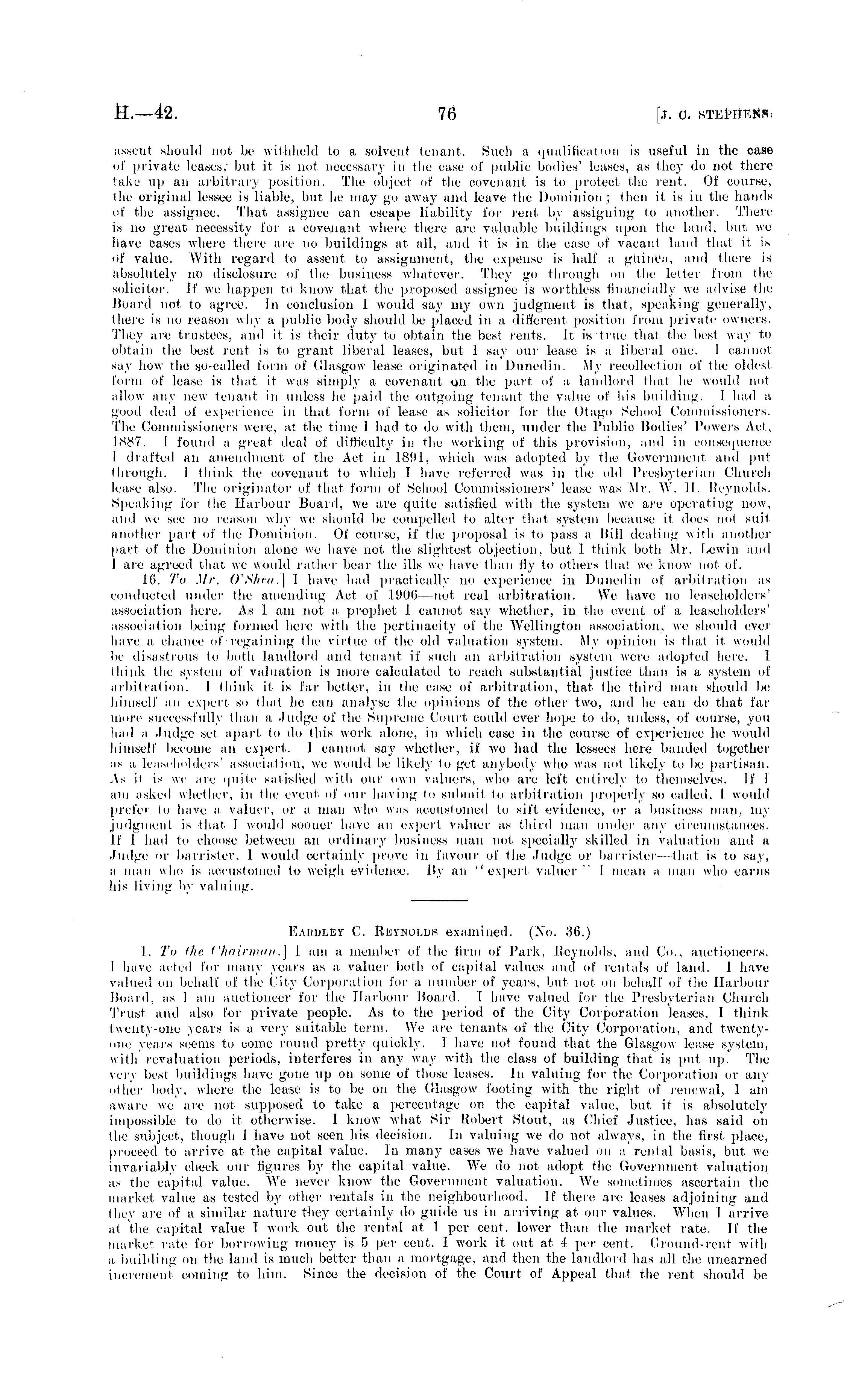 assent should not be withheld to a solvent tenant. Such a qualification is useful in the case of private leases,' but it, is not necessary in the case of public bodies' leases, as they do not there fake up an arbitrary position. The object of the covenant, is to protect the rent. Of course, the original lessee is liable, but he may go away and leave the Dominion ; then it is in the hands of the assignee. That assignee can escape liability for rent by assigning to another. There is no great necessity for a covenant where there are valuable buildings upon the land, but we have Oases where there are no building's at all, and it is in the case of vacant land that it is of value. With regard to assent to assignment, the expense is half a guinea, and there is absolutely no disclosure of the business whatever. They go through on the letter from the solicitor. If we happen to know that the proposed assignee is worthless financially we advise the Board not to agree. In conclusion I would say my own judgment is that, speaking generally, there is no reason why a public body should be placed in a different position from private owners. They are trustees, and it is their duty to obtain the best rents. It, is true that the best way to obtain the best rent is to grant liberal leases, but 1 sin our lease is a liberal one. I cannot Say how the so-called form of Glasgow lease originated in Dunedin. My recollection of the oldest form of lease is that it was simply a covenant on the part of a landlord that he would not allow any new tenant in unless he paid the outgoing tenant the value of his building. I had a good deal of experience in that form of lease as solicitor for the Otago School Commissioners. The Commissioners were, at the time I had to do with them, under the Public Bodies' Powers Act, 1887. I found a great deal of difficulty in the working of this provision, and in consequence I drafted an amendment of the Act in 1891, which was adopted by the Government and put through. I think the covenant to which 1 have referred was in the old Presbyterian Church lease also. The originator of that form of School Commissioners' lease was Mr. W. 11. Reynolds, Speaking for the Harbour Board, we are quite satisfied with the system we are operating now, and we see no reason why we should be compelled to alter that system because it does not suit another part of the Dominion. Of course, if the proposal is to pass a Bill dealing with another part of the Dominion alone we have not the slightest objection, but I think both Mr. Lewin and I are agreed that we would rather bear the ills we have than fly to others that we know not of. 16. To Mr. O'Shea.] I have had practically no experience in Dunedin of arbitration as conducted under the amending Act of 1900—not, real arbitration. We have no leaseholders' association here. As I am not a prophet I cannot, say whether, in the event of a leaseholders' association being formed here with the pertinacity of the Wellington association, we should ever have a chance of regaining the virtue of the old valuation system. My opinion is that il would be disastrous (o both landlord and tenant if such an arbitration system were adopted here. I think the system of valuation is more calculated to reach substantial justice than is a system of arbitration. I think it is far bettor, in the ease of arbitration, that the third man should be himself an expert, so that he can analyse Hie opinions of the other two, and he can do that far more successfully than a Judge of the Supreme Court could ever hope to do, unless, of course, you had a Judge set apart to do this work alone, in which case in the course of experience he would himself become an expert. 1 cannot say whether, if we had the lessees here banded together as a leaseholders' association, we would be likely to get anybody who was not likely to lie partisan. As il is we are quite satisfied with our own valuers, who are left, entirely Io themselves. If 1 am asked whether, in the event of our having to submit lo arbitration properly so called, I would prefer lo have a valuer, or a man who was accustomed to sift evidence, or a business man, my judgment is that I would sooner have an expert, valuer as third man under any circumstances. If I had to choose between an ordinary business man mil specially skilled in valuation ami a Judge or barrister, I would certainly prove in favour of the Judge or barrister that is to say, a man who is accustomed to weigh evidence. By an "expert valuer" 1 mean a man who earns his living by valuing. Eardlb. C. lIiiVNOLDs examined. (No. 36.) 1. To the Chairman.] 1 am a member of the firm of Park, Reynolds, and Co., auctioneers. I have acted for many years as a valuer both of capital values and of rentals of land. I have valued on behalf of the City Corporation for a number of years, but not on behalf of the Harbour Board, as 1 am auctioneer for the Harbour Board. I have valued for the Presbyterian Church Trust and also for private people. As to the period of the City Corporation leases, 1 think twenty-one years is a very suitable tern, We are tenants of the City Corporation, and twentyone years seems to come round pretty quickly. 1 have not found that the Glasgow lease system, with revaluation periods, interferes in any way with the class of building that is put up. The very best buildings have gone up on some of those leases. In valuing for the Corporation or any other body, where the lease is to be on the Glasgow fooling with the right of renewal, I am aware we are not supposed to take a percentage on the capital value, but it is absolutely impossible to do it otherwise. I know what Sir Robert Stout, as Chief Justice, has said on the subject, though I have not seen his decision. In valuing we do not always, in the first place, proceed to arrive at the capital value. In many cases we have valued on a rental basis, but we invariably check our figures by the capital value. We do not adopt the Government valu