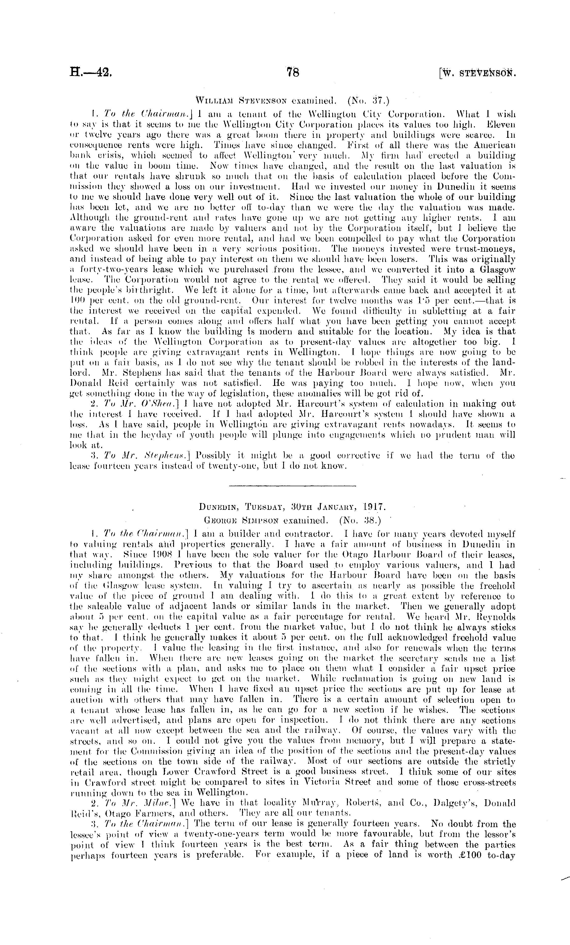 Dunhuin, Tuesday, 30th January, 1917. George Simpson examined. (No. 38.) 1. To the Chairman.] lam a builder and contractor. 1 have for many years devoted myself to valuing rentals and properties generally. I have a fair ami t of business in Dunedin in that way. Since 1908 I have been the sole valuer for the Otago Harbour Board of their leases, including buildings. Previous to that the Board used to employ various valuers, and I had my share amongst the others. My valuations for the Harbour Hoard have been on the basis of tiie Glasgow lease system. In valuing 1 try to ascertain as nearly as possible the freehold value of the piece of ground I am dealing with. I do this lo n great extent by reference to the saleable value of adjacent lands or similar lands in the market, Then we generally adopt about 5 per cent, on the capital value as a fair percentage for rental. We heard Mr. Reynolds say hi' generally deducts I per cent, from the market value, but I do not think he always sticks to that. 1 think he generally makes it about 5 per cent, on the full acknowledged freehold value of Hie property, I value the leasing in the first instance, and also for renewals when Hie terms have fallen in. When there are new leases going on the market the secretary sends me a list of the sections with a plan, and asks me to place on them what 1 consider a fair upset price such as they might expect to get on the market. White reclamation is going on new land is coming in all the lime. When I have fixed an upset price the sections are put up for lease al auction with others thai may have fallen in. There is a certain amount of selection open to a tenant whose lease has fallen in, as he can go for a new section if he wishes. The sections are well advertised, and plans are open for inspection. I do not think there are any sections vacant at all now except between Hie sea and the railway. Of course, the values vary with the streets, and so on. I could not give you the values from memory, but I will prepare a statement for the Commission giving an idea of the position of the sections and the present-day values of the sections on the town side of the railway. Most of our sections arc outside the strictly retail area, though Lower Crawford Street is a good business street. I think- some of our sites in Crawford street might be compared to sites in Victoria Street and sonic of those cross-streets running down to the sea in Wellington. 2. To Mr. Milne.] We have in that locality Murray, Roberts, and Co., Dalgety's, Donald lleid's, Otago Farmers, and others. They are all our tenants. 3. To the Chairman.] The term of our lease is generally fourteen years. No doubt from the lessee's point of view a twenty-one-years term would be more favourable, but from the lessor's point of view- I think fourteen years is the best tern, As a fair thing between the parties perhaps fourteen years is preferable. For example, if a piece of land is worth £100 to-day