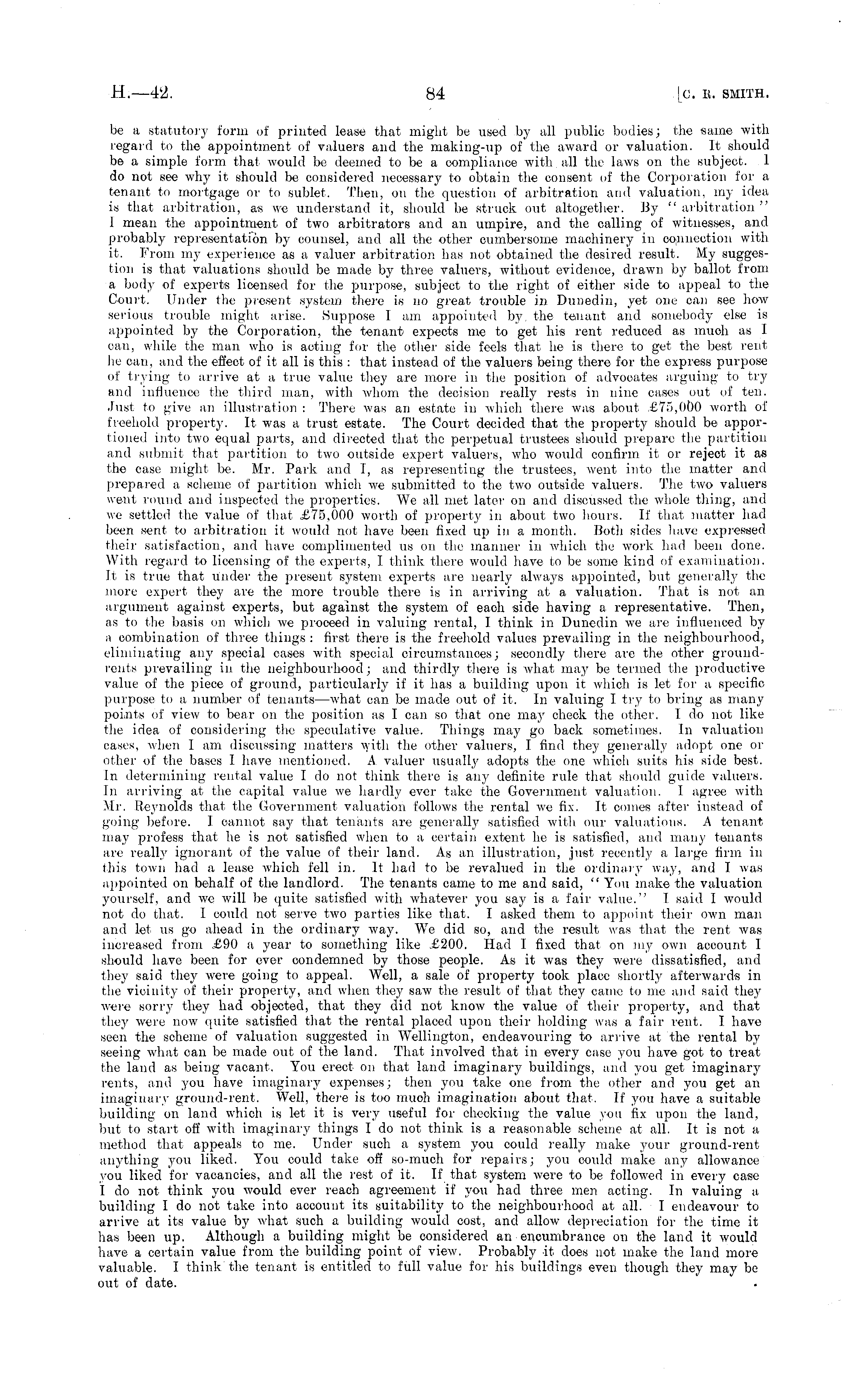 be a statutory form of printed lease that might be used by all public bodies; the same with regard to the appointment of valuers and the making-up of the award or valuation. It should be a simple form that would be deemed to be a compliance with all the laAvs on the subject. 1 do not see why it should be considered necessary to obtain the consent of the Corporation for a tenant to mortgage or to sublet. Then, on the question of arbitration and valuation, my idea is that arbitration, as we understand it, should be struck out altogether. By "arbitration" I mean the appointment of two arbitrators and an umpire, and the calling of witnesses, and probably representation by counsel, and all the other cumbersome machinery in connection with it. From my experience as a, valuer arbitration has not obtained the desired result. My suggestion is that valuations should be made by three valuers, without evidence, drawn by ballot from a body of experts licensed for the purpose, subject to the right of either side to appeal to the Court. Under the present system there is no great, trouble in Dunedin, yet one can see hoxv serious trouble might arise. Suppose I am appointed by the tenant and somebody else is appointed by the Corporation, the tenant expects me to get his rent reduced as much as I can, while the man who is acting for the other side feels that he is there to get the best rent he can, and the effect of it all is this : that instead of the valuers being there for the express purpose of trying to arrive at a true value they are more in the position of advocates arguing to try and influence the third man, with whom the decision really rests in nine cases out, of ten. Just to give an illustration : There Avas an estate in Avhich there Avas about £75,000 worth of freehold property. It was a trust estate. The Court decided that the property should be apportioned into two equal parts, and directed that the perpetual trustees should prepare the partition and submit that partition to two outside expert valuers, who would confirm it, or reject it as the case might be. Mr. Park and I, as representing the trustees, went into the matter and prepared a scheme of partition which Aye submitted to the two outside valuers. The tAvo valuers went round and inspected the properties. We all met later on and discussed the whole thing, and we settled the value of that £75,000 worth of property in about two hours. If that matter had been sent, to arbitration it would not have been fixed up in a month. Both sides have expressed their satisfaction, and have complimented us on the manner in which the work had been done. With regard to licensing of the experts, I think there would haAe to be some kind of examination. It is true that under the present system experts are nearly ahvays appointed, but generally the more expert they are the more trouble there is in arriving at a valuation. That is not an argument against experts, but against the system of each side having a, representative. Then, as to the basis on whioh Aye proceed in valuing rental, I think in Dunedin Aye arc influenced by a combination of three things : first there is the freehold values prevailing in the neighbourhood, eliminating any special cases with special circumstances; secondly there arc the other groundrents prevailing in the neighbourhood; and thirdly there is what may be termed the productive value of the piece of ground, particularly if it has a building upon it -which is let for a specific purpose to a number of tenants —what can be made out of it. In valuing I try to bring as many points of view to bear on the position as I can so that one may check the other. I do not like the idea of considering the speculative value. Things may go back sometimes. In valuation cases, when I am discussing matters xyith the other valuers, I find they generally adopt one or other of the bases I have mentioned. A valuer usually adopts the one whioh suits his side best. In determining rental value I do not think there is any definite rule that should guide valuers. In arriving at the capital value we hardly ever take the Government valuation. I agree with Mr. Reynolds that the Government valuation follows the rental Aye fix. It comes after instead of going before. I cannot say that tenants are generally satisfied with our valuations. A tenant may profess that he is not satisfied Avhen to a certain extent he is satisfied, and many tenants are really ignorant of the value of their land. As an illustration, just recently a large firm in this toAvn had a lease which fell in. It had to be revalued in the ordinary way, and I Avas appointed on behalf of the landlord. The tenants came to me and said, " You make the valuation yourself, and Aye will be quite satisfied with AA'hatever you say is a fair value." I said I Avould not do that. I could not serve two parties like that. I asked them to appoint their oavh man and let us go ahead in the ordinary xvay. We did so, and the result was that the rent was increased from £90 a year to something like £200. Had I fixed that on my own account 1 should have been for over condemned by those people. As it was they were dissatisfied, and they said they were going to appeal. Well, a sale of property took place shortly afterwards in the vicinity of their property, and Avhen they saw the result, of that they came to me and said they were sorry they had objected, that they did not Ihioav the value of their property, and that they were uoav quite satisfied that the rental placed upon their holding was a fair rent. I. have seen the scheme of valuation suggested in Wellington, endeavouring to arrive at, the rental by seeing what can be made out of the land. That involved that in every case you have got to treat the land as being vacant. You erect on that land imaginary buildings, and you get imaginary rents, and you have imaginary expenses; then you take one from the other and you get an imaginary ground-rent. Well, there is too mu