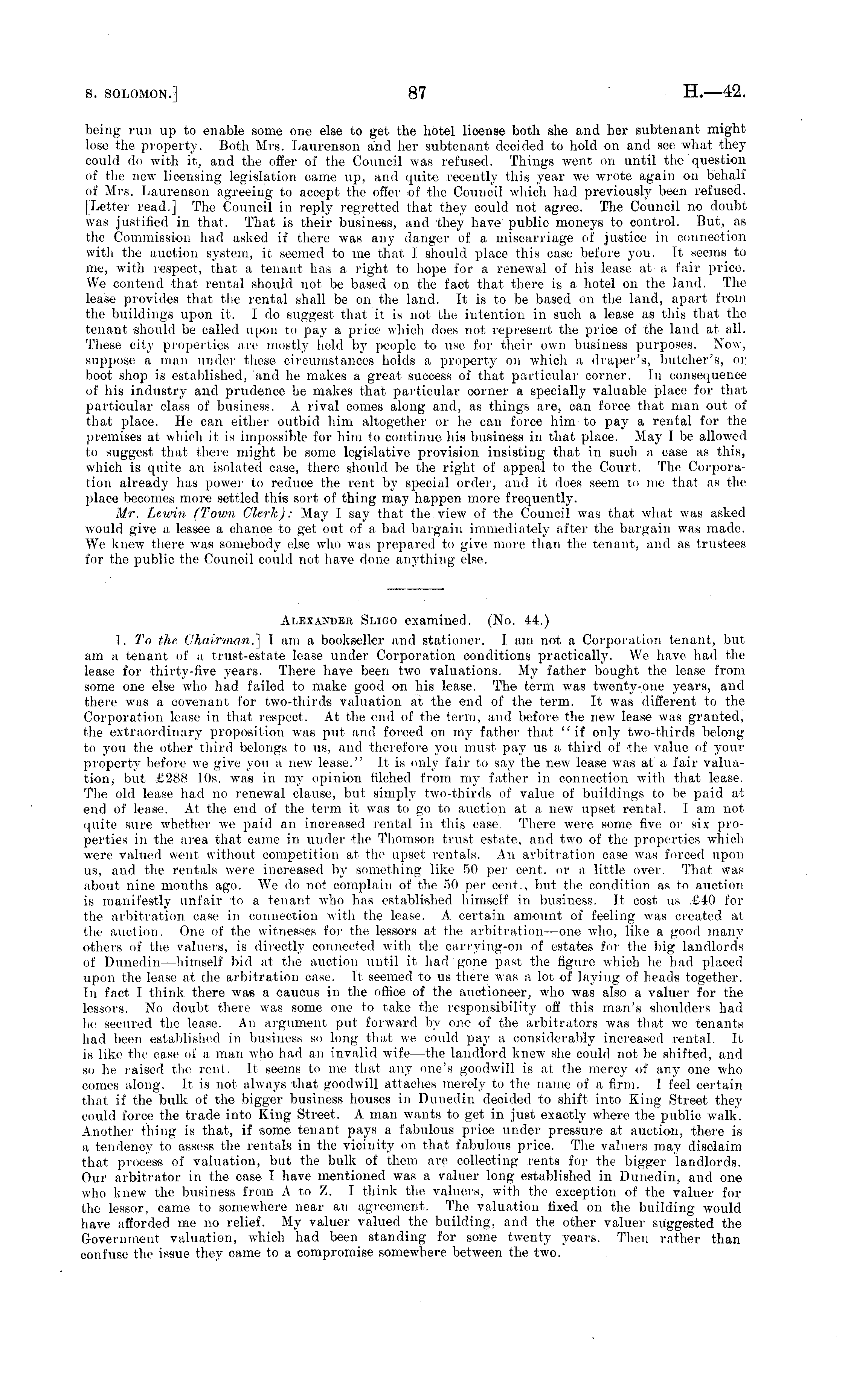 being run up to enable some one else to get the hotel license both she and her subtenant might lose the property. Both Mrs. Laurenson and her subtenant decided to hold on and see what they could do with it, and the offer of the Council was refused. Things went on until the question of the new licensing legislation came up, and quite recently this year we wrote again on behalf of Mrs. Laurenson agreeing to accept the offer of the Council which had previously been, refused. [Letter read.] The Council in reply regretted that they could not agree. The Council no doubt was justified in that. That is their business, and they have public moneys to control. But, as the Commission had asked if there was any danger of a miscarriage of justice in connection with the auction system, it, seemed to me that I should place this case before you. It seems to me, with respect, that a tenant has a right to hope for a renewal of his lease at a fair price. We contend that rental should not be based on the fact that there is a hotel on the land. The lease provides that the rental shall be on the land. It is to be based on the land, apart from the buildings upon it. I do suggest that it is not the intention in such a lease as this that the tenant should be called upon to pay- a price which does not represent the price of the land at all. These city properties are mostly held by people to use for their own business purposes. Now, suppose a man under these circumstances holds a property on which a draper's, butcher's, or boot shop is established, and he makes a great success of that particular corner. In consequence of his industry and prudence he makes that particular corner a specially valuable place for that particular class of business. A. rival comes along and, as things are, can force that man out of that place. He can either outbid him altogether or he can force him to pay a rental for the premises at which it; is impossible for him to continue his business in that place. May Ibe allowed to suggest that there might be some legislative provision insisting that in such a case as this, which is quite an isolated case, there should be the right of appeal to the Court. The Corporation already has power to reduce the rent by special order', and it does seem to me that as the place becomes more settled this sort of thing may happen more frequently. Mr. Lewin (Town Clerk): May I say that the view of the Council was that what was asked would give a lessee a chance to get out of a bad bargain immediately after the bargain was made. We knew there was somebody else who was prepared to give more than the tenant, and as trustees for the public the Council could not have done anything else. Alexander Slioo examined. (No. 44.) 1. To the Chairman.] 1 am a bookseller and stationer. I am not a Corporation tenant, but am a tenant of a trust-estate lease under Corporation conditions practically. We have had the lease for thirty-five years. There have been two valuations. My father bought the lease from some one else who had failed to make good on his lease. The term was twenty-one years, and there was a covenant for two-thirds valuation at the end of the term. It was different to the Corporation lease in that respect. At the. end of the term, and before the new lease was granted, the extraordinary proposition was put and forced on my father that "if only two-thirds belongto you the other third belongs to us, and therefore you must pay us a third of the value of your property before we give you a new lease." It is only fair to say the new lease was at' a fair valuation, but £288 I.os. was in my opinion filched from my father in connection with that lease. The old lease had no renewal clause, but simply two-thirds of value of buildings to be paid at end of lease. At the end of the term it was to go to auction at a new upset rental. I am not quite sure whether we paid an increased rental in this case. There were some five or six properties in the area that came in under the Thomson trust estate, and two of the properties which were valued went without competition at the upset rentals. An arbitration case was forced upon us, and the rentals were increased by something like 50 per cent, or a little over. That was about nine months ago. We do not complain of the 50 per cent., but the condition as to auction is manifestly unfair to a tenant who has established himself in business. It cost us £40 for the arbitration case in connection with the lease. A certain amount of feeling was created at the auction. One of the witnesses for the lessors at the arbitration—one who, like a good many others of the valuers, is directly connected with the carrying-on of estates for the big landlords of Dunedin —himself bid at the auction until it had gone past the figure which he had placed upon the lease at the arbitration case. It seemed to us there was a lot of laying of heads together. In fact I think there was a caucus in the office of the auctioneer, who was also a valuer' for the lessors. No doubt there was some one to take the responsibility off this man's shoulders had he secured the lease. An argument put forward by one of the arbitrators was that we tenants had been established in business so long that we could pay a considerably increased rental. It is like the case of a man who had an invalid wife —the landlord knew she could not be shifted, and so he raised the rent. It seems to me that any one's goodwill is at the mercy of any one who comes along. It is not always that goodwill attaches merely to the name of a firm. I feel certain that if the bulk of the bigger business houses in Dunedin decided to shift into King Street they could force the trade into King Street. A. man wants to get in just exactly where the publio walk. Another thing is that, if some tenant pays a fabulous price under pressure at auction, there is a tendency to assess the rentals in the vicinity on that fabulous price. The valuers may disclaim that process of