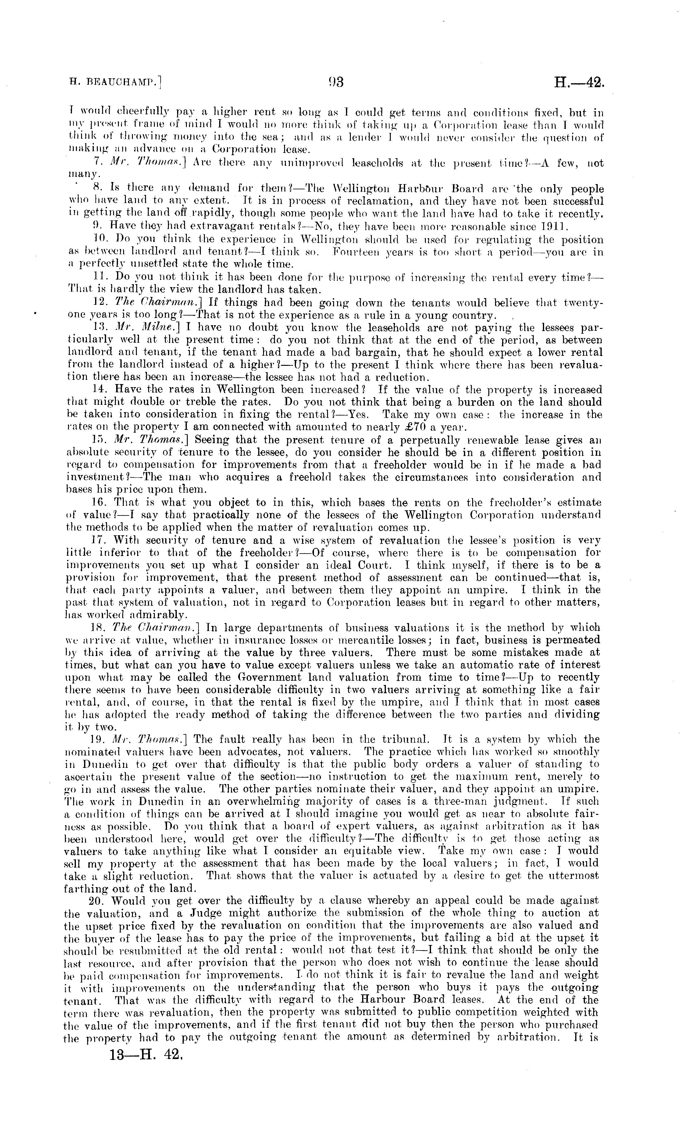 I would cheerfully pay a higher rent so long as I could get terms and conditions fixed, but in my present frame of mind I would no more think of taking up a Corporation lease than I would think of throwing money into Hie sea; and as a lender I would never consider the question of making an advance on a Corporation lease. 7. Mr. Thomas.] Are there any unimproved leaseholds at the present lime? -A few, not many. 8. Is there any demand for them?— The Wellington Harbour Board are the only people who have land to any extent. It is in process of reclamation, and they have not been successful in getting the land off rapidly, though some people who want the land have had to take it recently. 9. Have they had extravagant rentals? —No, they have been more reasonable since 191 I. 10. Do you think the experience in Wellington should be used for regulating the position as between landlord anil tenant?—l think so. Fourteen years is too short a period—you are in a perfectly unsettled state the whole time. 11. Do you not think it has been done for the purpose of increasing the rental every time?— That is hardly the view the landlord has taken. 12. The Chairman.] If things had been going down the tenants would believe that twentyone years is too long?— That is not the experience as a rule in a young country. 13. Mr. Milne.] I have no doubt you know the leaseholds are not, paying the lessees particularly well at the present time : do you not think that at the end of the period, as between landlord and tenant, if the tenant had made a bad bargain, that he should expect a lower rental from the landlord instead of a higher?—Up to the present I think where there has been revaluation there has been an increase—the lessee has not had a reduction. 14. Have the rates in Wellington been increased? If the value of the property is increased that might double or treble the rates. Do you not think that being a burden on the land should be taken into consideration in fixing the rental?— Yes. Take my own case: the increase in the rates on the property I am connected with amounted to nearly £70 a year. 15. Mr. Thomas.] Seeing that the present tenure of a perpetually renewable lease gives an absolute security of tenure to the lessee, do you consider he should be in a different position in regard to compensation for improvements from that a freeholder would be in if he made a bad investment? —The man who acquires a freehold takes the circumstances into consideration and liases his price upon them. 16. That is what you object to in this, which bases the rents on the freeholder's estimate of value? —I say that practically none of the lessees of the Wellington Corporation understand the methods to be applied when the matter of revaluation comes up. 17. With security of tenure and a wise system of revaluation the lessee's position is very little inferior to that of the freeholder? —Of course, where there is to be compensation for improvements you set up what- 1 consider an ideal Court. I think myself, if there is to be a provision for improvement, that the present method of assessment can be continued —that is, that each party appoints a valuer, and between them they appoint an umpire. I think in the past that system of valuation, not in regard to Corporation leases but in regard to other matters, has worked admirably. 18. The Chairman.] In large departments of business valuations it is the method by which we arrive at value, whether in insurance losses or mercantile losses; in fact, business is permeated by this idea of arriving at the value by three valuers. There must be some mistakes made at times, but what can you have to value except valuers unless we take an automatic rate of interest upon what may be called the Government land valuation from time to time?—Up to recently there seems to have been considerable difficulty in two valuers arriving at something like a fair rental, and, of course, in that the rental is fixed by the umpire, and I think that in most oases he has adopted the ready method of taking the difference between the two parties and dividingit by two. 19. Mr. Thomas.] The fault really has been in the tribunal. It is a system by which the nominated valuers have been advocates, not valuers. The practice which has worked so smoothly in Dunedin to get over that difficulty is that the public body orders a valuer of standing to ascertain the present value of the section —no instruction to get the maximum rent, merely to go in and assess the value. The other parties nominate their valuer, and they appoint an umpire. The work in Dunedin in an overwhelming majority of cases is a, three-man judgment. If such a condition of things can be arrived at I should imagine you would get as near to absolute fairness as possible. Do voir think that a board of expert valuers, as against arbitration as i( has been understood here, would get over the difficulty?— The difficulty is to got those acting as valuers to take anything like what I consider an equitable view. Take my own case : I would sell my property at the assessment that has been made by the local valuers; in fact, I would take a slight reduction. That shows that the valuer is actuated by a desire to get the uttermost farthing out of the land. 20. Would you get over the difficulty by a clause whereby an appeal could be made against, the valuation, and a Judge might authorize the submission of the whole thing to auction at the upset price fixed by the revaluation on condition that the improvements are also valued and the buyer of the lease has to pay the price of the improvements, but, failing a bid at the upset it should be resubmitted at the old rental : would not that test it? —I think that should be only the last resource, and after provision that the person who does not wish to continue the lease should be paid compensation for improvements. Ido not think it- is fair to revalue the land and weight it with improvements on the unde