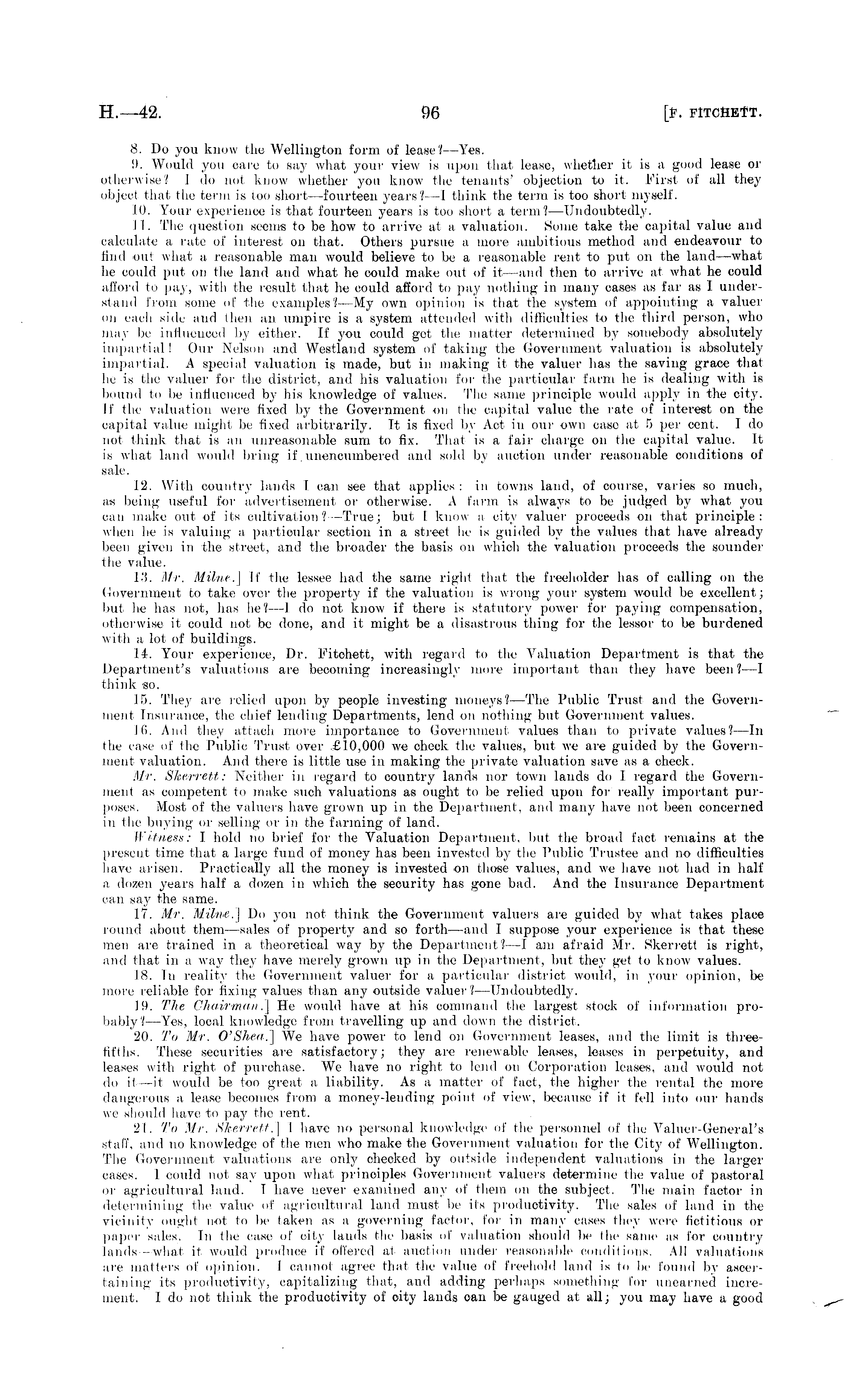 8. Do you know the Wellington form of lease? —Yes. 9. Would you care to say what your view is upon that lease, whether it is a good lease or otherwise? 1 do not. know whether you know the tenants' objection to it. First of all they object that the term is too short —fourteen years? —I think the term is too short myself. 10. Your experience is that fourteen years is too short a term?— Undoubtedly. 11. The question seems to be how to arrive at a valuation. Some take the capital value arrd calculate a rate of interest on that. Others pursue a more ambitious method and endeavour to find out what a reasonable man would believe to be a reasonable rent to put on the land —what he could put on the land and what he could make out of it—and then to arrive at what he could afford to pay, with the result that he could, afford to pay nothing in many cases as far as I understand from, some of the examples?—My own opinion is that the system of appointing a valuer on each side and then an. umpire is a system attended with difficulties to the third person, who may be influenced by either. If you could get the matter determined by somebody absolutely impartial I Our Nelson and Westland system of taking the Government valuation is absolutely impartial. A special valuation is made, but in making it the valuer has the saving grace thai he is the valuer for the district, and his valuation for the particular farm he is dealing with is bound to be influenced by his knowledge of values. The same principle would apply in the city. If the valuation were fixed by the Government on the capital value the rate of interest on the capital value might be fixed arbitrarily. It is fixed by Act in our own case at 5 per cent. I do not think that is an unreasonable sum to fix. That is a fair charge on the capital value. It is what land would bring if .unencumbered and sold by auction under reasonable conditions of sale. 12. With country lands I can see that applies: in towns land, of course, varies so much, as being useful for advertisement or otherwise. A farm is always to be judged by what you can make out of its cultivation ?—True; but I know a city valuer proceeds on that principle: when he is valuing a particular section in a street he is guided by the values that have already been given in the street, and the broader the basis on which the valuation proceeds the sounder the value. 13. Mr. Milne.] If the lessee had the same right that the freeholder has of calling on the Government to take over the property if the valuation is wrong your system would be excellent; but he has not, has he?—l. do not know if there is statutory power for paying compensation, otherwise it could not be done, and it might be a disastrous thing for the lessor to be burdened with a lot of buildings. 14. Your experience, Dr. Fitchett, with regard to the Valuation Department is that the Department's valuations are becoming increasingly more important than they have been? —1 think so. 15. They are relied upon by people investing moneys? —The Public Trust and the Government Insurance, the chief lending Departments, lend on nothing but Government values. Hi. And they attach more importance to Government values than to private values? —In the case of the Public Trust over £10,000 we check the values, but we are guided by the Government valuation. And there is little use in making the private valuation save as a check. Mr. Skerrett: Neither in regard to country lands nor town lands do 1 regard the Government as competent to make such valuations as ought to be relied upon for really important purposes. Most of the valuers have grown up in the Department, and many have not been concerned in the buying or selling or in the farming of land. Witness: I hold no brief for the Valuation Department, but the broad fact remains at the present time that a large fund of money has been invested by the Public Trustee and no difficulties have arisen. Practically all the money is invested on those values, and we have not had in half a dozen years half a dozen in which the security has gone bad. And the Insurance Department can say the same. 17. Mr. Milne.] Do you not think the Government valuers are guided by what takes place round about them —sales of property and so forth —and 1 suppose your experience is that these men are trained in a theoretical way by the Department?—l am afraid Mr. Skerrett is right, and that in a way they' have merely grown up in the Department, but they get to know values. 18. In reality the Government valuer for a, particular district would, in your opinion, be more reliable for fixing values than any outside valuer'? —Undoubtedly. 19. The Chairman.] He would have at his command (he largest stock of information probably?— Yes, local knowledge from travelling up and down the district. 20. To Mr. O'Shea.] We have power to lend on Government leases, and the limit is threefifths. These securities are satisfactory; they are renewable leases, leases in perpetuity, and leases with right of purchase. We have no right, to lend on Corporation leases, and would not do it—it would be too great a liability. As a matter of fact, the higher the rental the more dangerous a lease becomes from a money-lending point of view, because if il fell into our hands we should have to pay the rent. 21. To Mr. Skerrett.] I have no personal knowledge of the personnel of (he Valuer-General's staff, and no knowledge of the men who make the Government valuation for the City of Wellington. The Government valuations are onto checked by outside independent valuations iti the larger cases. 1 could not say upon what, principles Government valuers determine the value of pastoral or agricultural laud. I have never examined any of them on the subject. The main factor in determining the value of agricultural land must be its productivity. The sales of laud in the vicinity ought not to be taken as a governing factor, for in many cases they were fict