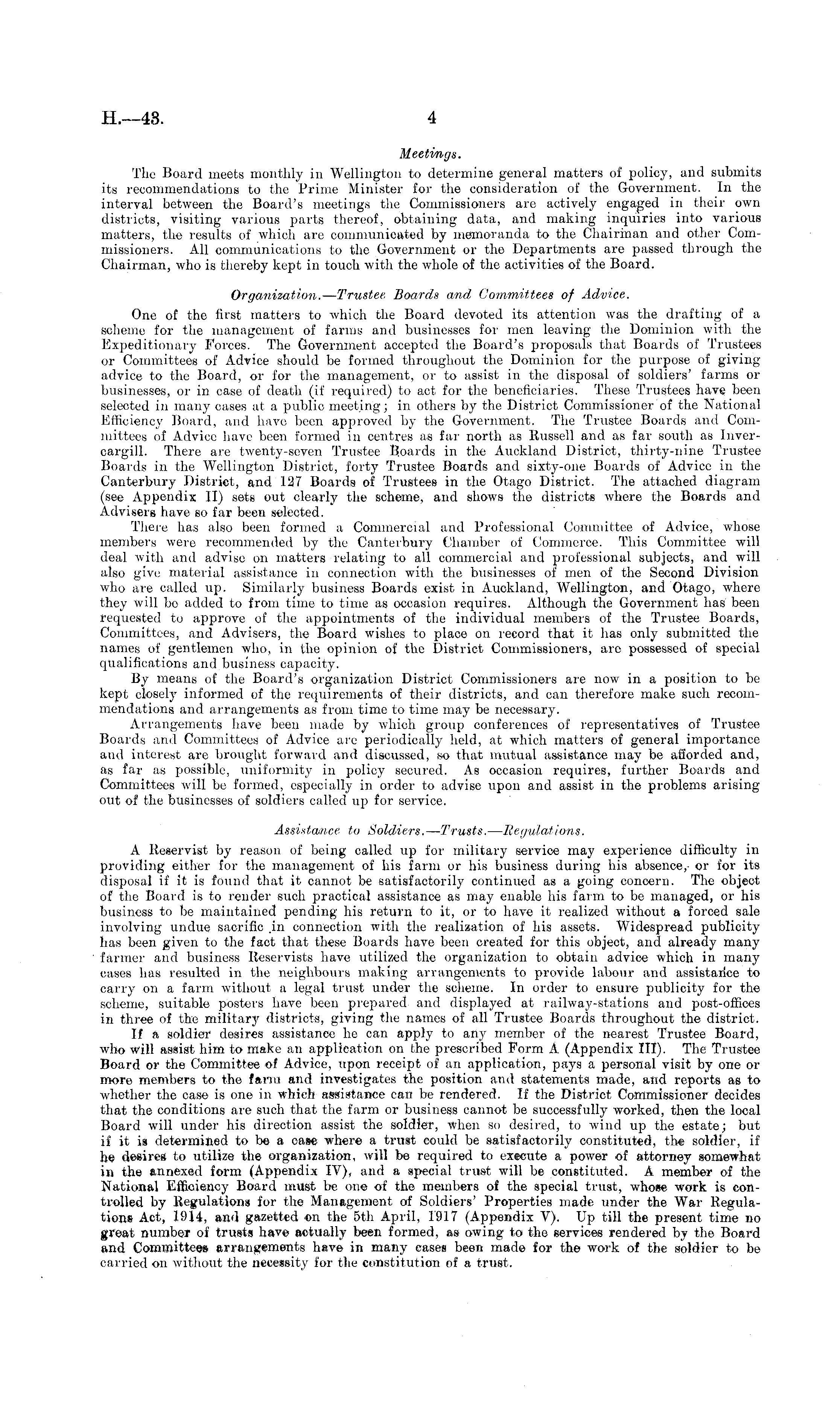 Meetings. The Board meets monthly in Wellington to determine general matters of policy, and submits its recommendations to the Prime Minister for the consideration of the Government. In the interval between the Board's meetings the Commissioners arc actively engaged in their own districts, visiting various parts thereof, obtaining data, and making inquiries into various matters, the results of which are communicated by memoranda to the Chairman and other Commissioners. All communications to the Government or the Departments are passed through the Chairman, who is thereby kept in touch with the whole of the activities of the Board. Organization. — Trustee Boards and Committees of Advice. One of the first matters to which the Board devoted its attention was the drafting of a scheme for the management of farms and businesses for men leaving the Dominion with the Expeditionary Forces. The Government accepted the Board's proposals that Boards of Trustees or Committees of Advice should be formed throughout the Dominion for the purpose of giving advice to the Board, or for the management, or to assist in the disposal of soldiers' farms or businesses, or in case of death (if required) to act for the beneficiaries. These Trustees have been selected in many cases at a public meeting; in others by the District Commissioner of the National Efficiency Board, and have been approved by the Government. The Trustee Boards and Committees of Advice have been formed in centres as far north as Russell and as far south as Invercargill. There are twenty-seven Trustee Boards in the Auckland District, thirty-nine Trustee Boards in the Wellington District, forty Trustee Boards and sixty-one Boards of Advice in the Canterbury District, and 127 Boards of Trustees in the Otago District. The attached diagram (see Appendix II) sets out clearly the scheme, and shows the districts where the Boards and Advisers have so far been selected. There has also been formed a Commercial and Professional Committee of Advice, whose members were recommended by the Canterbury Chamber of Commerce. This Committee will deal with and advise on matters relating to all commercial and professional subjects, and will also give material assistance in connection with the businesses of men of the Second Division who are called up. Similarly business Boards exist in Auckland, Wellington, and Otago, where they will be added to from time to time as occasion requires. Although the Government has been requested to approve of the appointments of the individual members of the Trustee Boards, Committees, and Advisers, the Board wishes to place on record that it has only submitted the names of gentlemen who, in the opinion of the District Commissioners, are possessed of special qualifications and business capacity. By means of the Board's organization District Commissioners are now in a position to be kept closely informed of the requirements of their districts, and can therefore make such recommendations and arrangements as from time to time may be necessary. Arrangements have been made by which group conferences of representatives of Trustee Boards and Committees of Advice are periodically held, at which matters of general importance and interest are brought forward and discussed, so that mutual assistance may be afforded and, as far as possible, uniformity in policy secured. As occasion requires, further Boards and Committees will be formed, especially in order to advise upon and assist in the problems arising out of the businesses of soldiers called up for service. Assistance to Soldiers. — Trusts. — ltegulations. A Reservist by reason of being called up for military service may experience difficulty in providing either for the management of his farm or his business during his absence,- or for its disposal if it is found that it cannot be satisfactorily continued as a going concern. The object of the Board is to render such practical assistance as may enable his farm to be managed, or his business to be maintained pending his return to it, or to have it realized without a forced sale involving undue sacrific .in connection with the realization of his assets. Widespread publicity has been given to the fact that these Boards have been created for this object, and already many farmer and business Reservists have utilized the organization to obtain advice which in many cases has resulted in the neighbours making arrangements to provide labour and assistance to carry on a farm without a legal trust under the scheme. In order to ensure publicity for the scheme, suitable posters have been prepared and displayed at railway-stations and post-offices in three of the military districts, giving the names of all Trustee Boards throughout the district. If a soldier desires assistance he can apply to any member of the nearest Trustee Board, who will assist him to make an application on the prescribed Form A. (Appendix III). The Trustee Board or the Committee of Advice, upon receipt of an application, pays a personal visit by one or more members to the farm and investigates the position and statements made, and reports as to whether the case is one in which assistance can be rendered. If the District Commissioner decides that the conditions are such that the farm or business cannot be successfully worked, then the local Board will under his direction assist the soldier, when so desired, to wind up the estate; but if it is determined to be a casie where a trust could be satisfactorily constituted, the soldier, if he desires to utilize the organization, will be required to execute a power of attorney somewhat in the annexed form (Appendix IV), and a special trust will be constituted. A member of the National Efficiency Board must be one of the members of the special trust, whose work is controlled by Regulations for the Management of Soldiers' Properties made under the War Regulations Act, 1914, and gazetted on the sth April, 1917 (Appendix V). Up till the prese