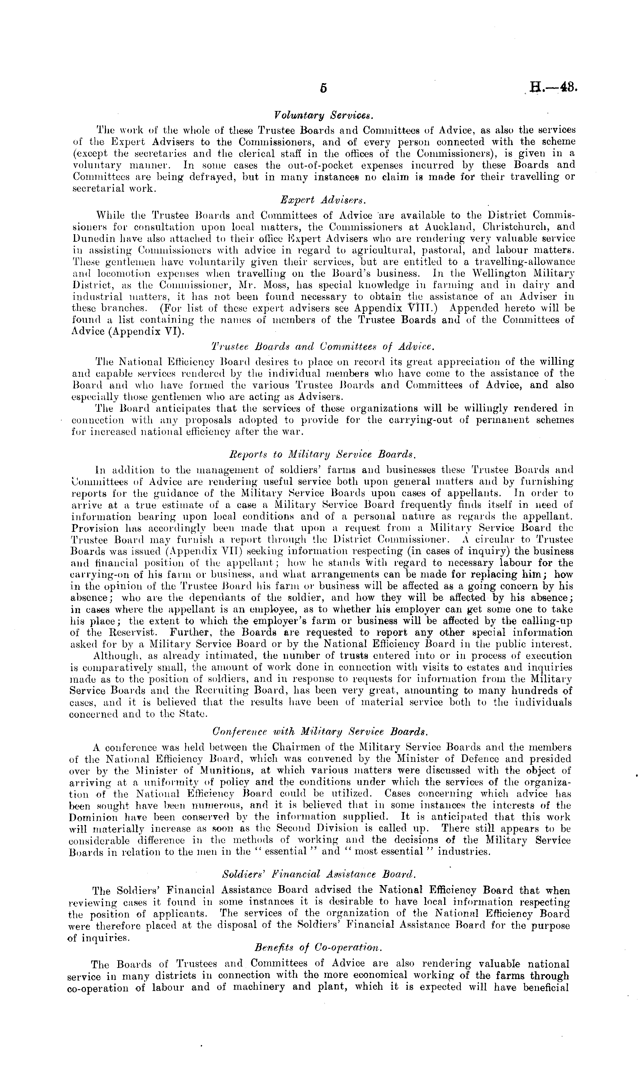 Voluntary Services. The work of the whole of these Trustee Boards and Committees of Advice, as also the services of the Expert Advisers to the Commissioners, and of every person connected with the scheme (except the secretaries and the clerical staff in the offices of the Commissioners), is given in a voluntary manner. In some cases the out-of-pocket expenses incurred by these Boards and Committees are being defrayed, but in many instances no claim is made for their travelling or secretarial work. Expert Advisers. While the Trustee Boards and Committees of Advice are available to the District Commissioners for consultation upon local matters, the Commissioners at Auckland, Christchurch, and Dunedin have also attached to their office Expert Advisers who are rendering very valuable service in assisting Commissioners with advice in regard to agricultural, pastoral, and labour matters. These gentlemen have voluntarily given their services, but are entitled to a travelling-allowance and locomotion expenses when travelling on the Board's business. In the Wellington Military District, as the Commissioner, Mr. Moss, has special knowledge in farming and in dairy and industrial matters, it has not been found necessary to obtain the assistance of an Adviser in these branches. (For list of these expert advisers see Appendix VJTT.) Appended hereto will be found a list containing the names of members of the Trustee Boards and of the Committees of xidvice (Appendix VI). Trustee Boards and Committees of Advice. The National Efficiency Board desires to place on record its great appreciation of the willing and capable services rendered by the individual members who have come to the assistance of the Board and who have formed the various Trustee Boards and Committees of Advice, and also especially those gentlemen who are acting as Advisers. The Board anticipates that the services of these organizations will be willingly rendered in connection with any proposals adopted to provide for the carrying-out of permanent schemes for increased national efficiency after the war. Reports to Military Service Boards. In addition to the management of soldiers' farms and businesses these Trustee Boards and Committees of Advice are rendering useful service both upon general matters and by furnishing reports for the guidance of the Military Service Boards upon cases of appellants. In order to arrive at a true estimate of a case a, Military Service Board frequently finds itself in need of information bearing upon local conditions and of a personal nature as regards tlie appellant. Provision has accordingly been made that upon a request from a Military Service Board the Trustee Board may furnish a report through tho District. Commissioner. A circular to Trustee Boards was issued (Appendix VII) seeking information respecting (in cases of inquiry) the business and financial position of tho appellant ; how he stands with regard to necessary labour for the carrying-on of his farm or business, and what arrangements can be made for replacing him; how in the opinion of the Trustee Board his farm or business will be affected as a going concern by his absence; who are the dependants of the soldier, and how they will be affected by Ids absence; in cases where the appellant is an employee, as to whether his employer can get some one to take his place; the extent to which the employer's farm or business will be affected by the calling-up of the Reservist. Further, the Boards are requested to report any other special information asked for by a Military Service Board or by the National Efficiency Board in the public interest. Although, as already intimated, the number of trusts entered into or in process of execution is comparatively small, the amount of work done in connection with visits to estates and inquiries made as to the position of soldiers, and in response to requests for information from the Military Service Boards and the Recruiting Board, has been very great, amounting to many hundreds of cases, and it is believed that the results have been of material service both to the individuals concerned and to the State. Conference with Military Service Boards. A conference was held between the Chairmen of the Military Service Boards and the members of the National Efficiency Board, which was convened by the Minister of Defence and presided over by the Minister of Munitions, at which various matters were discussed with the object of arriving at a uniformity of policy and the conditions under which the services of the organization of the National Efficiency Board could be utilized. Cases concerning which advice lias been sought have been numerous, and it is believed that in some instances the interests of the Dominion have been conserved by the information supplied. It is anticipated that this work will materially increase as soon as the Second Division is called up. There still appears to be considerable difference in the methods of working and the decisions of the Military Service Boards in relation to the men in the " essential " and " most essential " industries. Soldiers' Financial Assistance Board. The Soldiers' Financial Assistance Board advised the National Efficiency Board that when reviewing cases it found in some instances it is desirable to have local information respecting the position of applicants. The services of the organization of the National Efficiency Board were therefore placed at the disposal of the Soldiers' Financial Assistance Board fm- the purpose of inquiries. Benefits of Co-operation. The Boards of Trustees and Committees of Advice are also rendering v.iluablc national service in many districts in connection with the more economical working of the farms through co-operation of labour and of machinery and plant, which it is expected will have beneficial