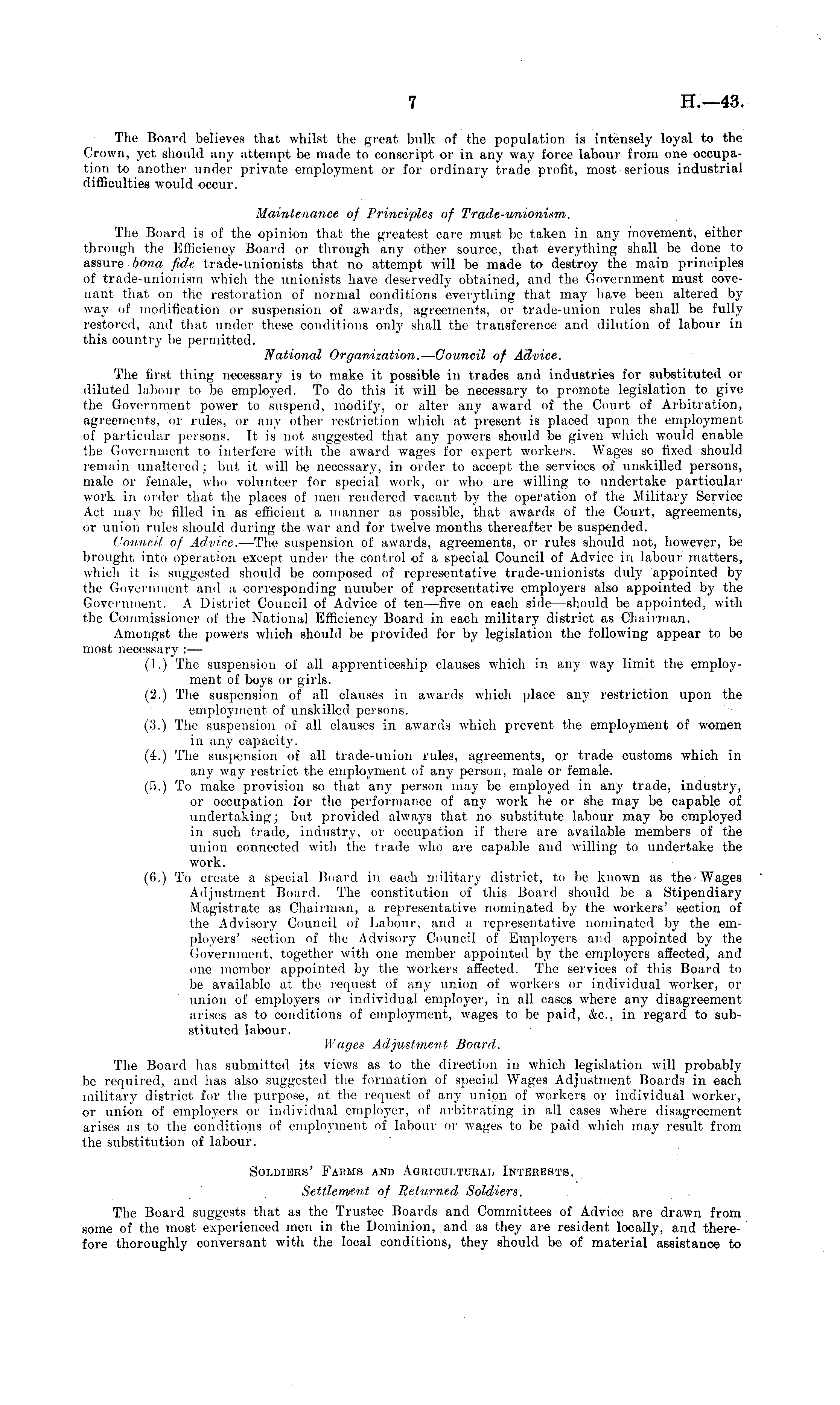 The Board believes that whilst the great bulk of the population is intensely loyal to the Crown, yet should any attempt be made to conscript or in any way force labour from one occupation to another under private employment or for ordinary trade profit, most serious industrial difficulties would occur. Maintenance of Principles of Trade-unionism. The Board is of the opinion that the greatest care must be taken in any movement, either through the Efficiency Board or through any other source, that everything shall be done to assure bona fide trade-unionists that no attempt will be made to destroy the main principles of trade-unionism which the unionists have deservedly obtained, and the Government must covenant that on the restoration of normal conditions everything that may have been altered by way of modification or suspension of awards, agreements, or trade-union rules shall be fully restored, and that under these conditions only shall the transference and dilution of labour in this country be permitted. National Organization. — Council of Advice. The first thing necessary is to make it possible in trades and industries for substituted or diluted labour to be employed. To do this it will be necessary to promote legislation to give the Government power to suspend, modify, or alter any award of the Court of Arbitration, agreements, or rules, or any other restriction which at present is placed upon the employment of particular persons. It is not suggested that any powers should be given which would enable the Government to interfere with the award wages for expert workers. Wages so fixed should remain unaltered; but it will be necessary, in order to accept the services of unskilled persons, male or female, who volunteer for special work, or who are willing to undertake particular work in order that the places of men rendered vacant by the operation of the Military Service Act may be filled in as efficient a manner as possible, that awards of the Court, agreements, or union rules should during the war and for twelve months thereafter be suspended. Council of Advice. —The suspension of awards, agreements, or rules should not, however, be brought into operation except under the control of a special Council of Advice in labour matters, which it is suggested should be composed of representative trade-unionists duly appointed by the Government and a corresponding number of representative employers also appointed by the Government. A District Council of Advice of ten —five on each side —should be appointed, with the Commissioner of the National Efficiency Board in each military district as Chairman. Amongst the powers which should be provided for by legislation the following appear to be most necessary : — (1.) The suspension of all apprenticeship clauses which in any way limit the employment of boys or girls. (2.) The suspension of all clauses in awards which place any restriction upon the employment of unskilled persons. (3.) The suspension of all clauses in awards which prevent the employment of women in any capacity. (4.) The suspension of all trade-union rules, agreements, or trade customs which in any way restrict the employment of any person, male or female. (5.) To make provision so that any person may be employed in any trade, industry, or occupation for the performance of any work he or she may be capable of undertaking; but provided always that no substitute labour may be employed in such trade, industry, or occupation if there are available members of the union connected with the trade who are capable and willing to undertake the work. (6.) To create a special Board in each military district, to be known as the Wages Adjustment Board. The constitution of this Board should be a Stipendiary Magistrate as Chairman, a representative nominated by the workers' section of the Advisory Council of Labour, and a representative nominated by the employers' section of the Advisory Council of Employers and appointed by the Government, together with one member appointed by the employers affected, and one member appointed by the workers affected. The services of this Board to be available at the request of any union of workers or individual worker, or union of employers or individual employer, in all cases where any disagreement arises as to conditions of employment, wages to be paid, &0., in regard to substituted labour. Wages Adjustment Board. The Board has submitted its views as to the direction in which legislation will probably be required, and has also suggested the formation of special Wages Adjustment Boards in each military district for the purpose, at the request of any union of workers or individual worker, oi- union of employers or individual employer, of arbitrating in all cases where disagreement arises as to the conditions of employment of labour or wages to be paid which may result from the substitution of labour. Soldiers' Fahms and Agricultural Interests, Settlement of Returned Soldiers. The Board suggests that as the Trustee Boards and Committees of Advice are drawn from some of the most experienced men in the Dominion, and as they are resident locally, and therefore thoroughly conversant with the local conditions, they should be of material assistance to
