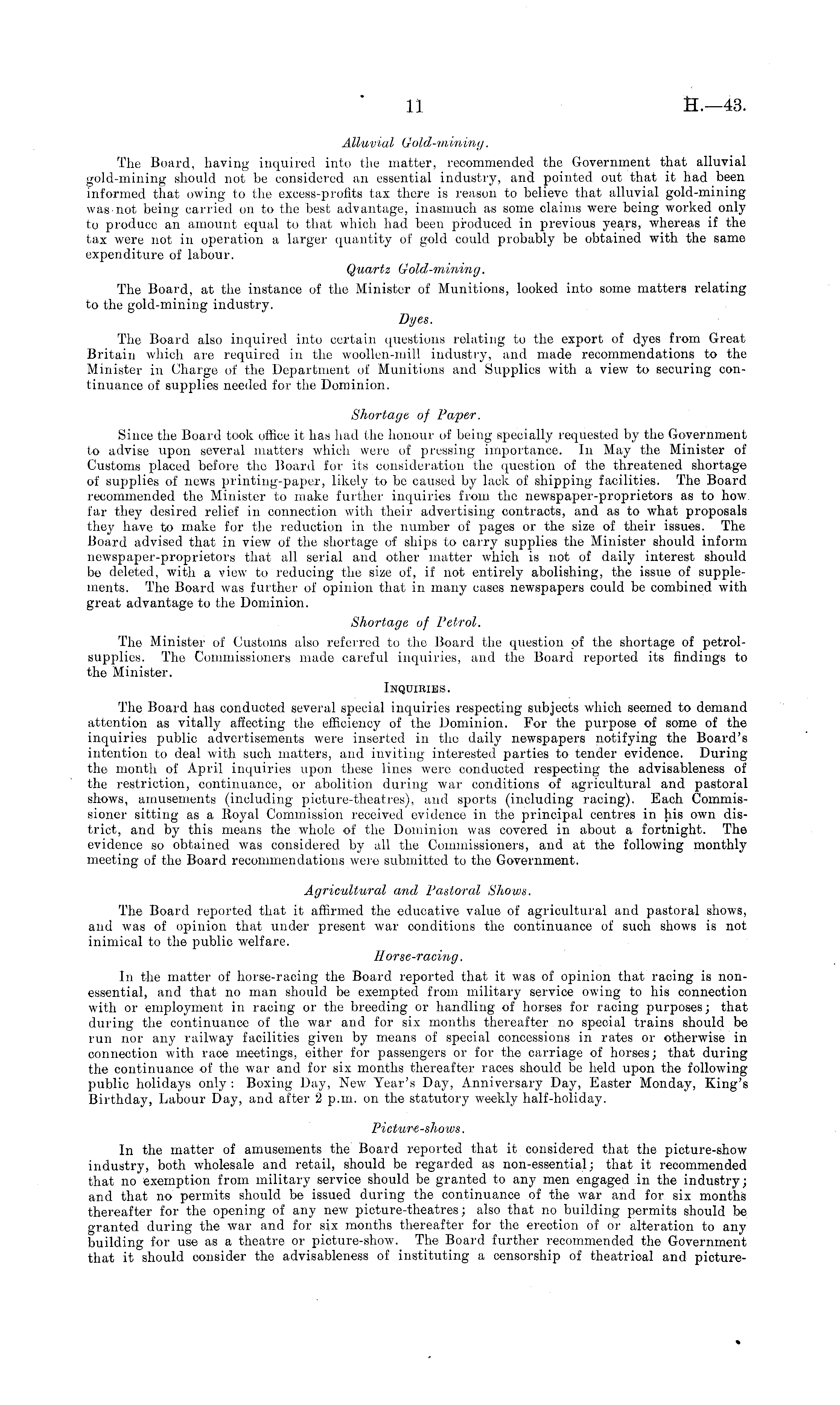 Alluvial Gold-mining. The Board, having inquired into the matter, recommended the Government that alluvial gold-mining should not be considered an essential industry, and pointed out that it had been informed that owing to the excess-profits tax there is reason to believe that alluvial gold-mining was not being carried on to the best advantage, inasmuch as some claims were being worked only to produce an amount equal to that which had been produced in previous years, whereas if the tax were not in operation a larger quantity of gold could probably be obtained with the same expenditure of labour. Quartz Gold-mining. The Board, at the instance of the Minister of Munitions, looked into some matters relating to the gold-mining industry. Dyes. The Board also inquired into certain questions relating to the export of dyes from Great Britain which are required in the woollen-mill industry, and made recommendations to the Minister in Charge of the Department of Munitions and Supplies with a view to securing continuance of supplies needed for the Dominion. Shortage of Paper. Since the Board took office it has had the honour of being specially requested by the Government to advise upon several matters which were of pressing importance. In May the Minister of Customs placed before the Board for its consideration the question of the threatened shortage of supplies of news printing-paper, likely to be caused by lack of shipping facilities. The Board recommended the Minister to make further inquiries from the newspaper-proprietors as to how. far they desired relief in connection with their advertising contracts, and as to what proposals they have to make for the reduction in the number of pages or the size of their issues. The Board advised that in view of the shortage of ships to carry supplies tho Minister should inform newspaper-proprietors that all serial and other matter which is not of daily interest should be deleted, with a view to reducing the size of, if not entirely abolishing, the issue of supplements. Tho Board was further of opinion that in many cases newspapers could be combined with great advantage to the Dominion. Shortage of Petrol. The Minister of Customs also referred to the Board the question of the shortage of petrolsupplies. The Commissioners made careful inquiries, and the Board reported its findings to the Minister. Inquiries. The Board has conducted several special inquiries respecting subjects which seemed to demand attention as vitally affecting the efficiency of the Dominion. For the purpose of some of the inquiries public advertisements were inserted in the daily newspapers notifying the Board's intention to deal with such matters, and inviting interested parties to tender evidence. During the month of April inquiries upon these lines were conducted respecting the advisableness of the restriction, continuance, or abolition during war conditions of agricultural and pastoral shows, amusements (including picture-theatres), and sports (including racing). Each Commissioner sitting as a Royal Commission received evidence in the principal centres in his own district, and by this means the whole of the Dominion was covered in about a fortnight. The evidence so obtained was considered by all the Commissioners, and at the following monthly meeting of the Board recommendations were submitted to the Government. Agricultural and Pastoral Shows. The Board reported that it affirmed the educative value of agricultural and pastoral shows, and was of opinion that under present war conditions the continuance of such shows is not inimical to the public welfare. Horse-racing. In the matter of horse-racing the Board reported that it was of opinion that racing is nonessential, and that no man should be exempted from military service owing to his connection with or employment in racing or the breeding or handling of horses for racing purposes; that during the continuance of the war and for six months thereafter no special trains should be run nor any railway facilities given by means of special concessions in rates or otherwise in connection with race meetings, either for passengers or for tho carriage of horses; that during the continuance of the war and for six months thereafter races should be held upon the followingpublic holidays only : Boxing Day, New Year's Day, Anniversary Day, Easter Monday, King's Birthday, Labour Day, and after 2 p.m. on the statutory weekly half-holiday. Picture-shows. In the matter of amusements the Board reported that it considered that the picture-show industry, both wholesale and retail, should be regarded as non-essential; that it recommended that no exemption from military service should be granted to any men engaged in the industry; and that no permits should be issued during the continuance of the war and for six months thereafter for the opening of any new picture-theatres; also that no building permits should be granted during the war and for six months thereafter for the erection of or alteration to any building for use as a theatre or picture-show. The Board further recommended the Government that it should consider the advisableness of instituting a censorship of theatrical and picture-