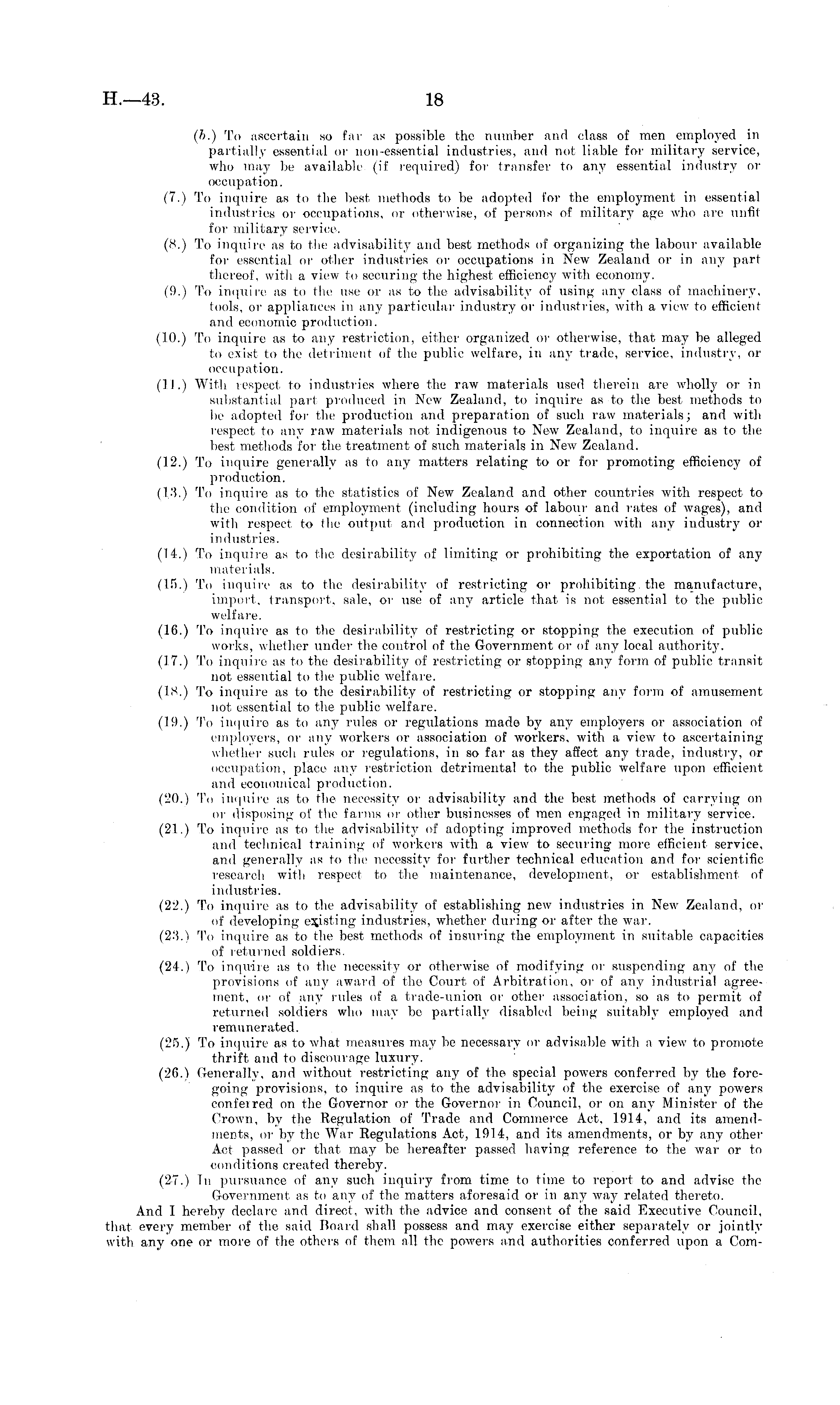 (b.) To ascertain so far as possible the number and class of men employed in partially essential or non-essential industries, and not liable for military service, who may be available (if required) for transfer to any essential industry or occupation. (7.) To inquire as to the best methods to be adopted for the employment in essential industries or occupations, or otherwise, of persons of military age who arc unfit for military service. (8.) To inquire as to (he advisability and best methods of organizing the labour available for essential or other industries or occupations in New Zealand or in any pari thereof, with a view to securing the highest efficiency with economy. (9.) To inquire as to (he use or as to the advisability of using any class of machinery, tools, or appliances in any particular industry or industries, with a view to efficient and economic production. (10.) To inquire as to any restriction, either organized or otherwise, that may be alleged to exist to the detriment of the public welfare, in any trade, service, industry, or occupation. (11.) With respect to industries where the raw materials used therein are wholly or in substantial part produced in New Zealand, to inquire as to the best methods to be adopted for the production and preparation of such raw materials; and with respect to any raw materials not indigenous to New Zealand, to inquire as to the best methods for the treatment of such materials in New Zealand. (12.) To inquire generally as to any matters relating to or for promoting efficiency of production. (13.) To inquire as to the statistics of New Zealand and other countries with respect to the condition of employment (including hours of labour and rates of wages), and with respect to the output and production in connection with any industry or industries. (14.) To inquire as to the desirability of limiting or prohibiting the exportation of any materials. (15.) To inquire as to the desirability of restricting or prohibiting the manufacture, import, transport, sale, or use of any article that is not essential to the public welfare. (16.) To inquire as to the desirability of restricting or stopping the execution of public works, whether under the control of the Government or of any local authority. (17.) To inquire as to the desirability of restricting or stopping any form of public transit not. essential to the public welfare. (18.) To inquire as to the desirability of restricting or stopping any form of amusement not essential to the public welfare. (19.) To inquire as to any rules or regulations made by any employers or association of employers, or any workers or association of workers, with a view to ascertaining whether such rules or regulations, in so far as they affect any trade, industry, or occupation, place any restriction detrimental to the public welfare upon efficient and economical production. (20.) To inquire as to the necessity or advisability and the best methods of carrying on or disposing of the farms or other businesses of men engaged in military service. (21.) To inquire as to the advisability of adopting improved methods for the instruction and technical training of workers with a view to securing more efficient service, and generally as to the necessity for further technical education and for scientific research with respect to the maintenance, development, or establishment of industries. (22.) To inquire as to the advisability of establishing new industries in New Zealand, or of developing existing industries, whether during or after the war. (23.) To inquire as to the best methods of insuring the employment in suitable capacities of returned soldiers. (24.) To inquire as to the necessity or otherwise of modifying or suspending any of the provisions of any award of the Court of Arbitration, or of any industrial agreement, or of any rules of a trade-union or other association, so as to permit of returned soldiers who may be partially disabled being suitably employed and remunerated. (25.) To inquire as to what measures may be necessary or advisable with a view to promote thrift and to discourage luxury. (26.) Generally, and without restricting any of tho special powers conferred by the foregoing provisions, to inquire as to the advisability of the exercise of any powers conferred on the Governor or the Governor in Council, or on any Minister of the Crown, by the Regulation of Trade and Commerce Act, 1914, and its amendments, or by the War Regulations Act, 1914, and its amendments, or by any other Act passed or that may be hereafter passed having reference to the war or to conditions created thereby. (27.) In pursuance of any such inquiry from time to time to report to and advise the Government, as to any of the matters aforesaid or in any way related thereto. And I hereby declare and direct, with the advice and consent of the said Executive Council, that every member of the said Board shall possess and may exercise either separately or jointly with any one or more of the others of them all the powers and authorities conferred upon a Com-